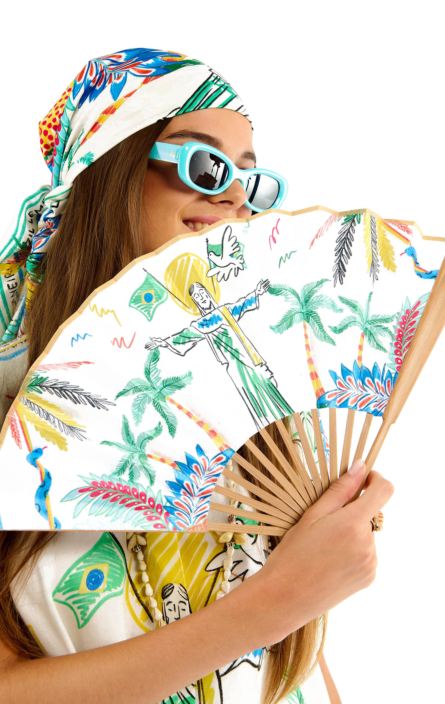 Now the trendy accessory to slip into your festival, beach or evening bag, the fan is adorned with this season's iconic prints.