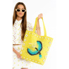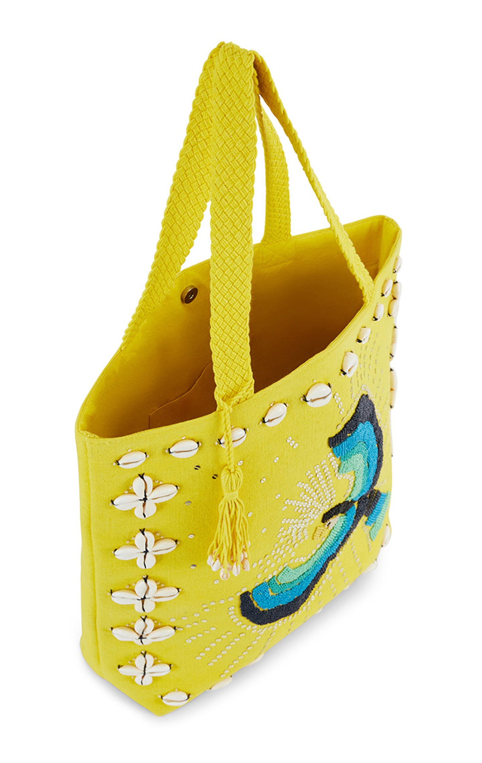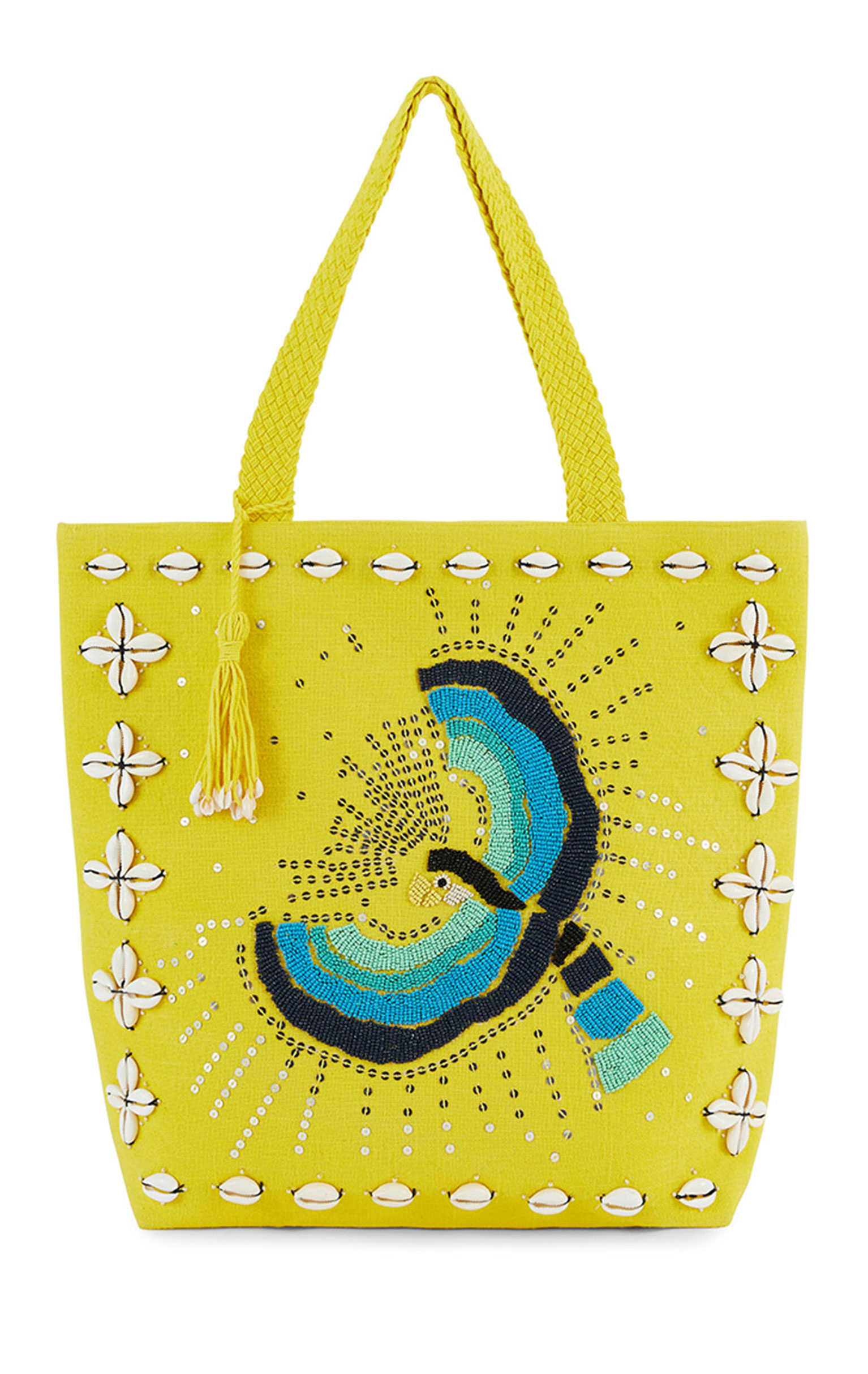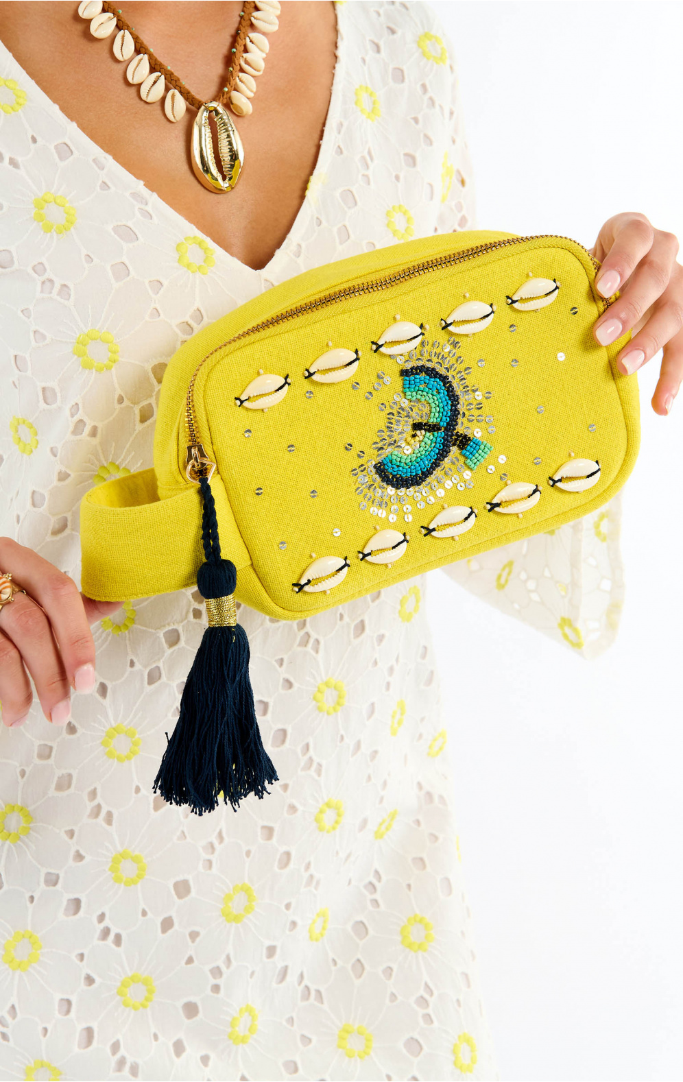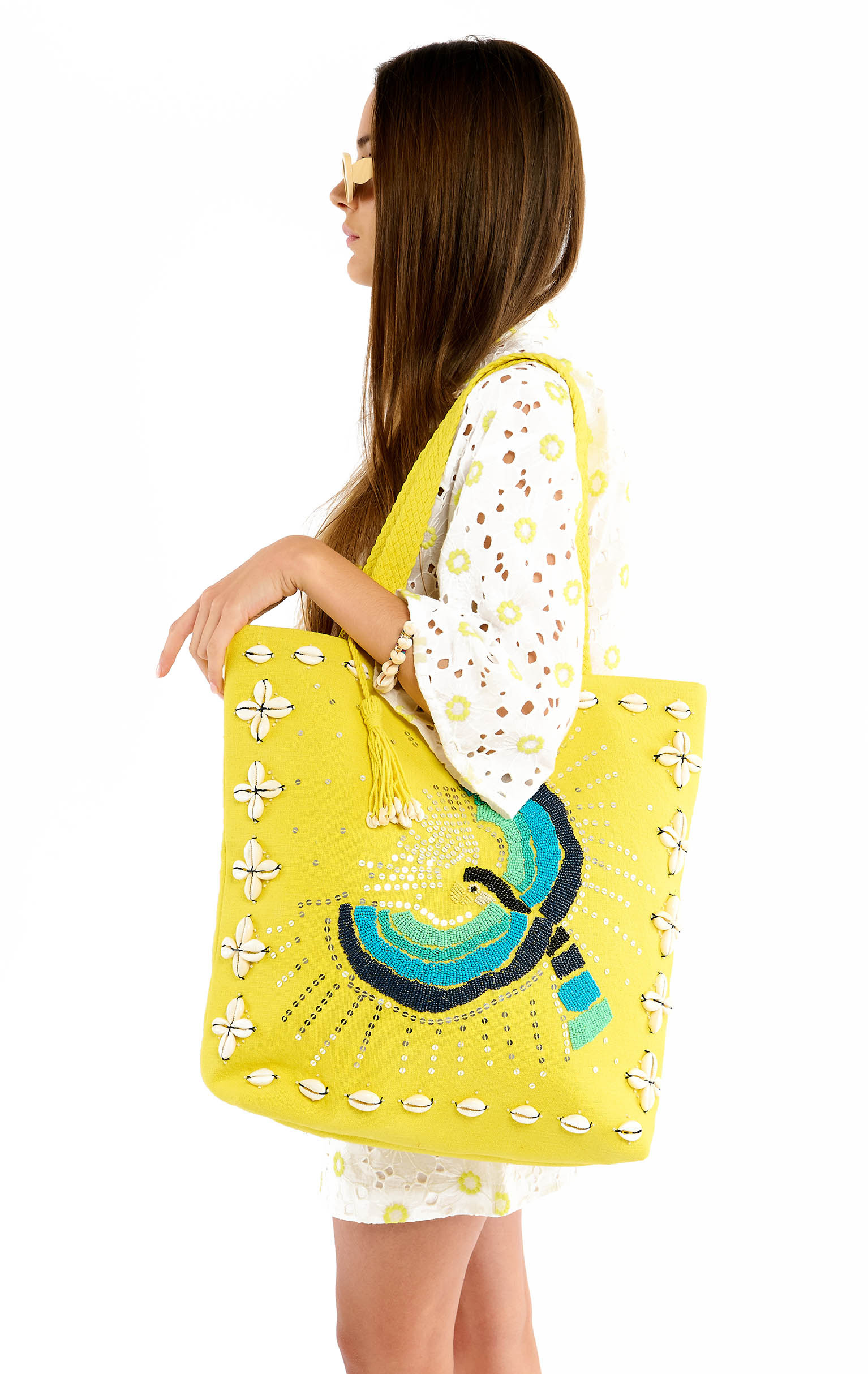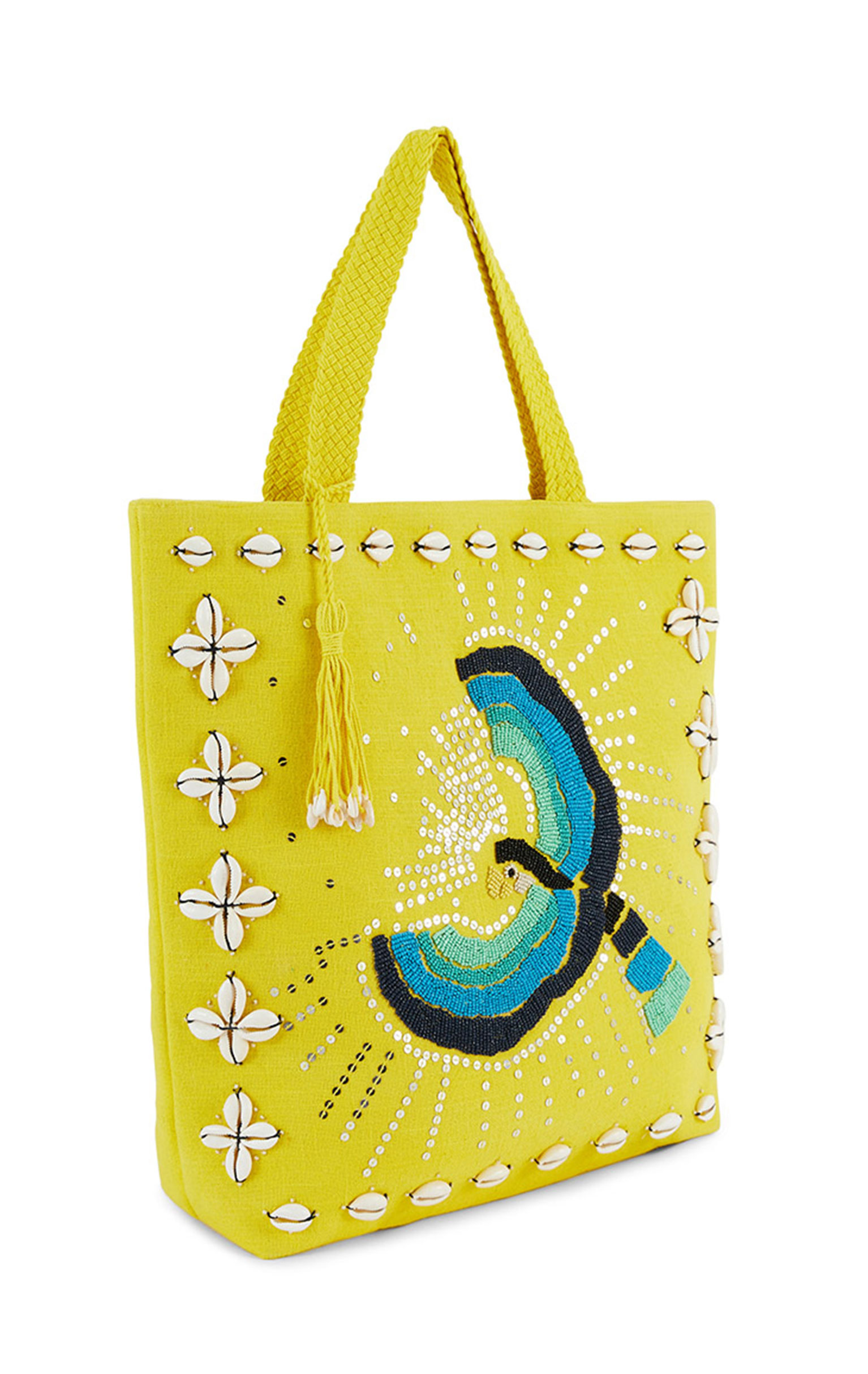 On a structured canvas fabric, the rectangular IRWIN bag features a sumptuous multicolored parrot entirely hand-embroidered with seed beads, sublimated by an outline of embroidered cowries. IRWIN features a wide, beautifully braided handle for comfortable carrying. Available in three colors, it is shown here in its lemon yellow version.