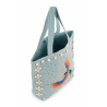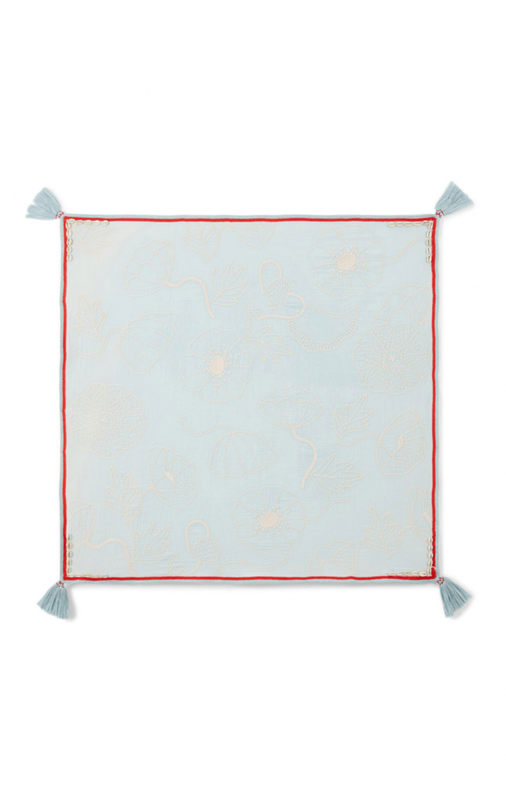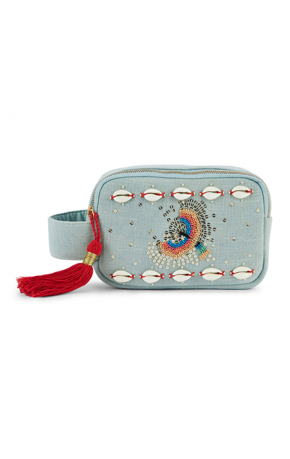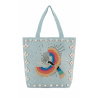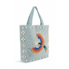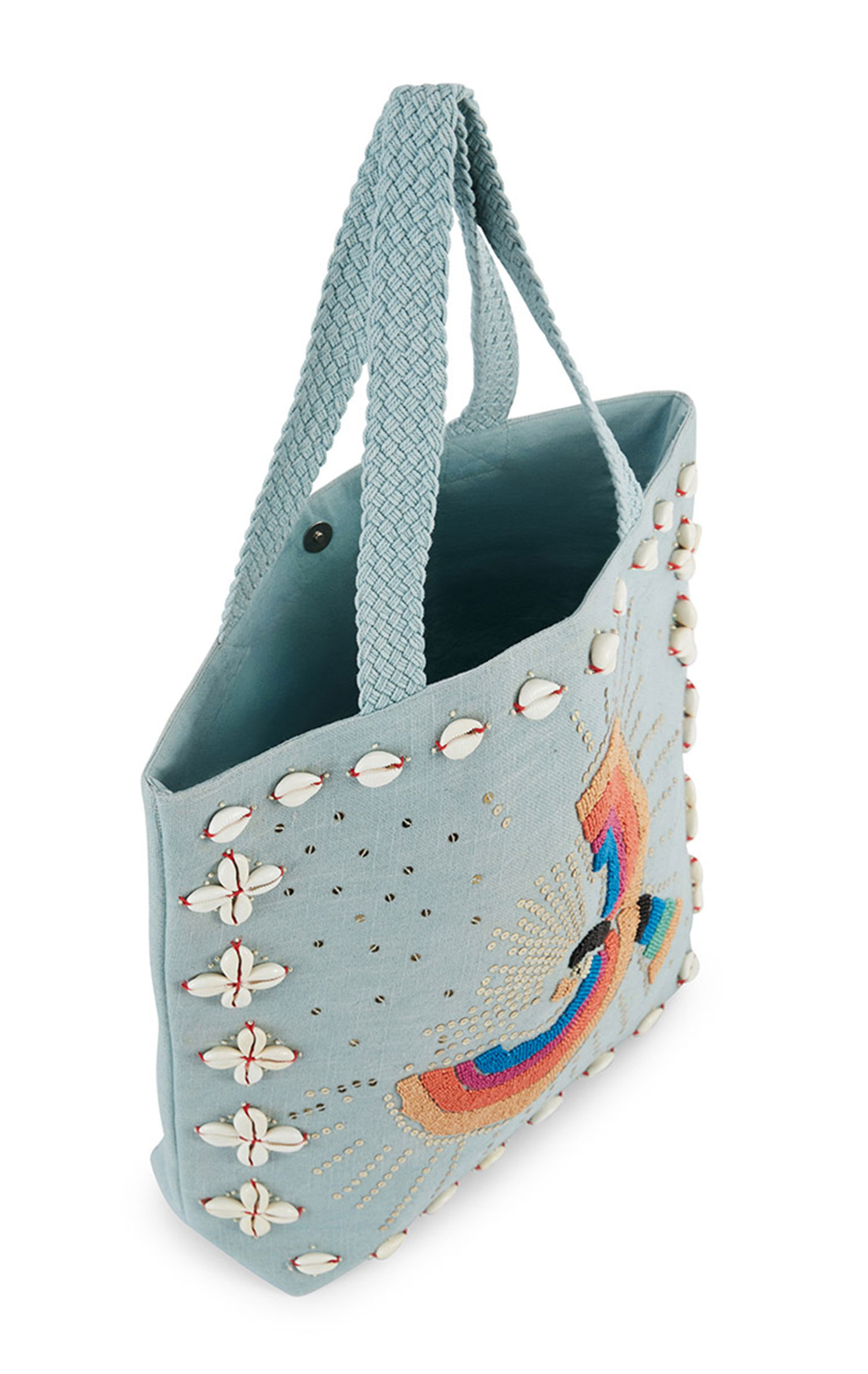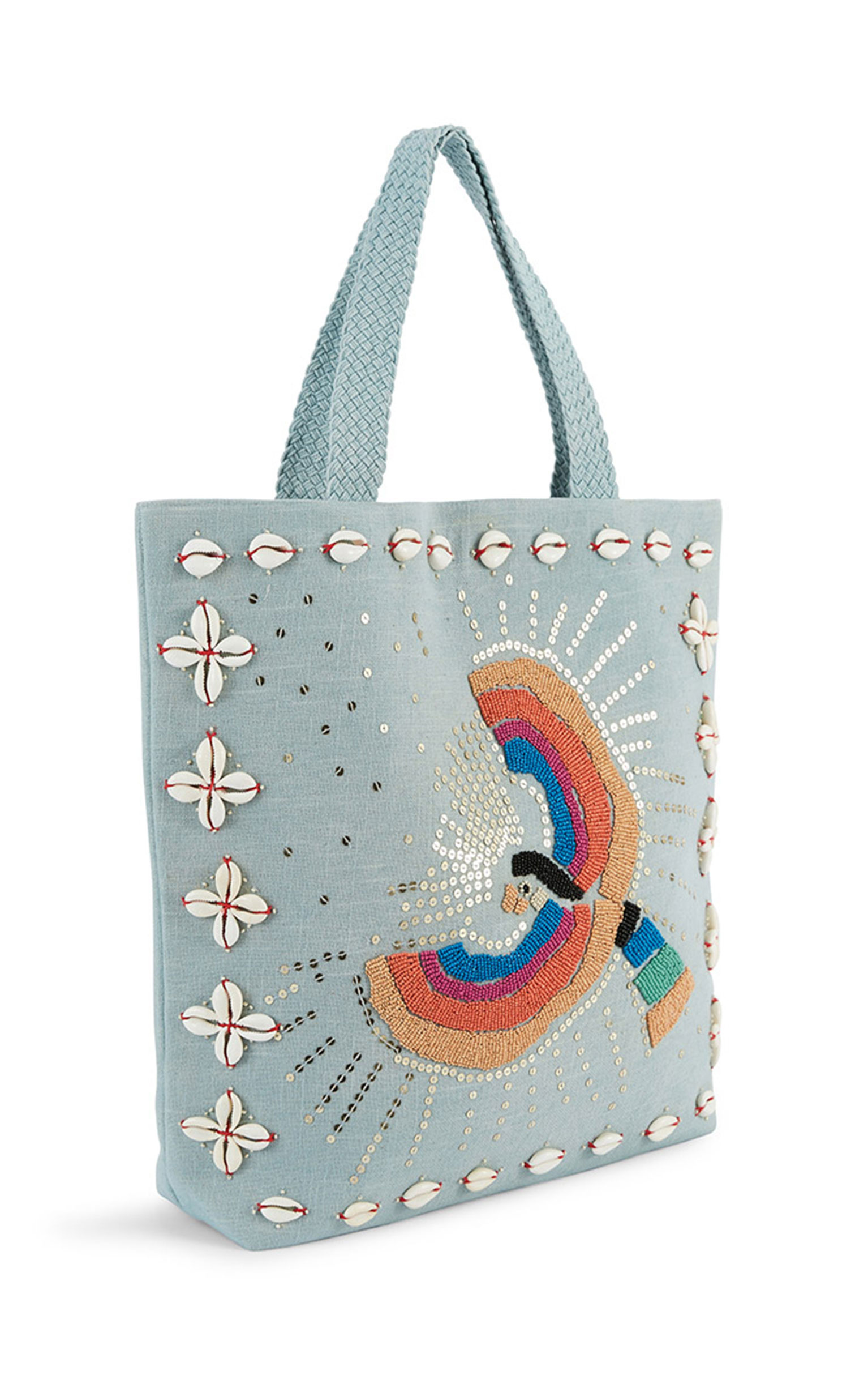 On a structured canvas fabric, the rectangular IRWIN bag features a sumptuous multicolored parrot entirely hand-embroidered with seed beads, sublimated by an outline of embroidered cowries. IRWIN features a wide, beautifully braided handle for comfortable carrying. Available in three colors, it is shown here in its charron blue version.