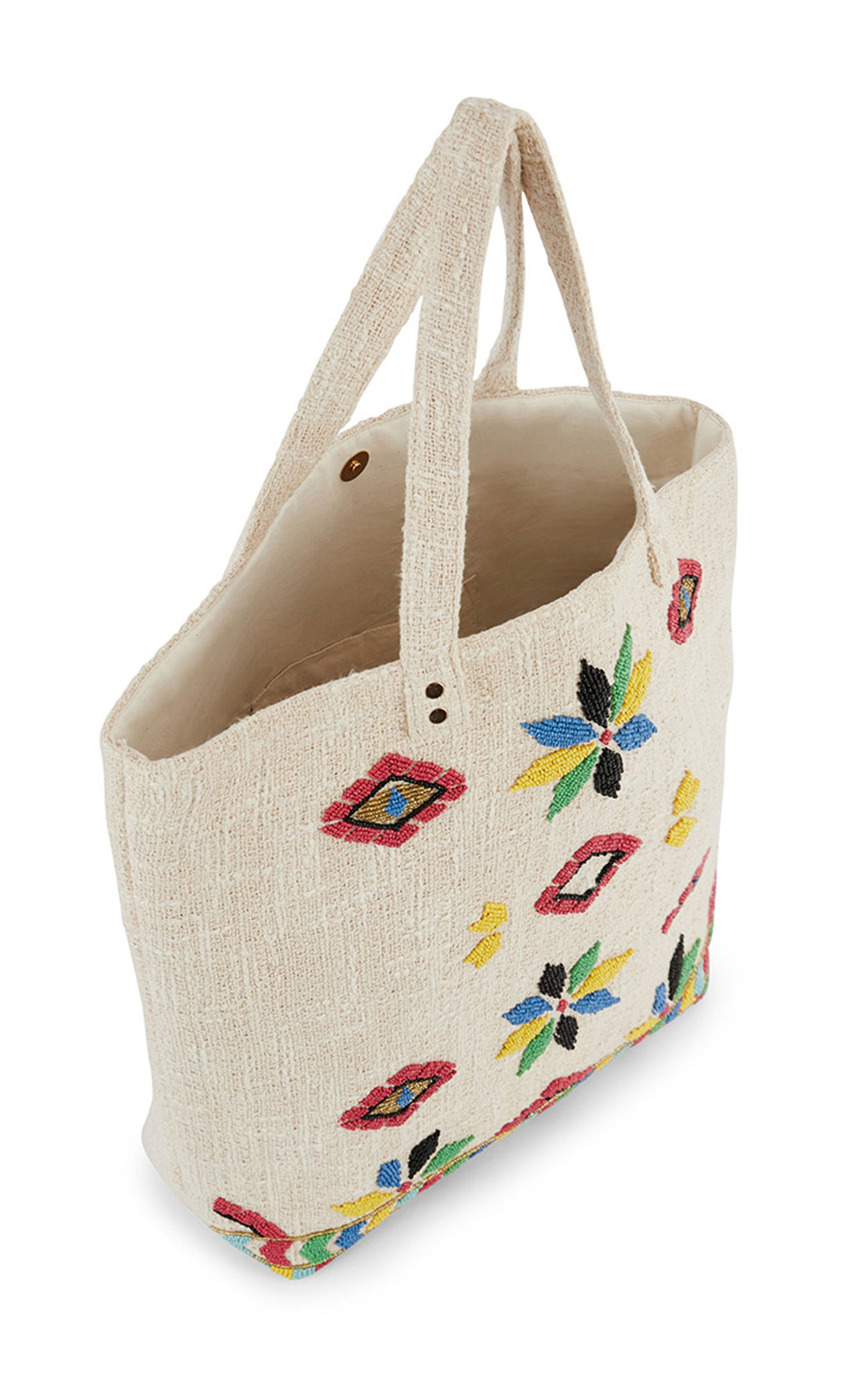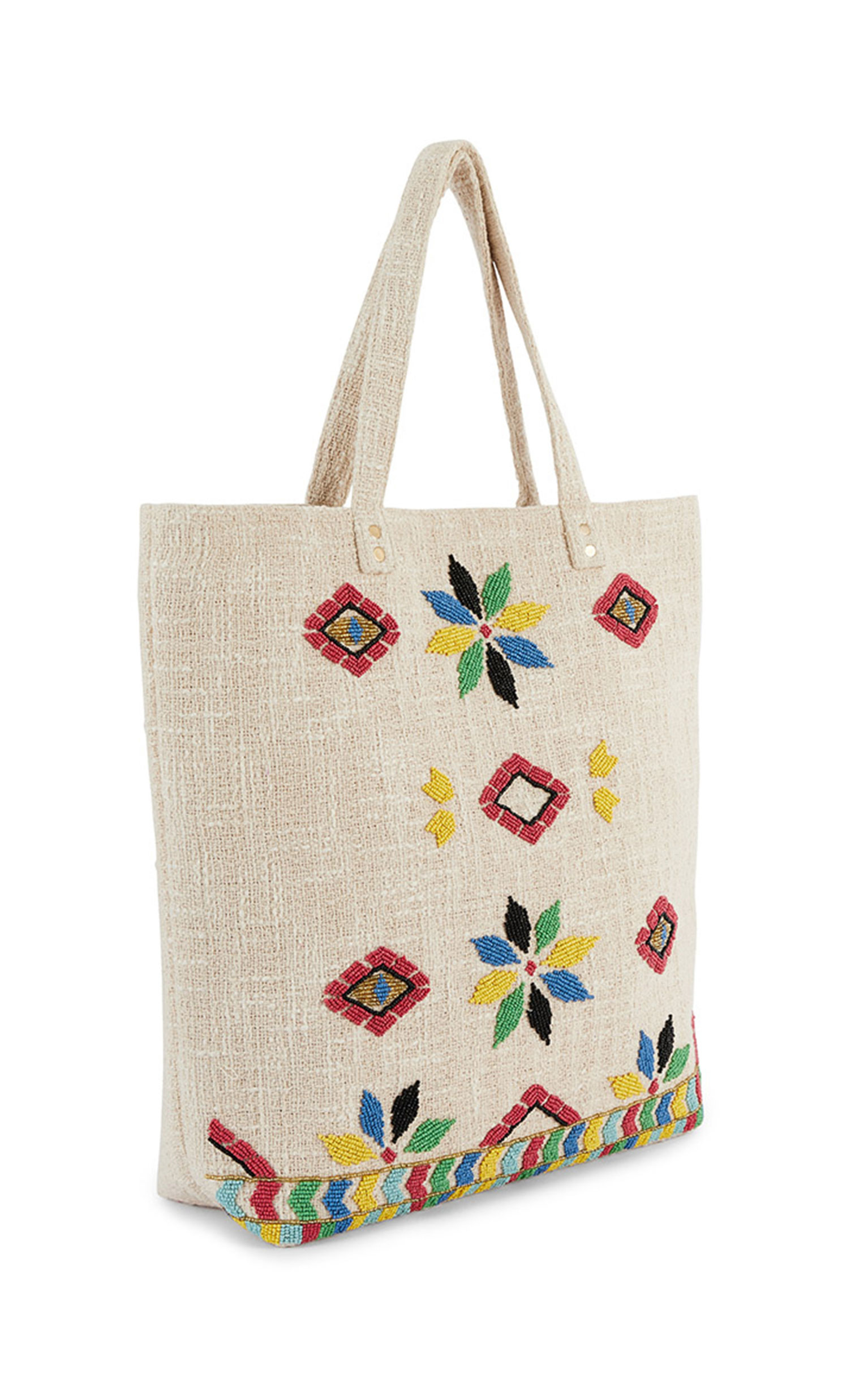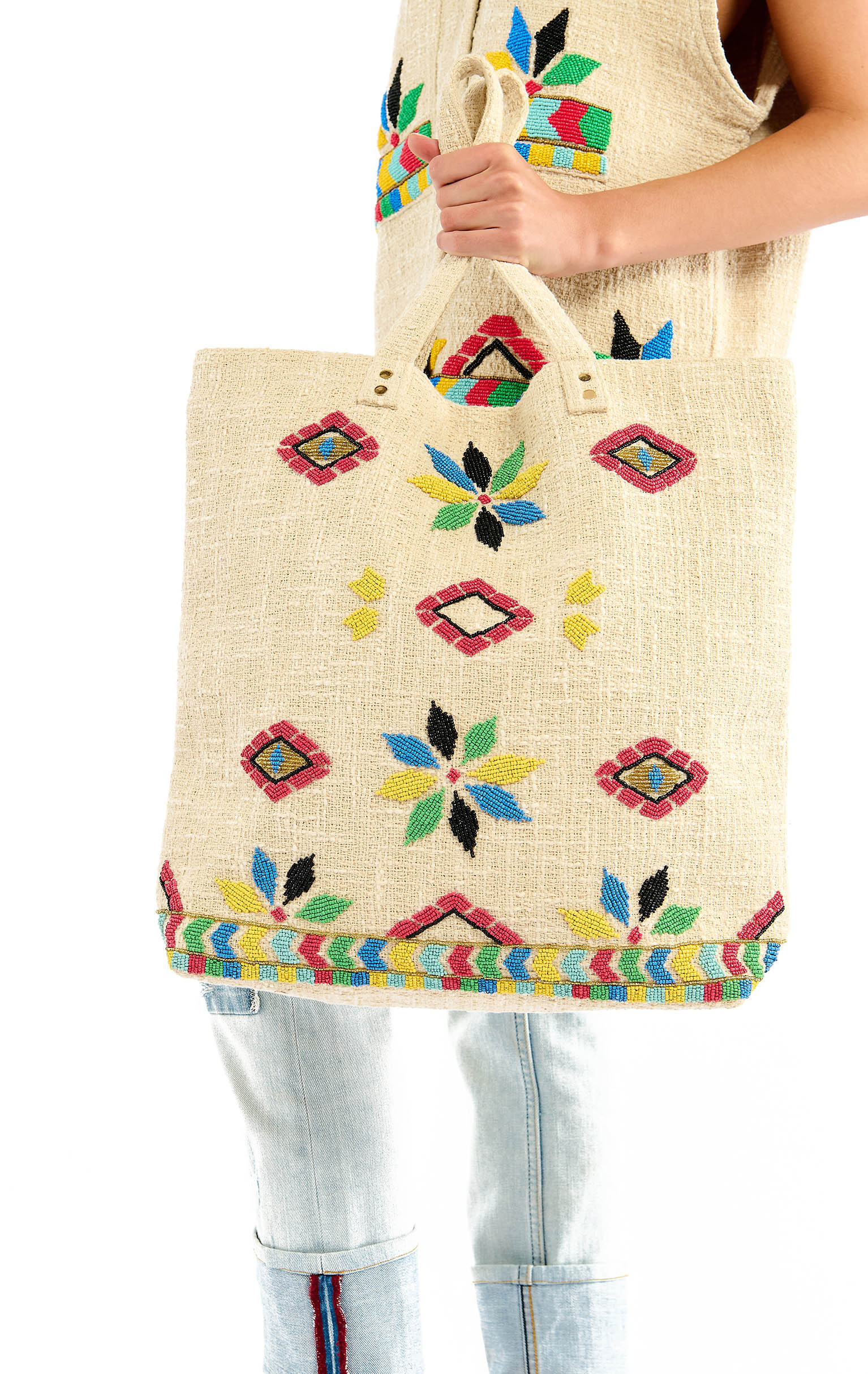 Matching the FAIZAL and EZEKIEL jackets, the LYNDIRA tote bag plays on the same mix of tribal inspiration and color work, in a Mondrian spirit.