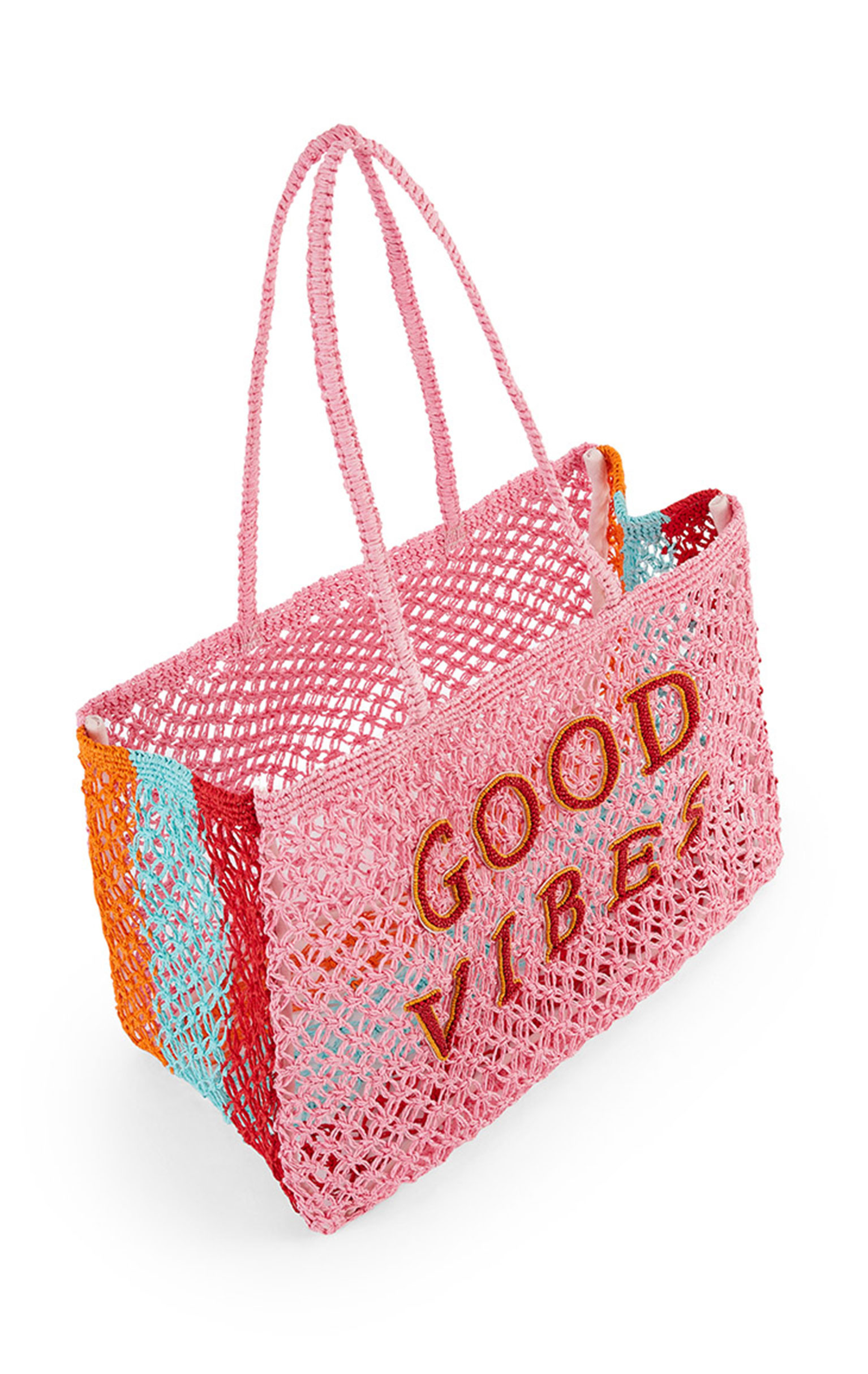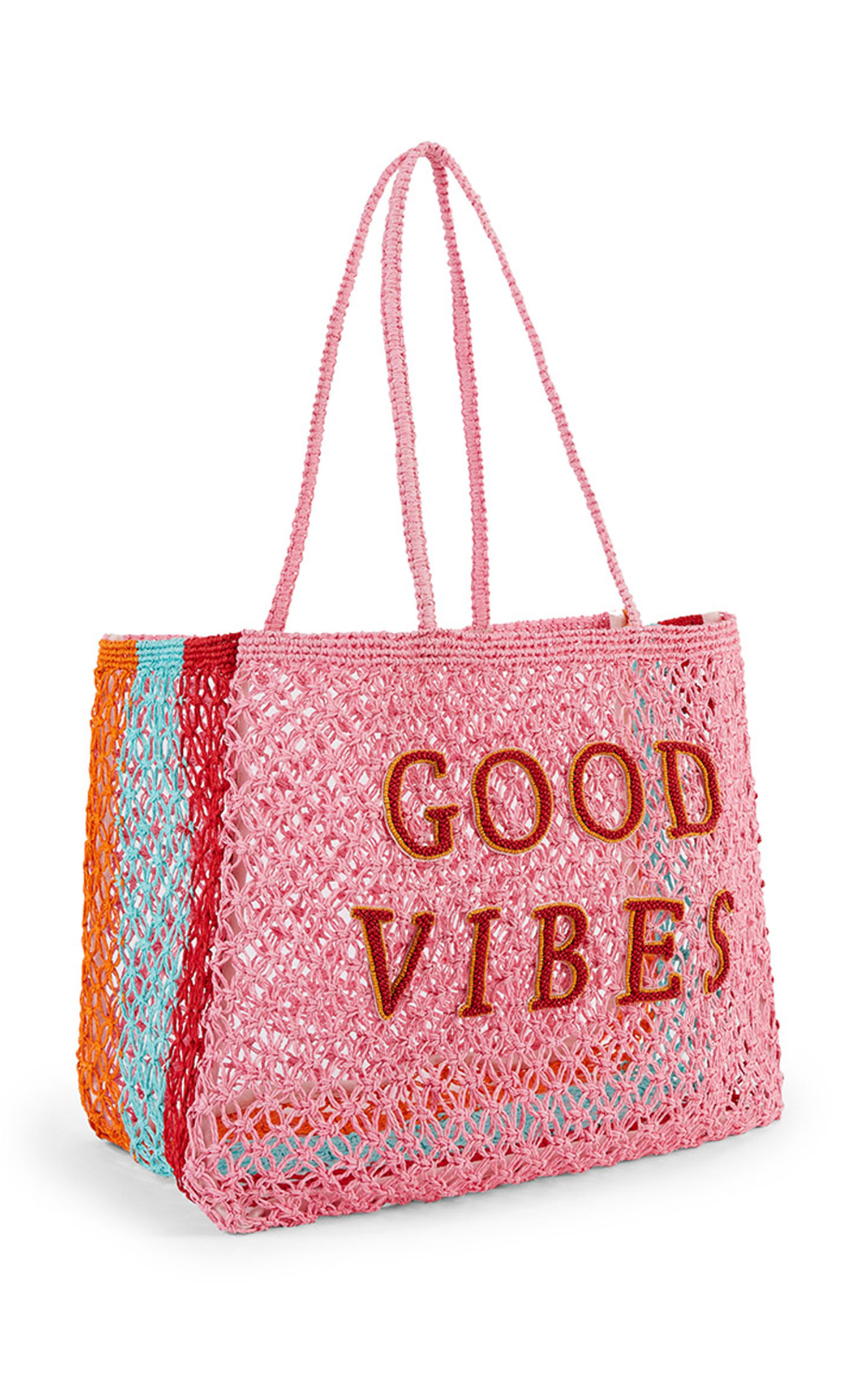 In a very seventies aesthetic, our ULYSS bag is available in six colors, each with a plain front and tricolored sides. Shown here in pink with red lettering.