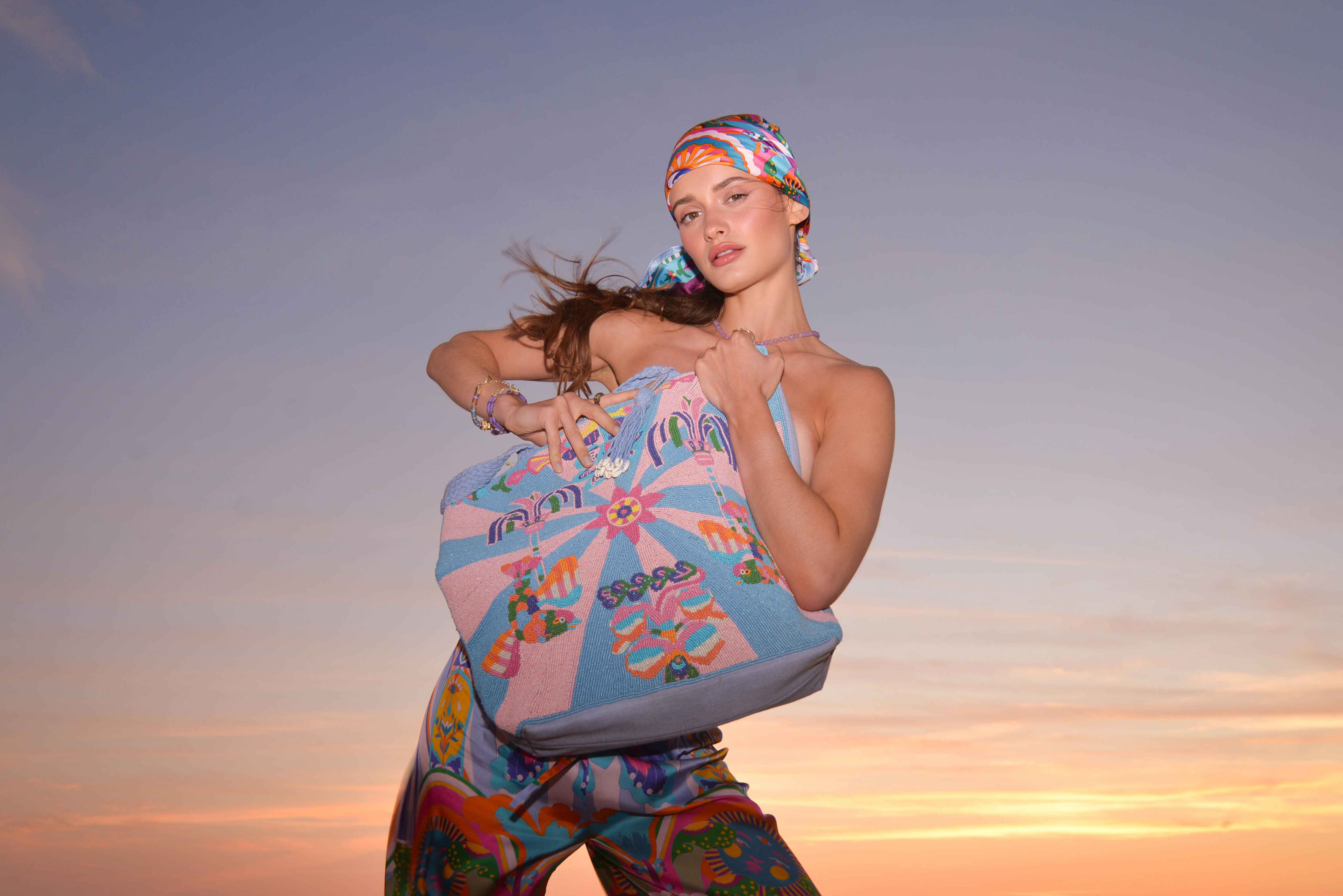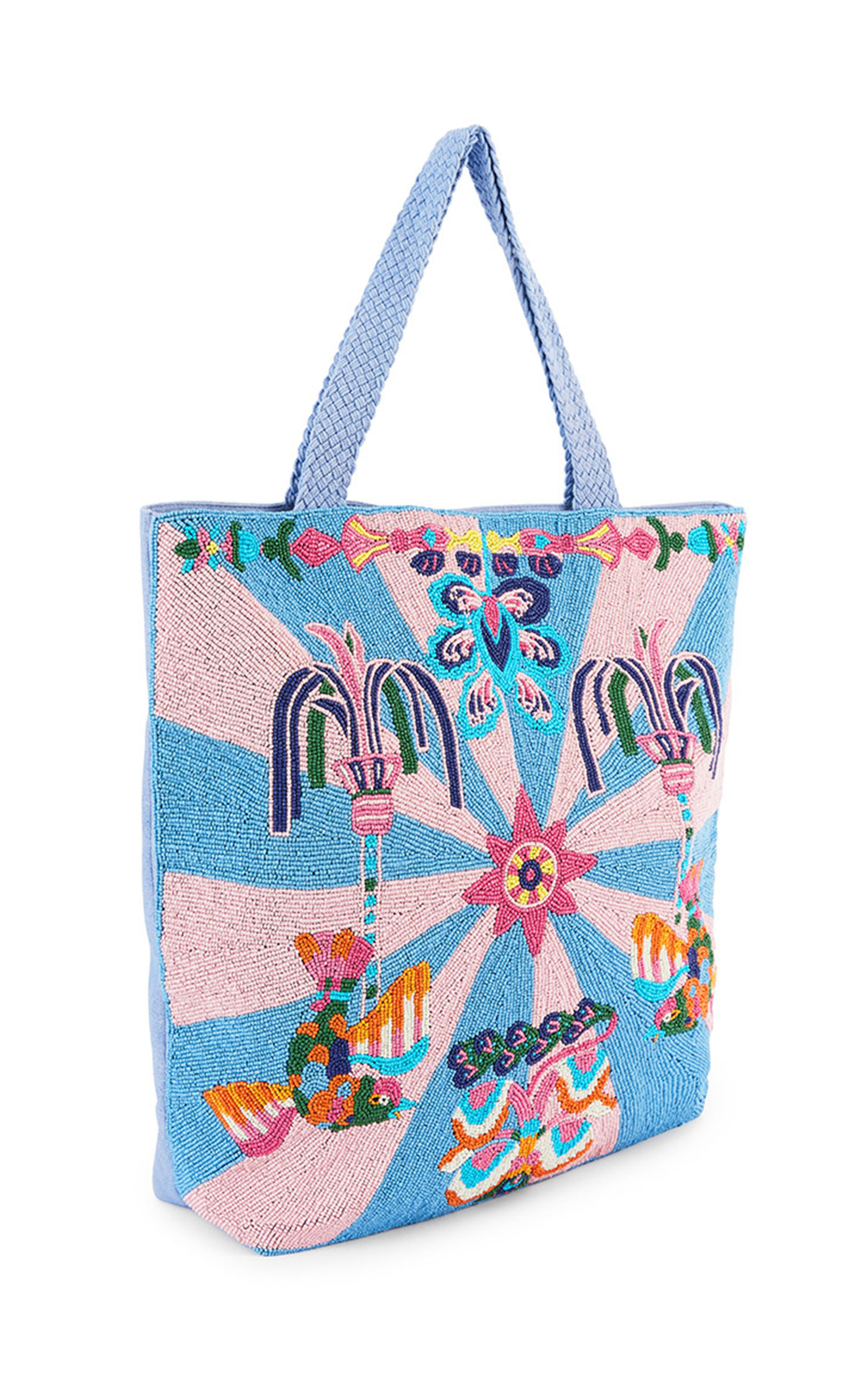 In a magnificent cameo of blues, pinks and purples, VOLCANO, a precious tote entirely embroidered with pearls, perfectly combines the iconic elements of our ENCHANTERED print.