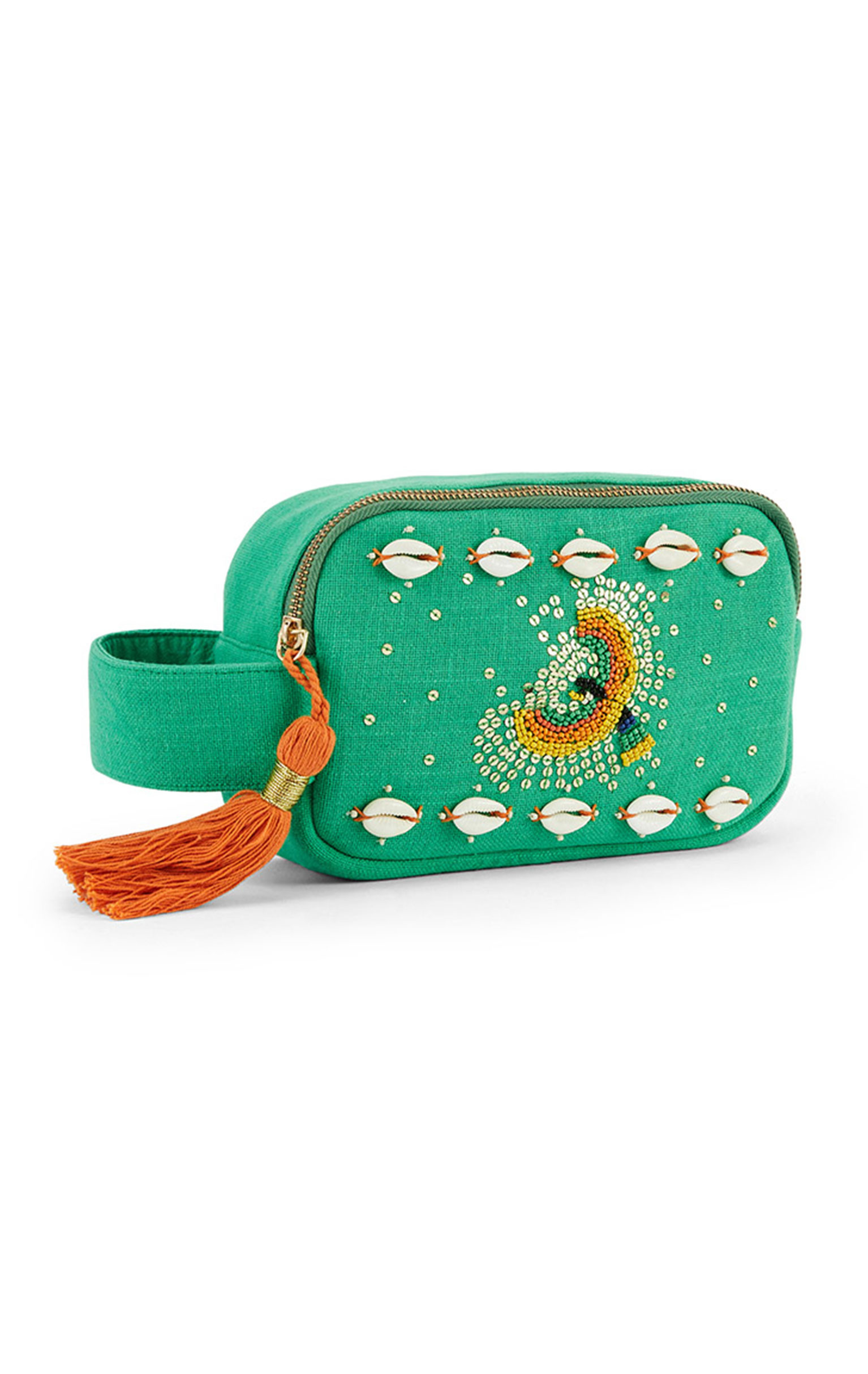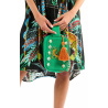 Available in three colors, YSIA, like IRWIN, features a majestic bird entirely embroidered with pearls and sublimated by two lines of cowries. Crafted in structured cotton, the bird, in shades of orange, coral, yellow and indigo, is displayed here on a luminous green background, contrasted by a flamboyant orange pompom.