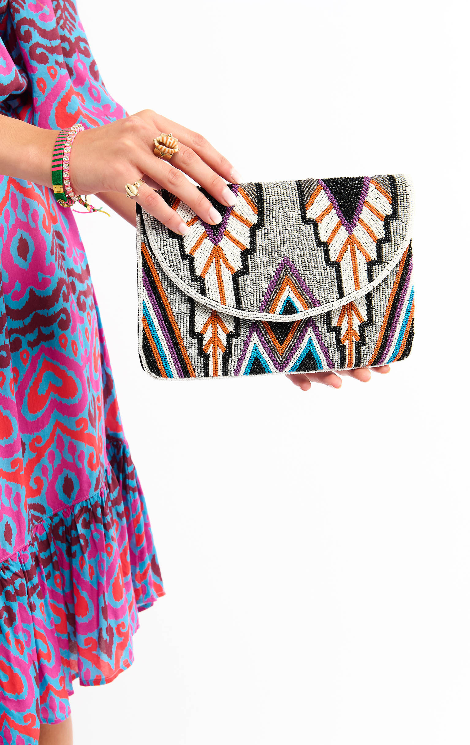 Elaborated in a unique mix of tribal and art deco revisited motifs, the ALDRIC clutch accessorizes our summer with the colorful chic we love at Wild.