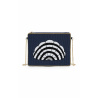 Zipped at the top and accessorized with a side handle, DIENA is a precious clutch featuring a plain background entirely embroidered with pearls, framed by a line of golden pearls and sublimated by a large, highly graphic shell structured with contrasting lines. Available in four colors, DIENA is here in its blue version, with a dark blue pearled background and a shell with black and white lines.