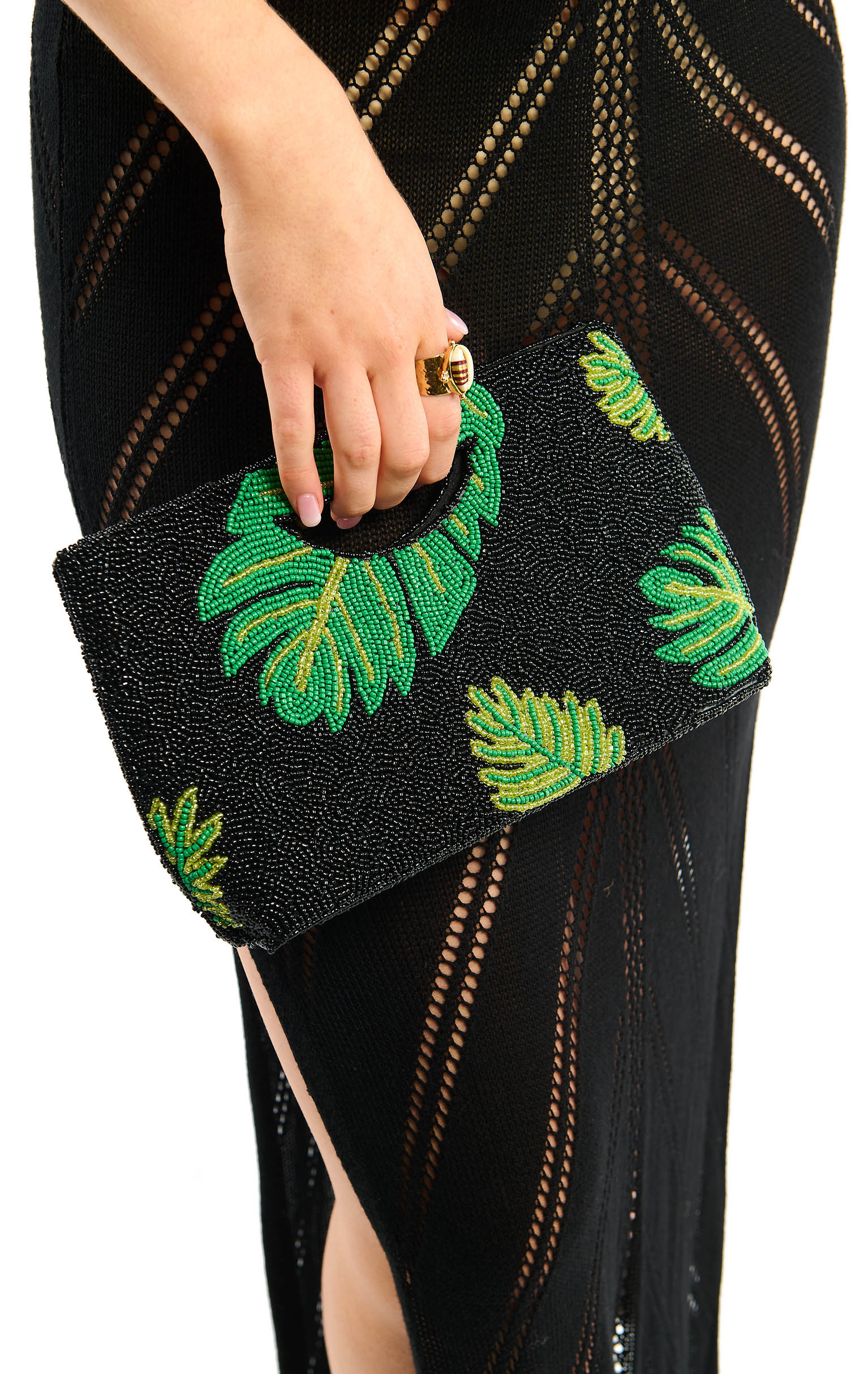 Rigid and hand-embroidered, the LETI clutch bag seduces with its cut-out handle into which the hand slips with style.