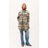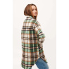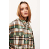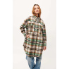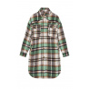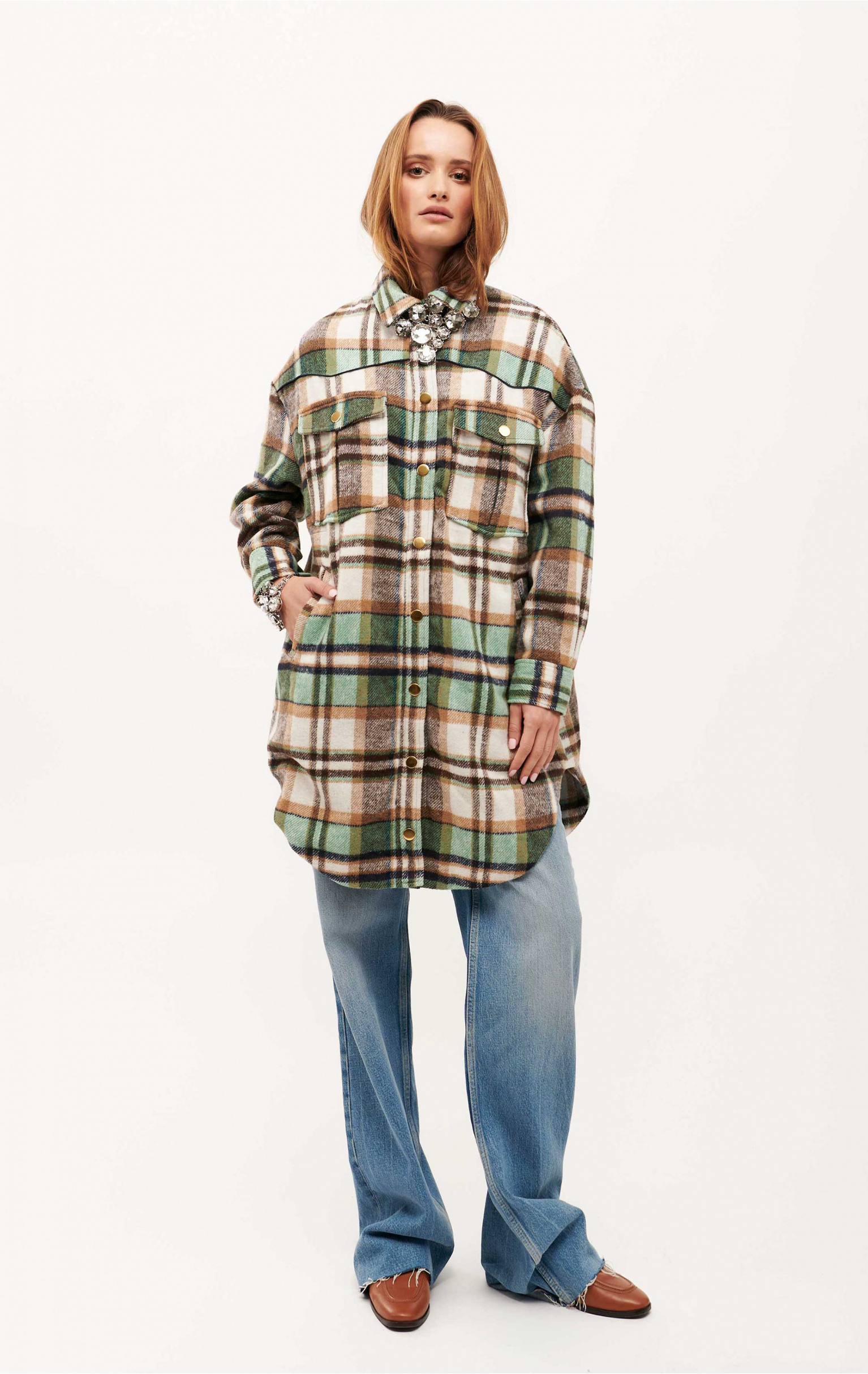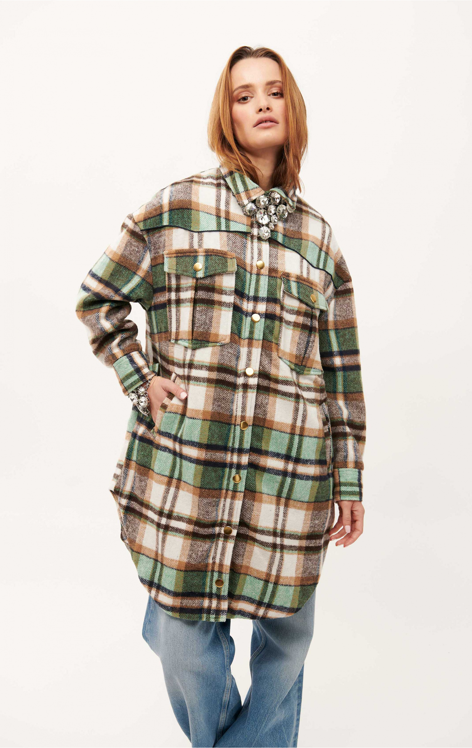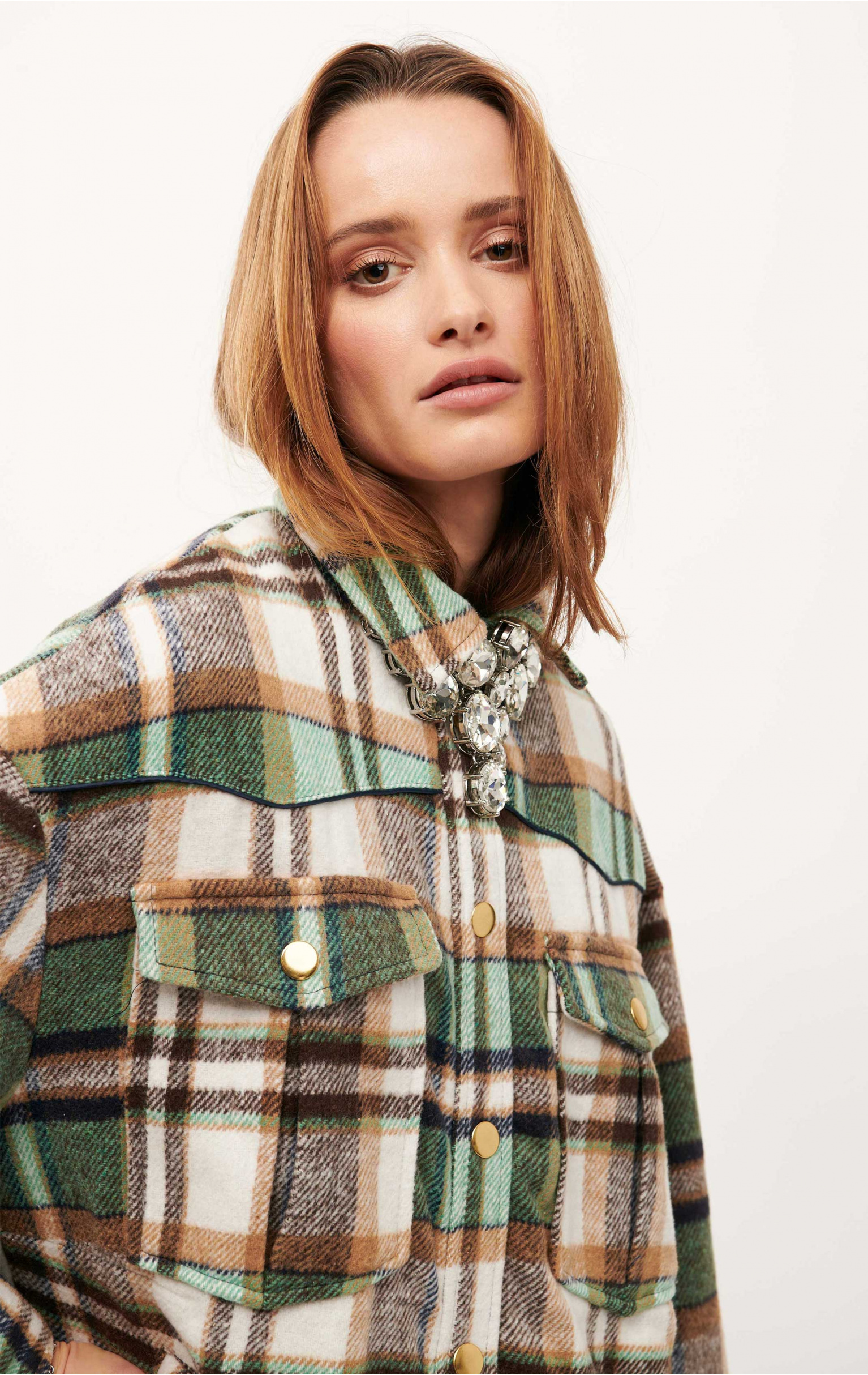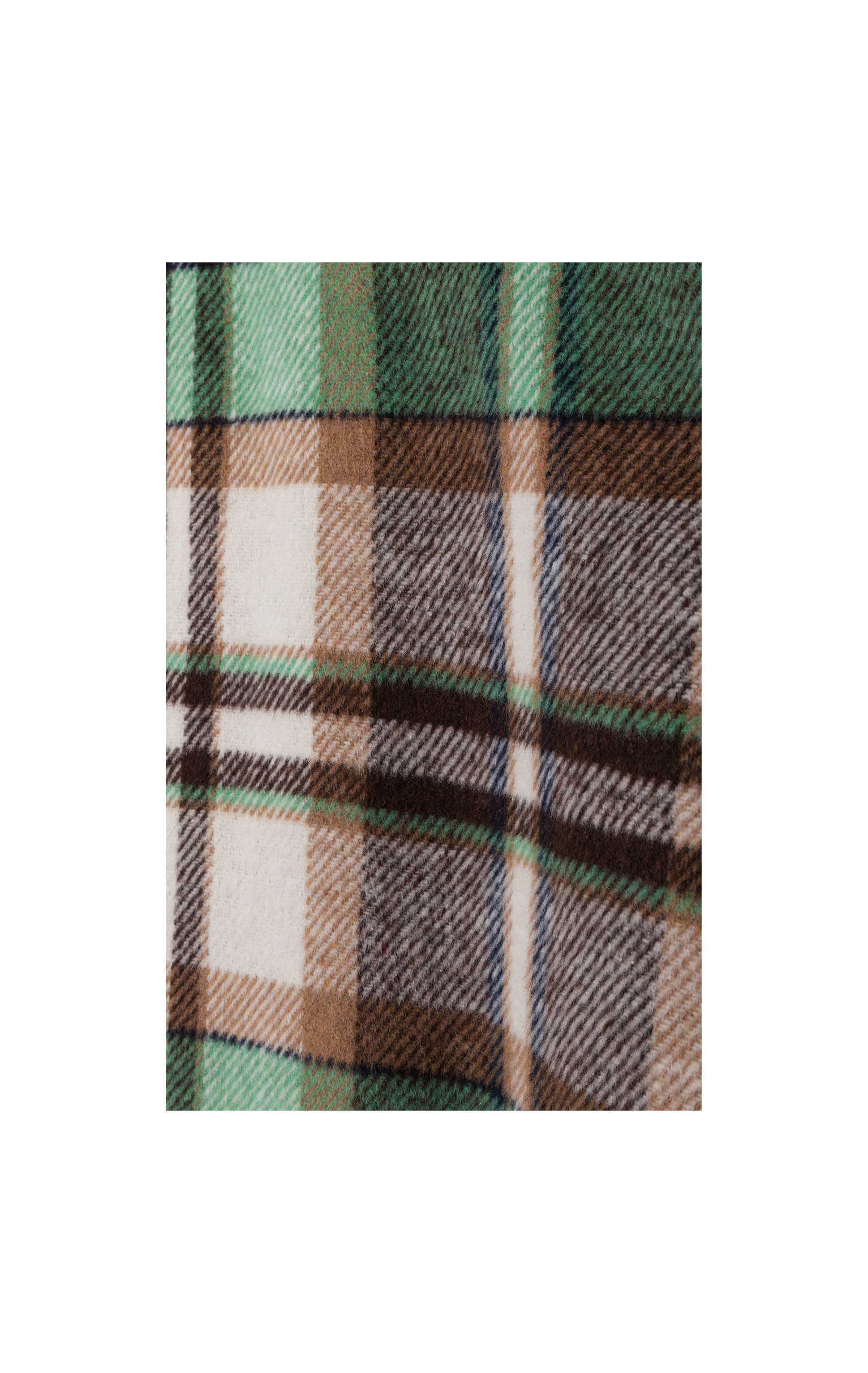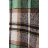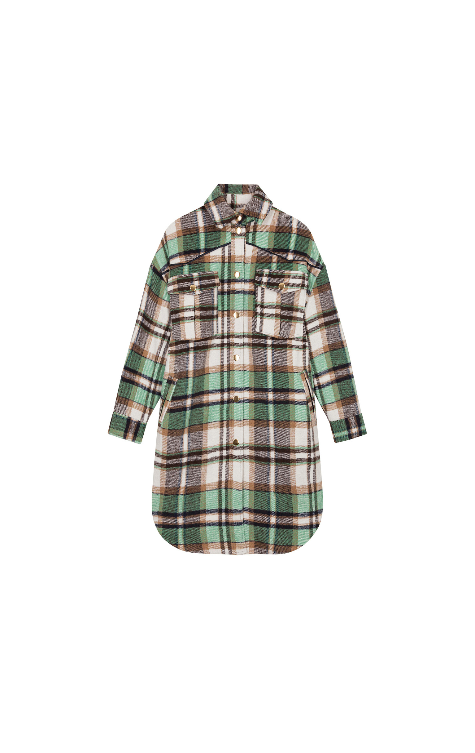 Tartan wool coat in shades of mint green, beige and dark brown. Gold snap closure and patch pockets on the front.