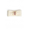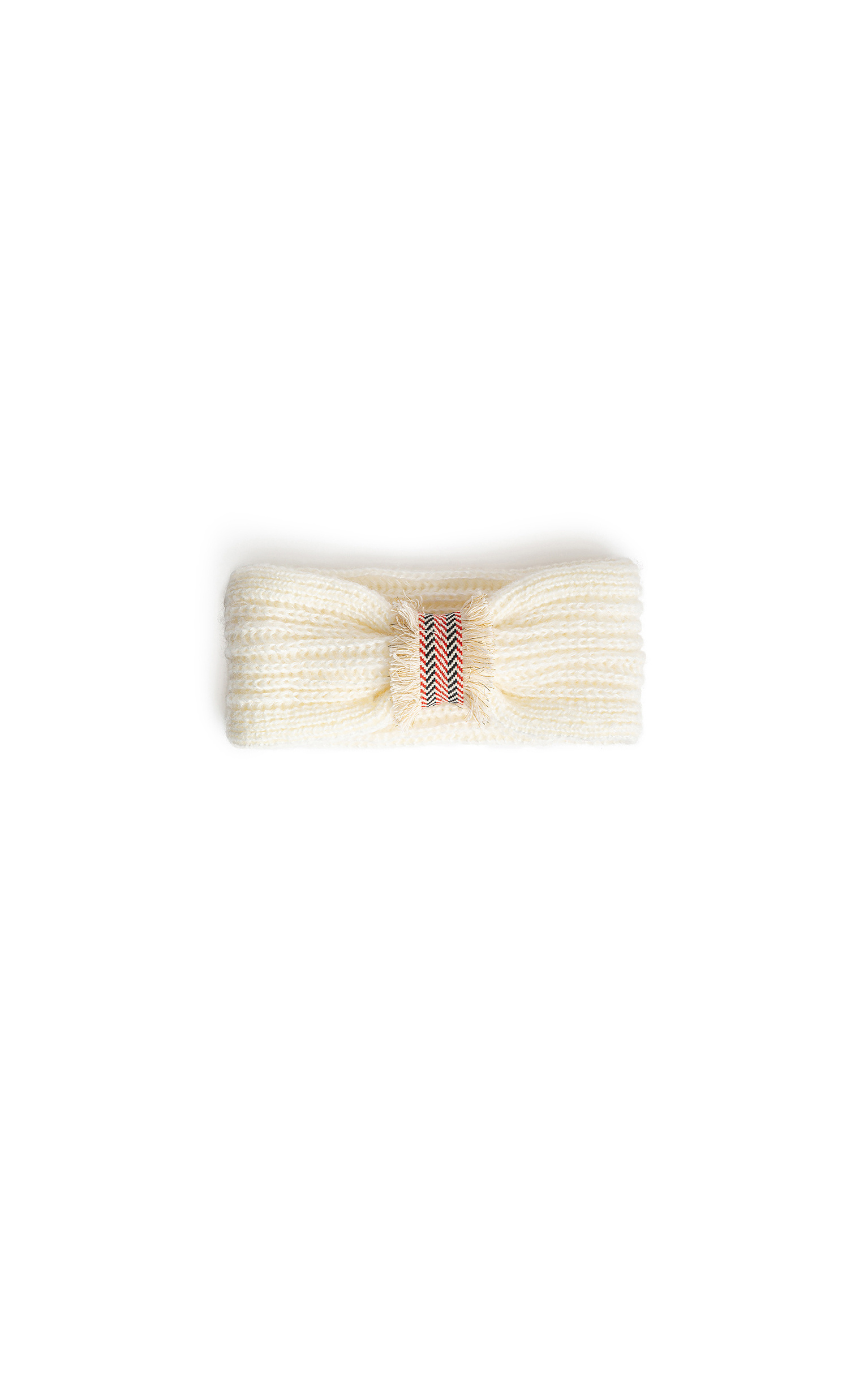 White mesh headband with beige, black and red ribbon on the front, and golden lurex threads.