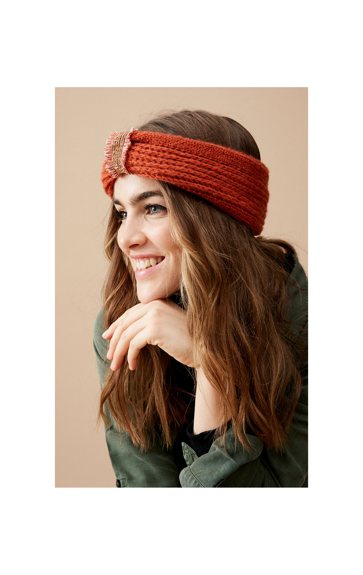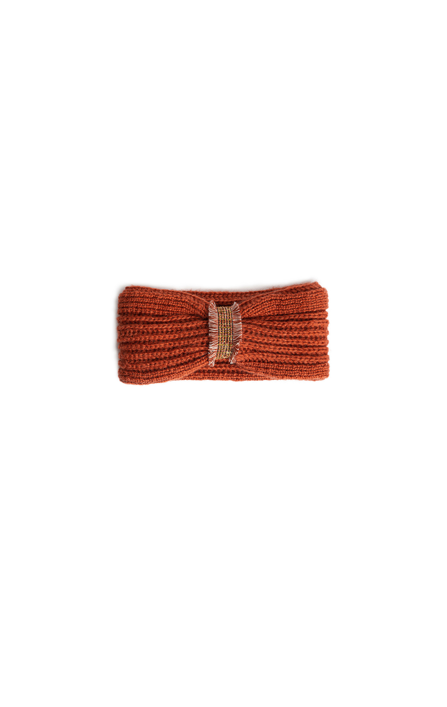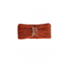 Headband in large hazelnut mesh with ribbon on the front of rust color, gold thread and embroidered with black.