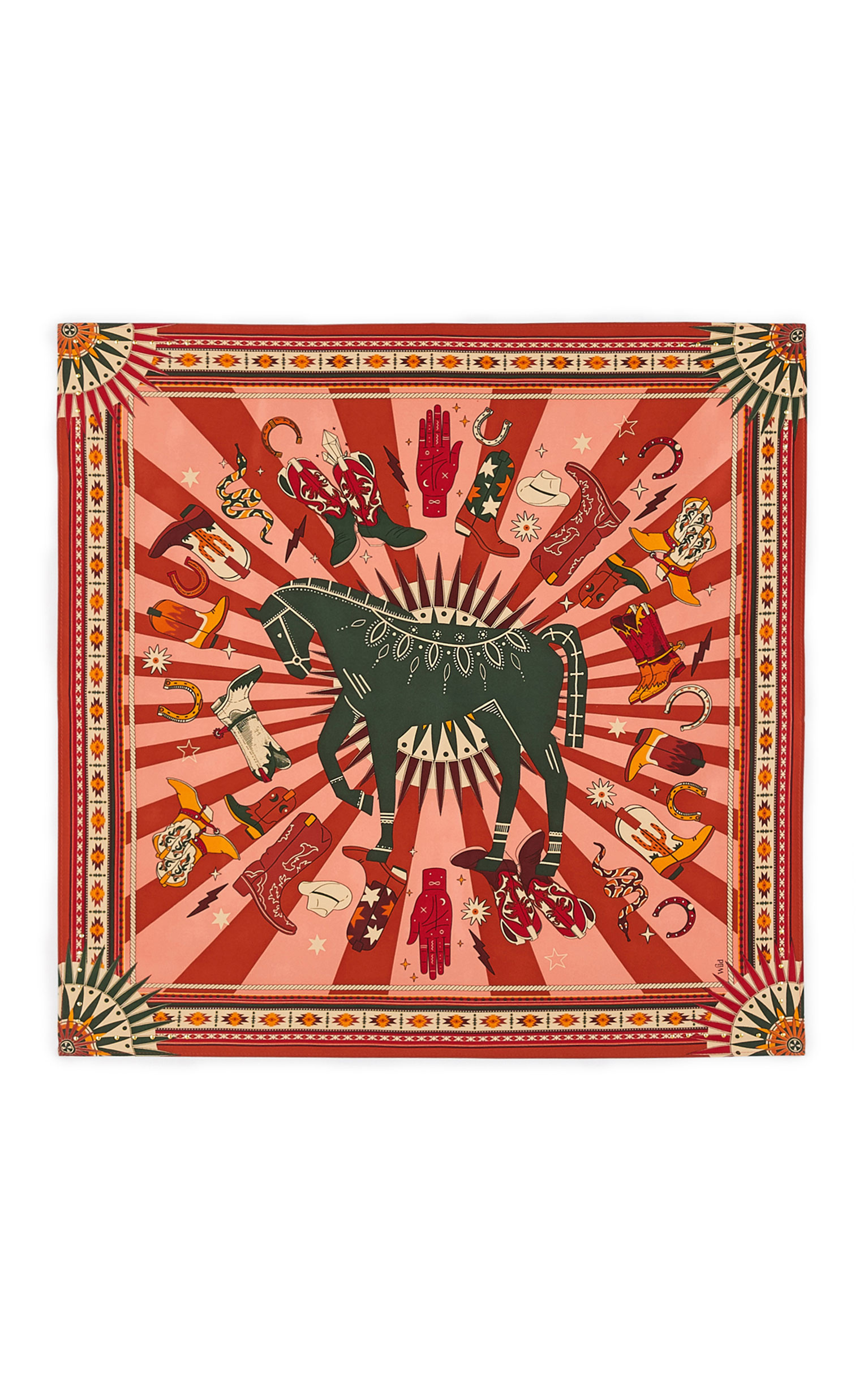 This is an original illustration based on the cowboy and Indian codes that were widespread at the turn of the century. At its center is a horse in a circle of cowboy boots and spurs, surrounded by a Navajo-style frame. You'll be enchanted by its bottle-green, almond, brown, plum and orange tones.