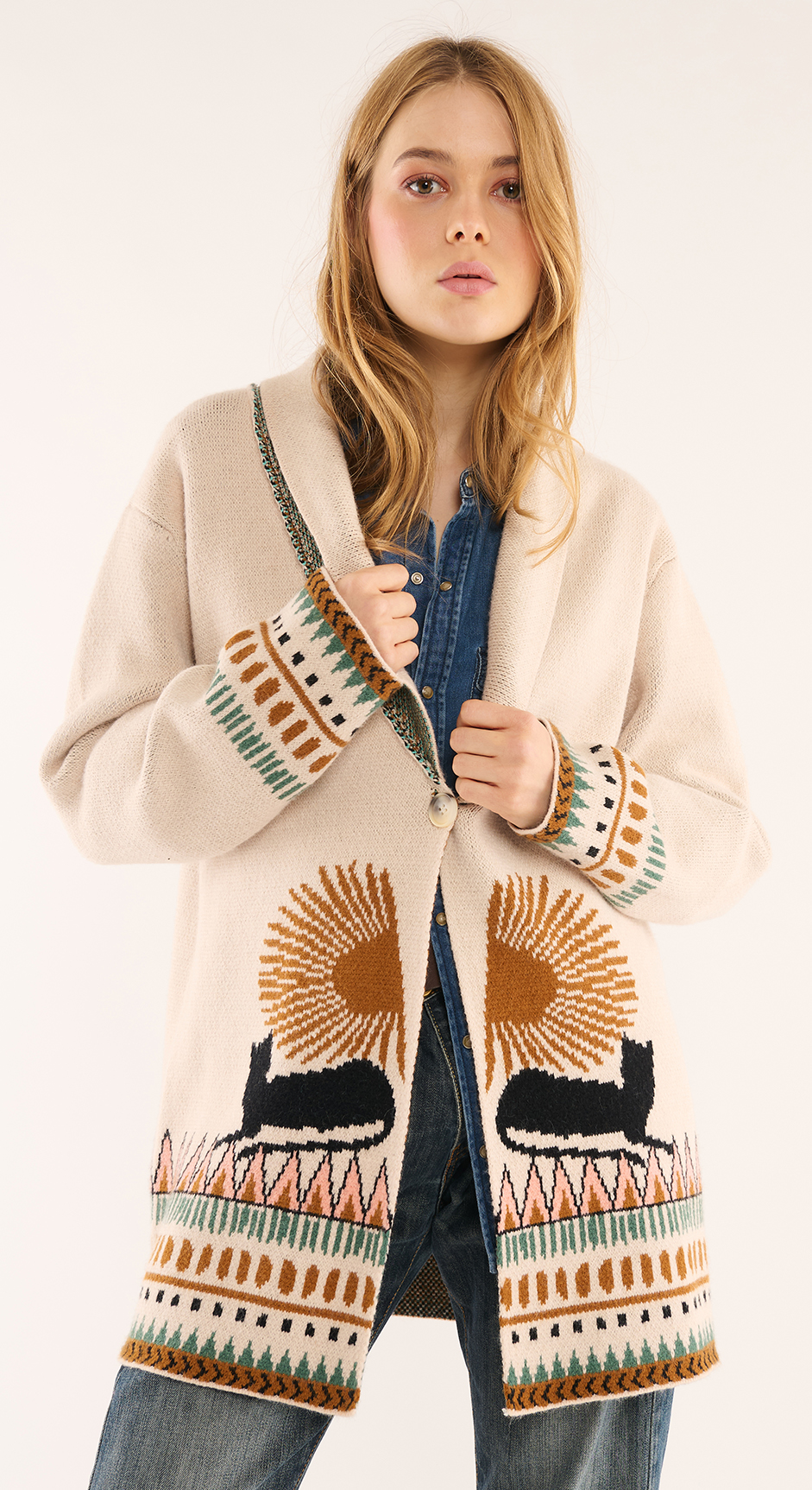 A supple, unbleached knit with a fluid drape and loose fit evokes the warm stones of dry paths. Wear it over a light dress crumpled by life, belted at the waist to create movement or left loose like a breath of air. It becomes an extension of a day spent wandering. That's what this ecru knit cardigan offers: softness, roominess, and security.