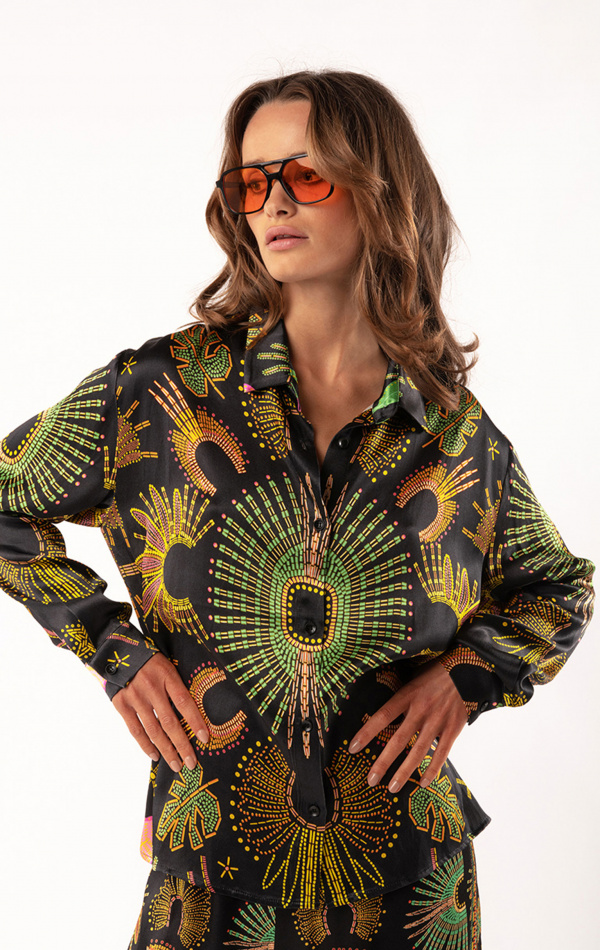 Black, wide-leg pants featuring Wakiza scarf motifs, adorned with crowns of Amazonian feathers, palm trees, shooting stars and small embroidered pearls. In shades of green, yellow, white and red. Printed band on sides, suit-style. Elasticated waistband.