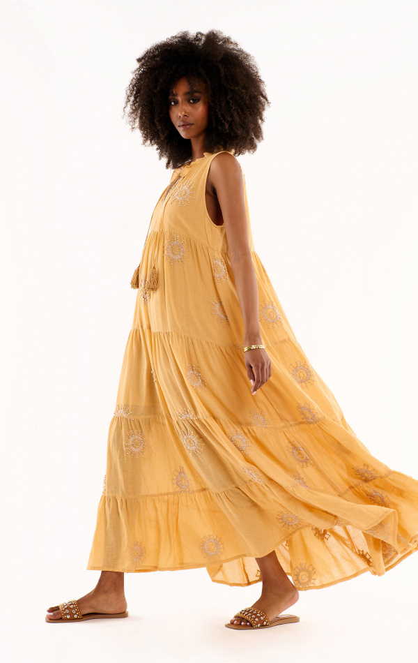 Our Kenny dress plays on WILD's sunny codes, but adds a touch of femininity with its slender "spaghetti" straps, magnificent swimmer's back and lovely ruffles that emphasize the curve of the bust. Undeniably summery, it's also a city piece, thanks to its plain yellow bottom, worn under a very vaporous fabric entirely embroidered with sequins. Its 7/8 length gives the silhouette an airy, comfortable and light feel, in perfect harmony with the summer heat.