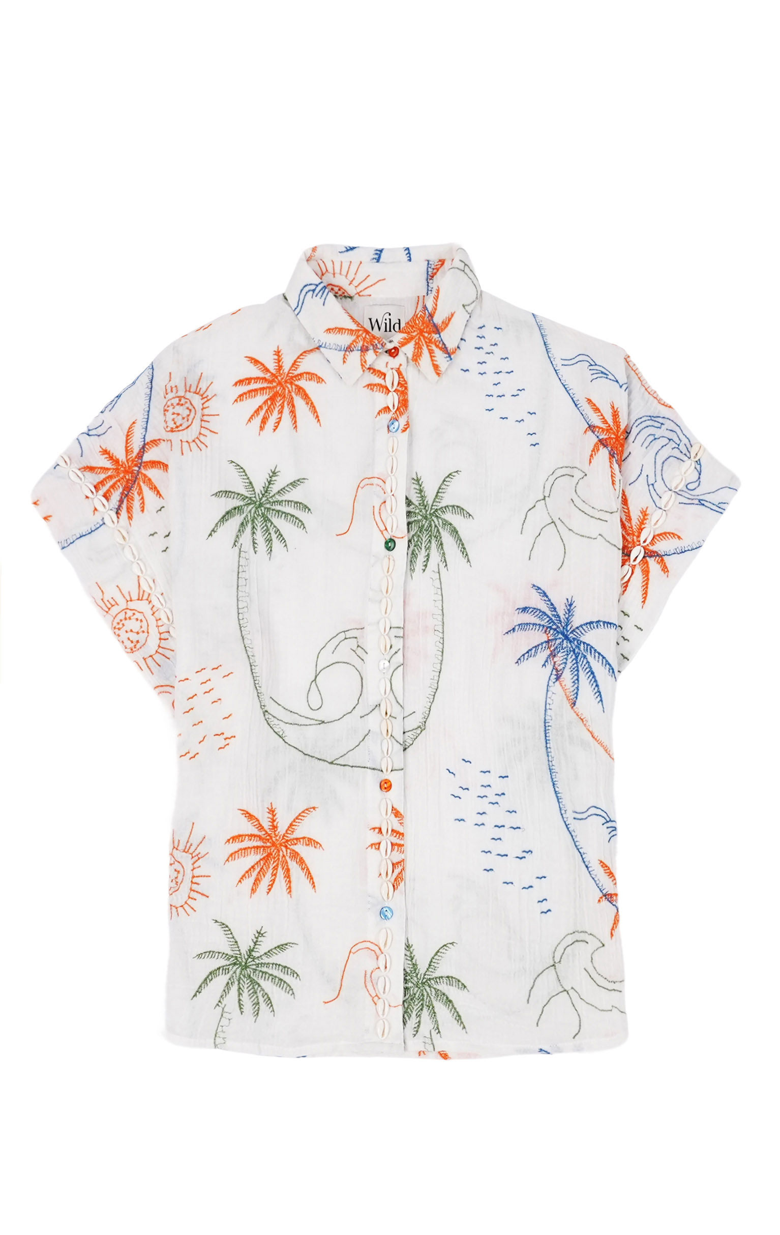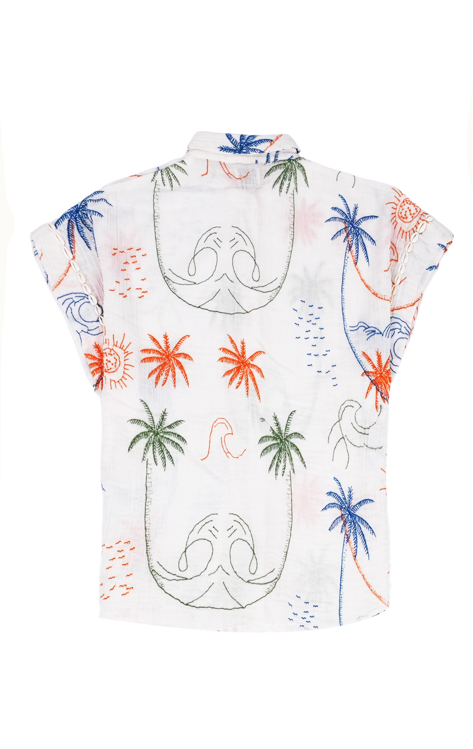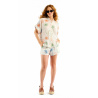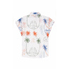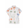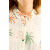 OWEN, a light, summery blouse, embodies a tropical, seaside summer thanks to its stylized motifs of marine and exotic flora.
