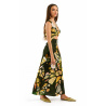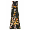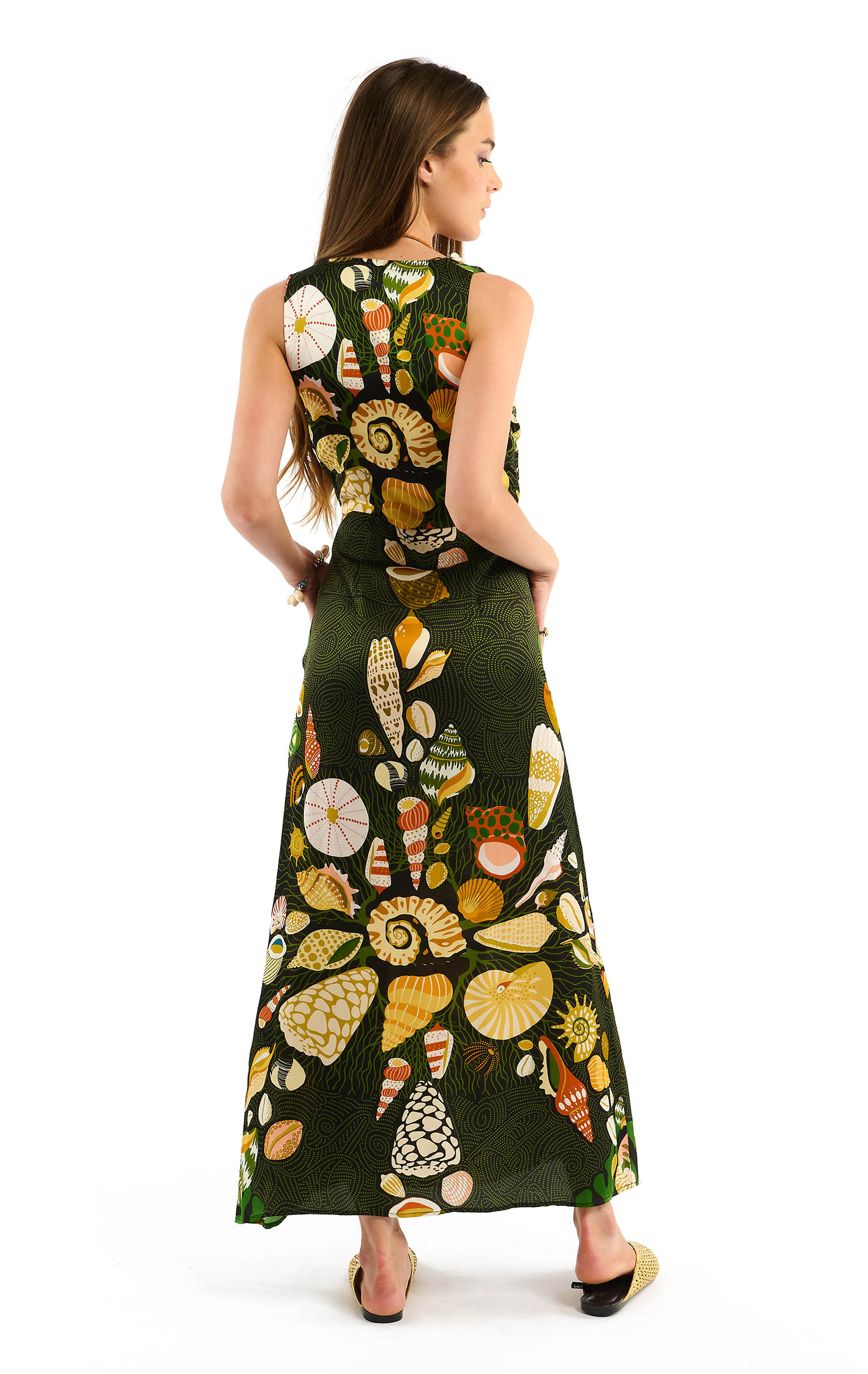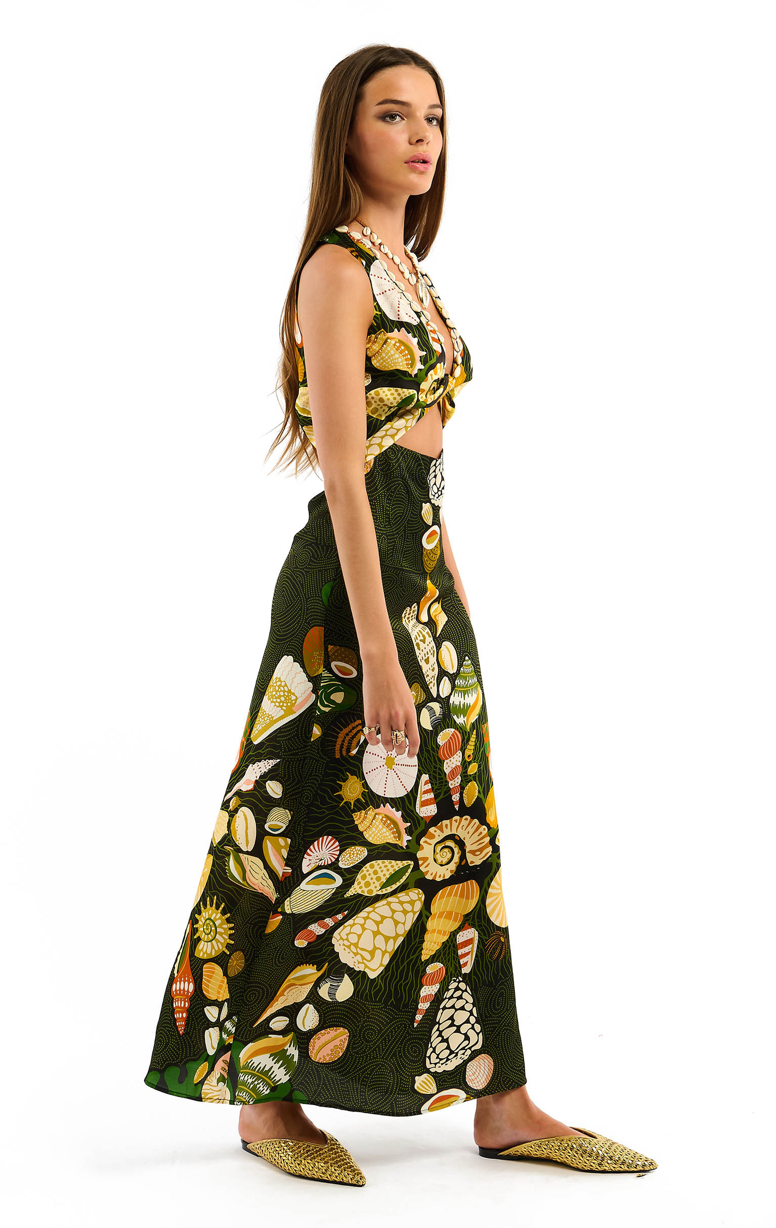 Long without being form-fitting, the SOLEMAR dress is crafted in a satin fabric adorned with our Coral print, inspired by the cowrie shell, Hipanema's emblematic symbol, which here highlights the dress's plunging, draped neckline. Shellfish, coral, crustaceans and sea creatures intertwine in a sexy fresco of colors in chocolate, ochre, khaki, yellow and white, set against a black background. SOLEMAR is available in two colors.