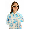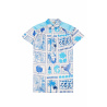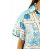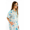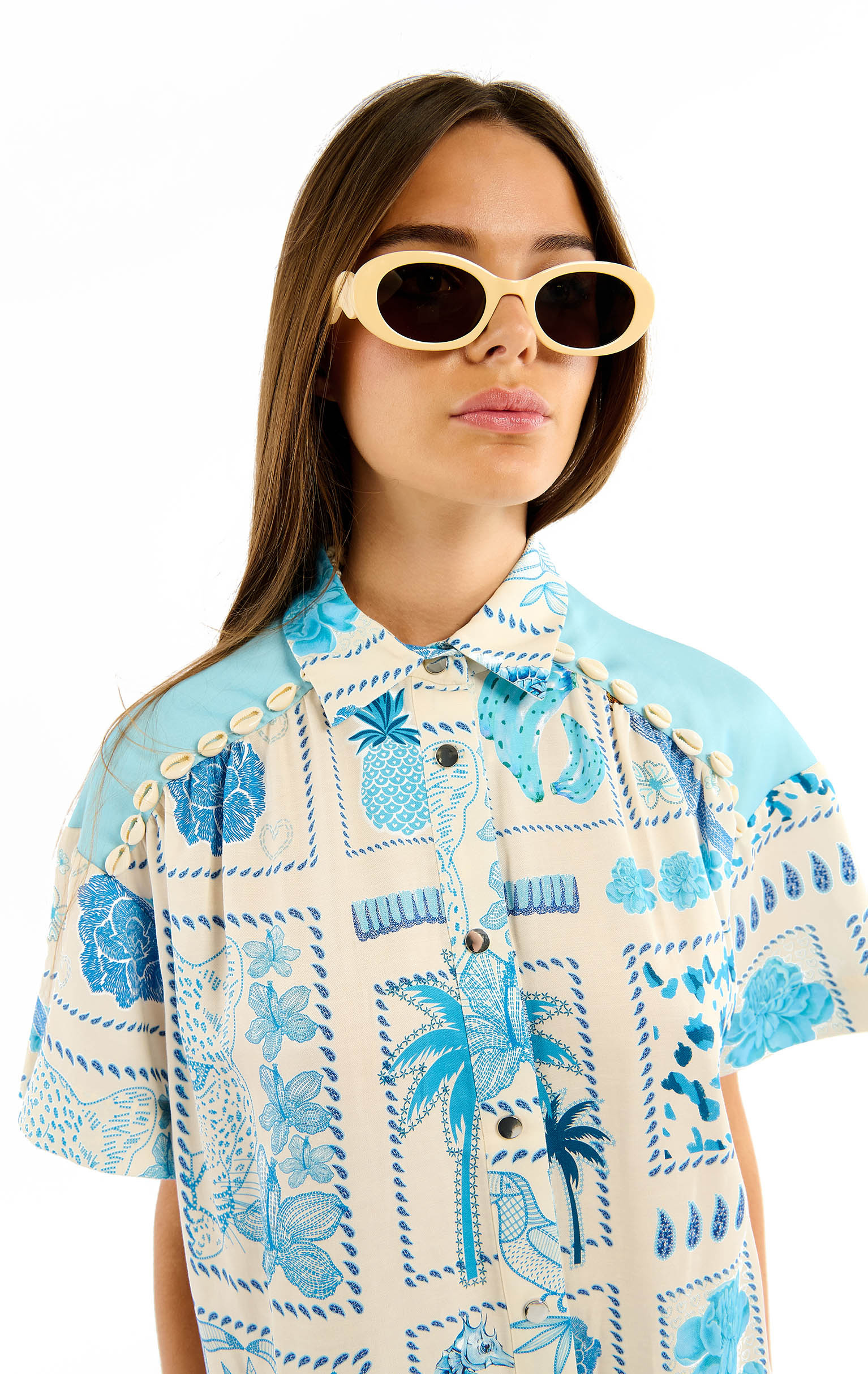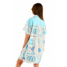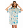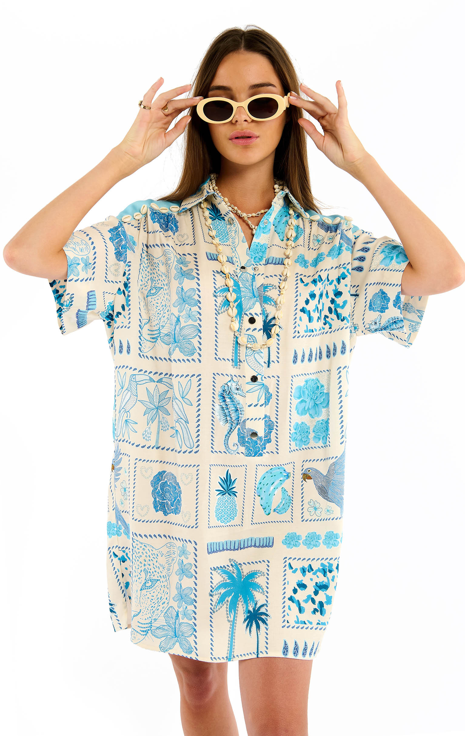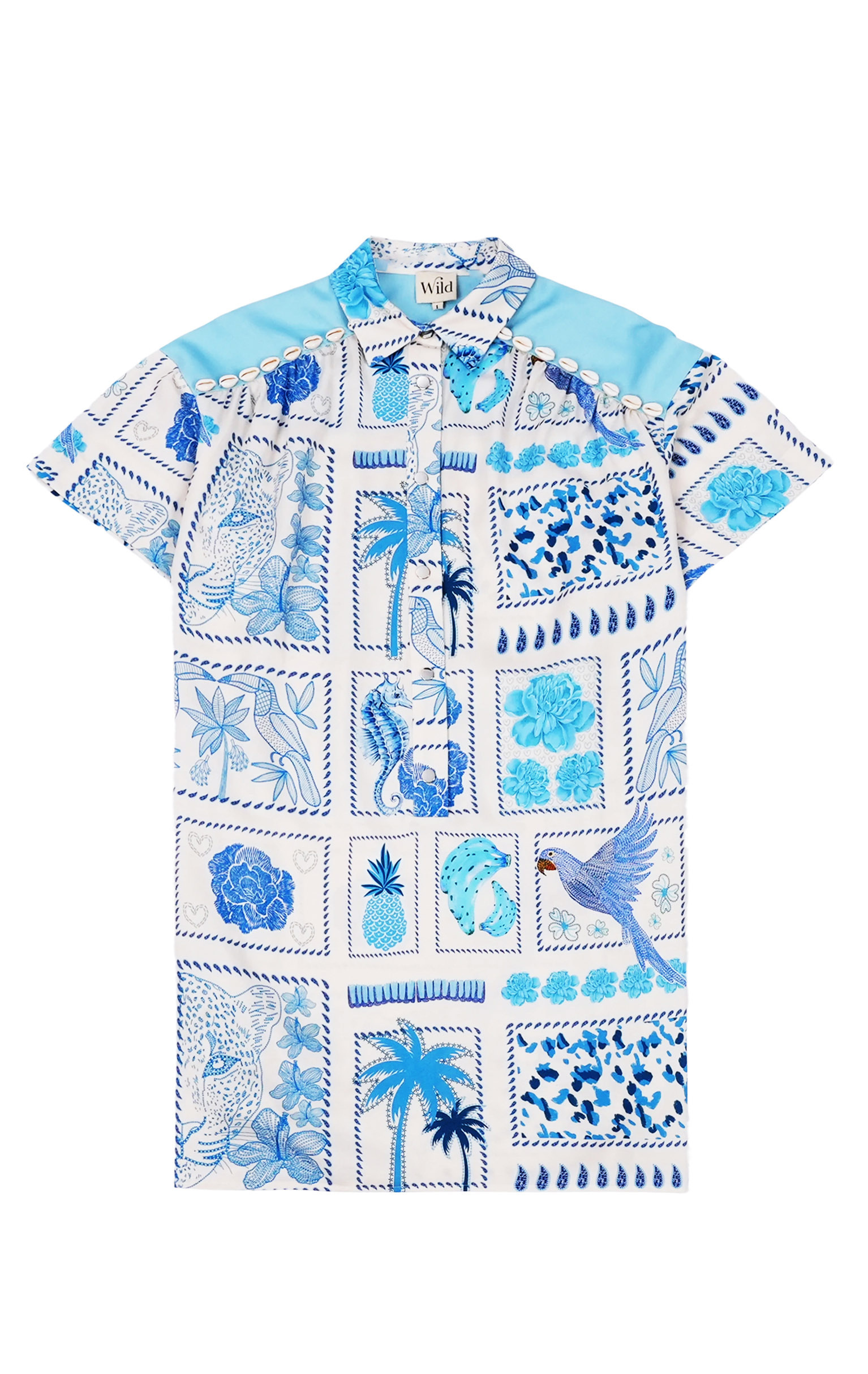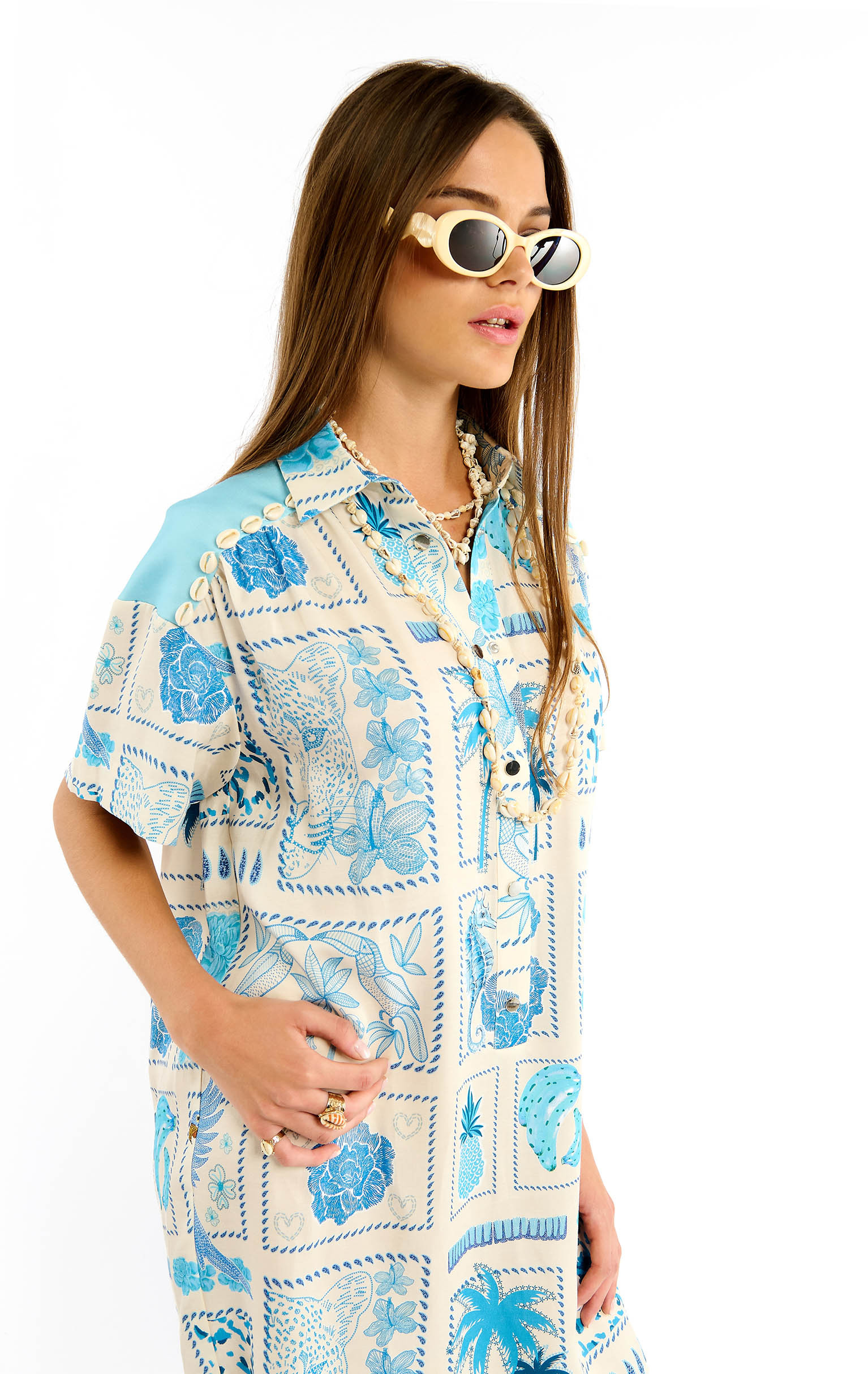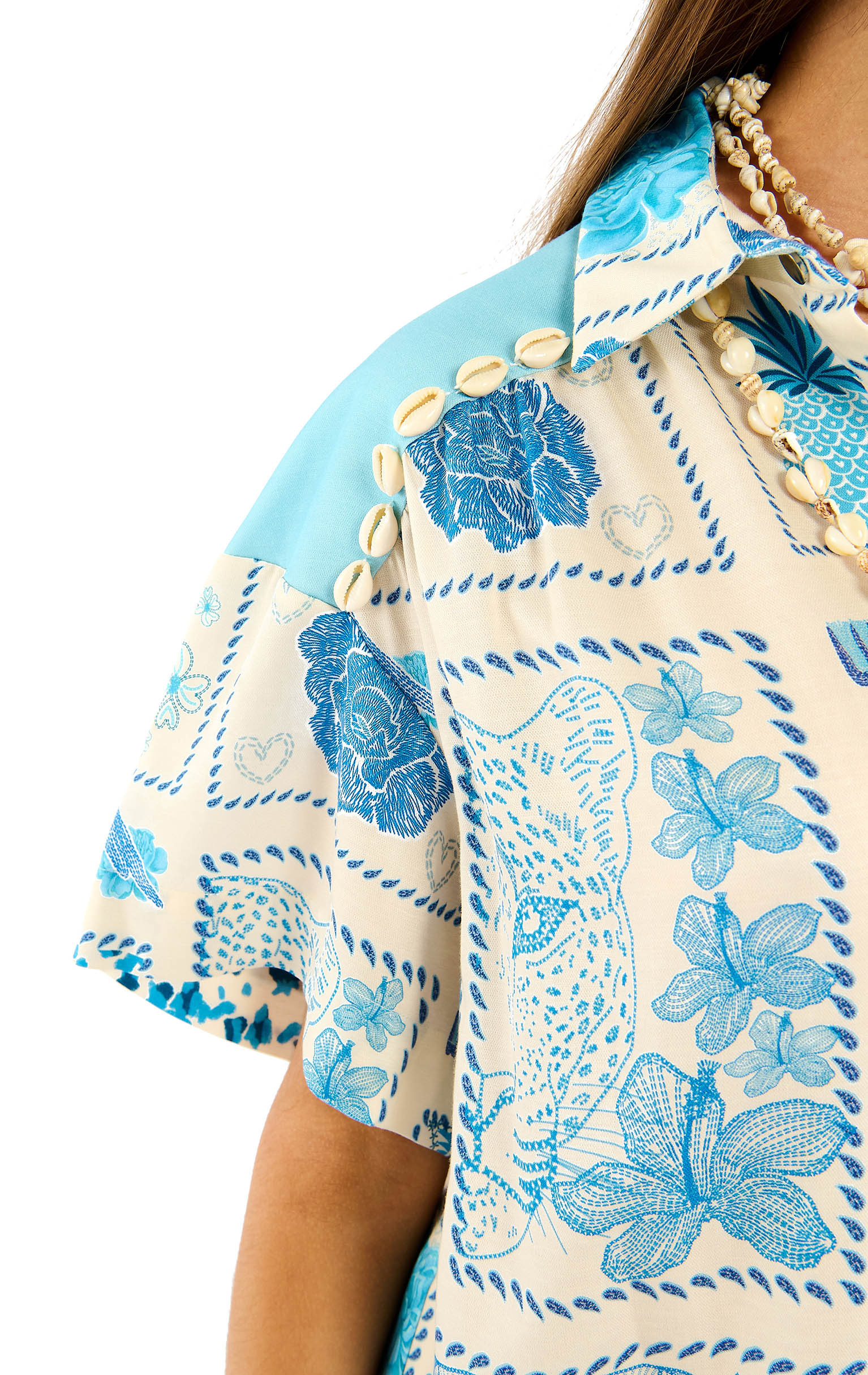 HAIVY is a short-sleeved shirt dress, structured with a two-tone fabric that gives it an elegant yet casual character. Two strips of plain light-blue linen-effect fabric are placed on each shoulder and highlighted by a hand-embroidered line of genuine cowrie shells. The rest of the dress unfolds in a rich print of Brazilian flora and fauna symbols. The button placket reaches down to the waist and is adorned with luminous silver buttons.
