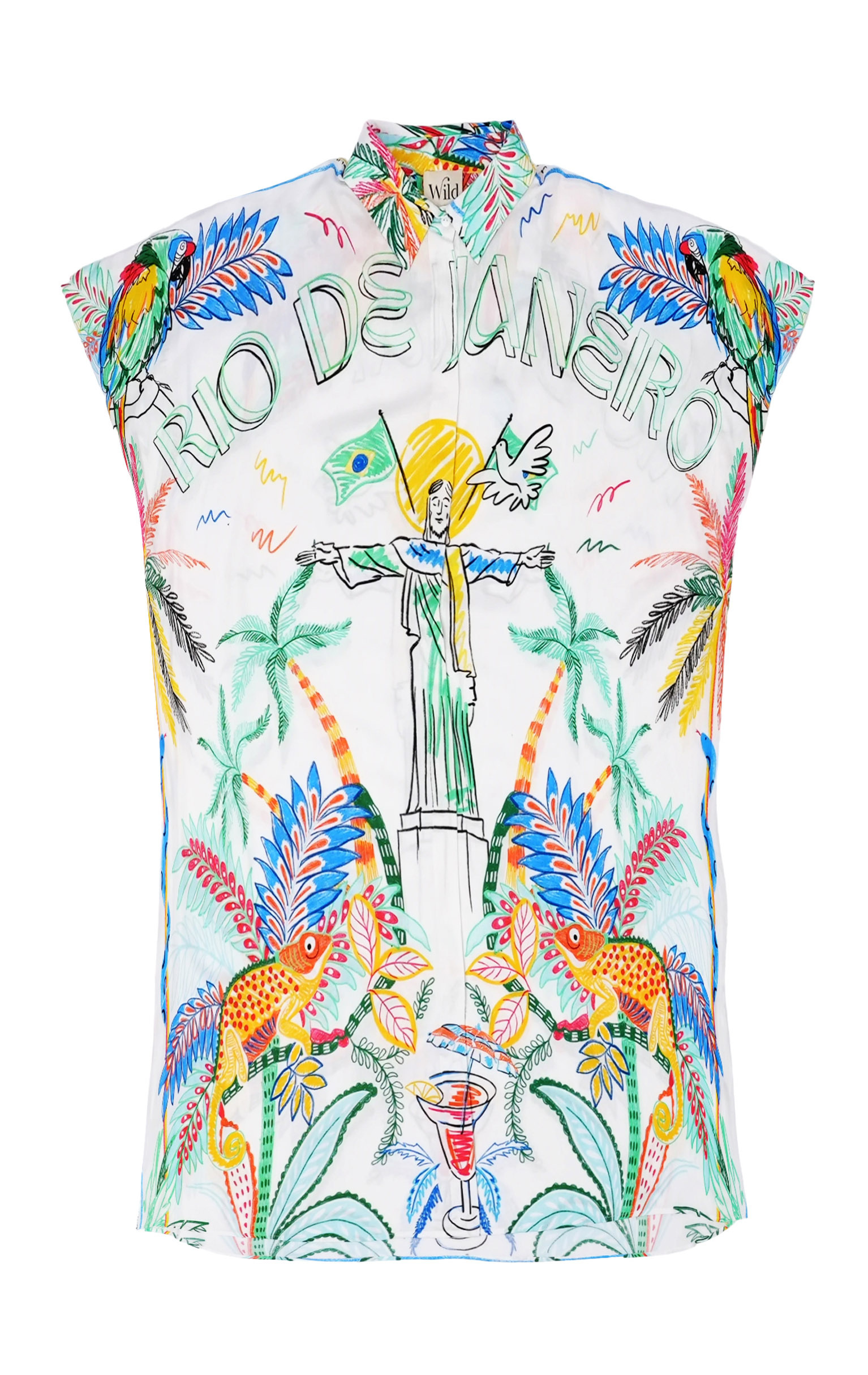 Made from incredibly soft viscose, KEINA seduces with its loose fit and 7/8th length, ideal for a summer of comfortable, sunny elegance. Its button placket descends delicately from a small, refined collar, while roll-up sleeves on the shoulder give it a unique, versatile character. It features our iconic BAHIA print, on which Christ the Redeemer, the emblematic symbol of Brazil, shines. Around him, an explosion of tropical motifs - palms, parrots, exotic fauna, flag and lush vegetation - compose a vibrant fresco in the colors of Brazil. Available in two colors.