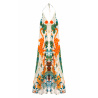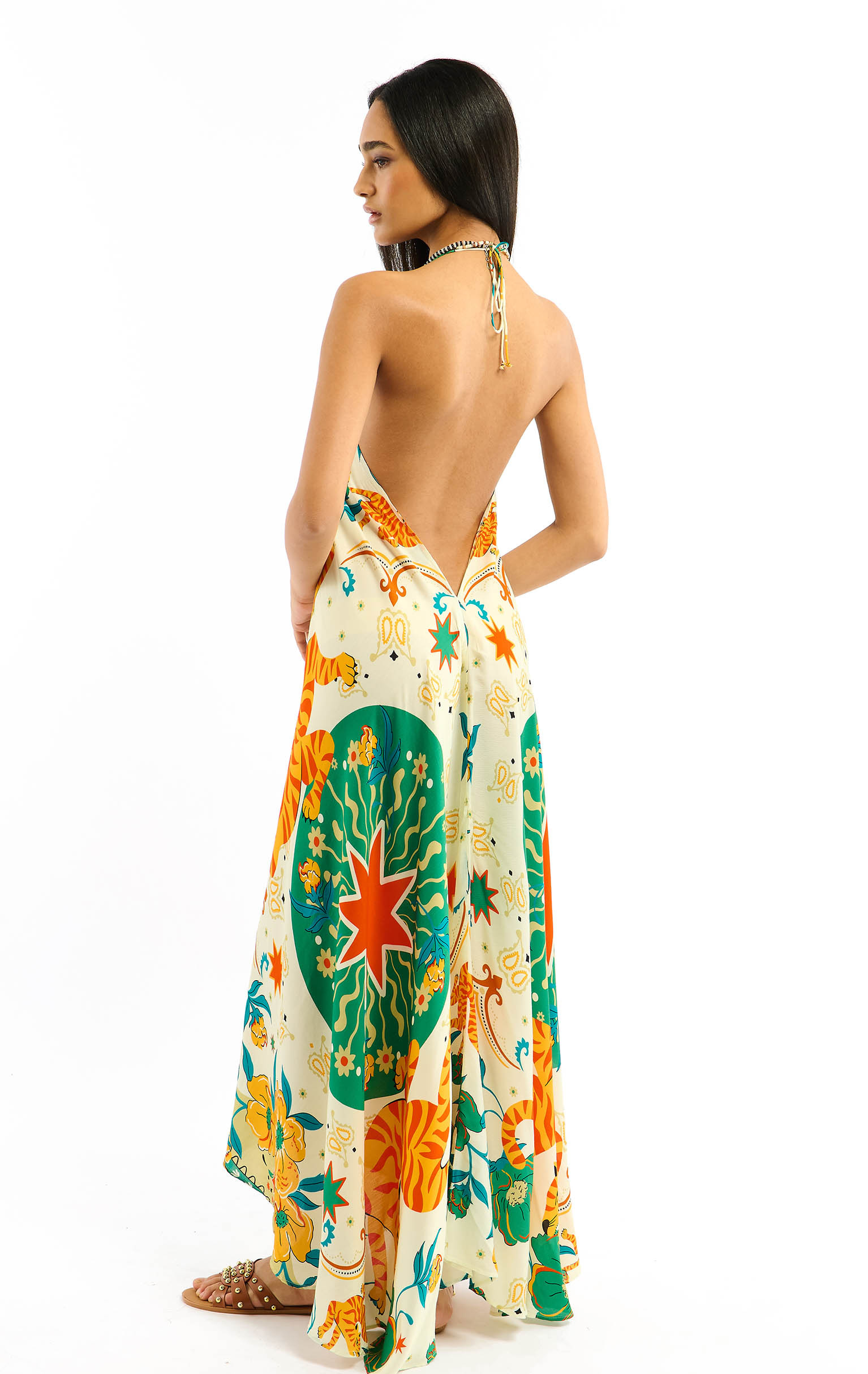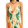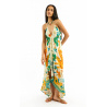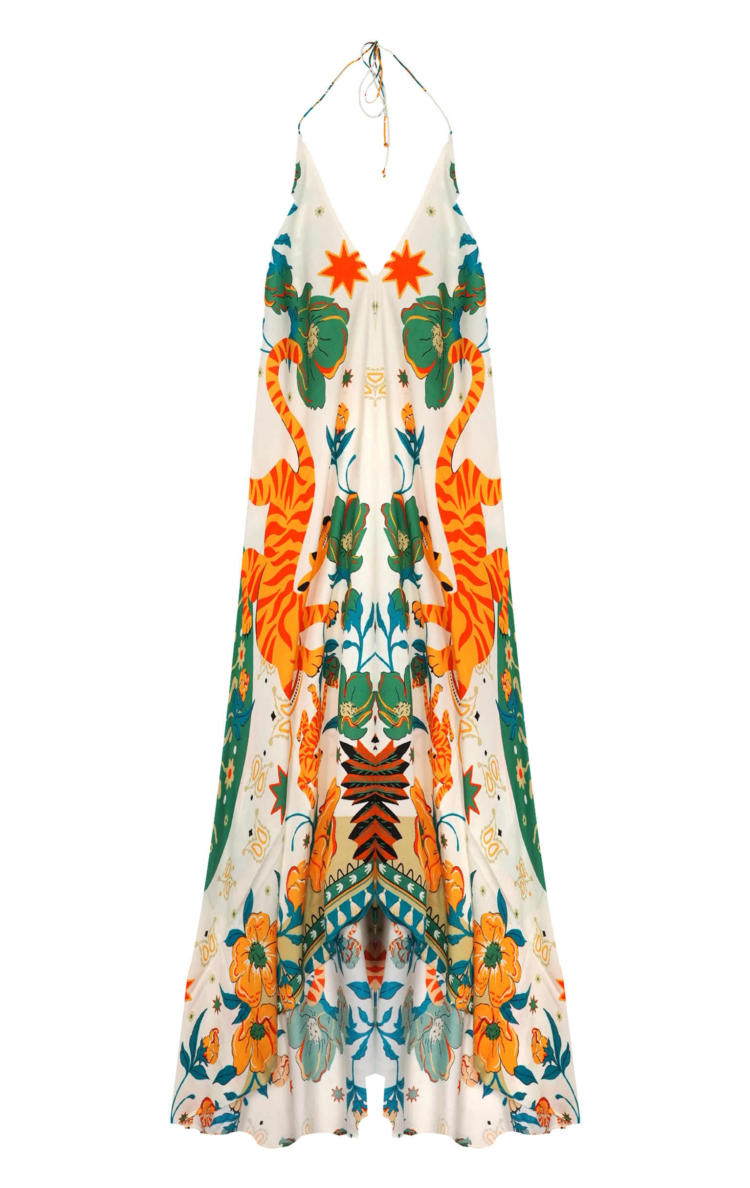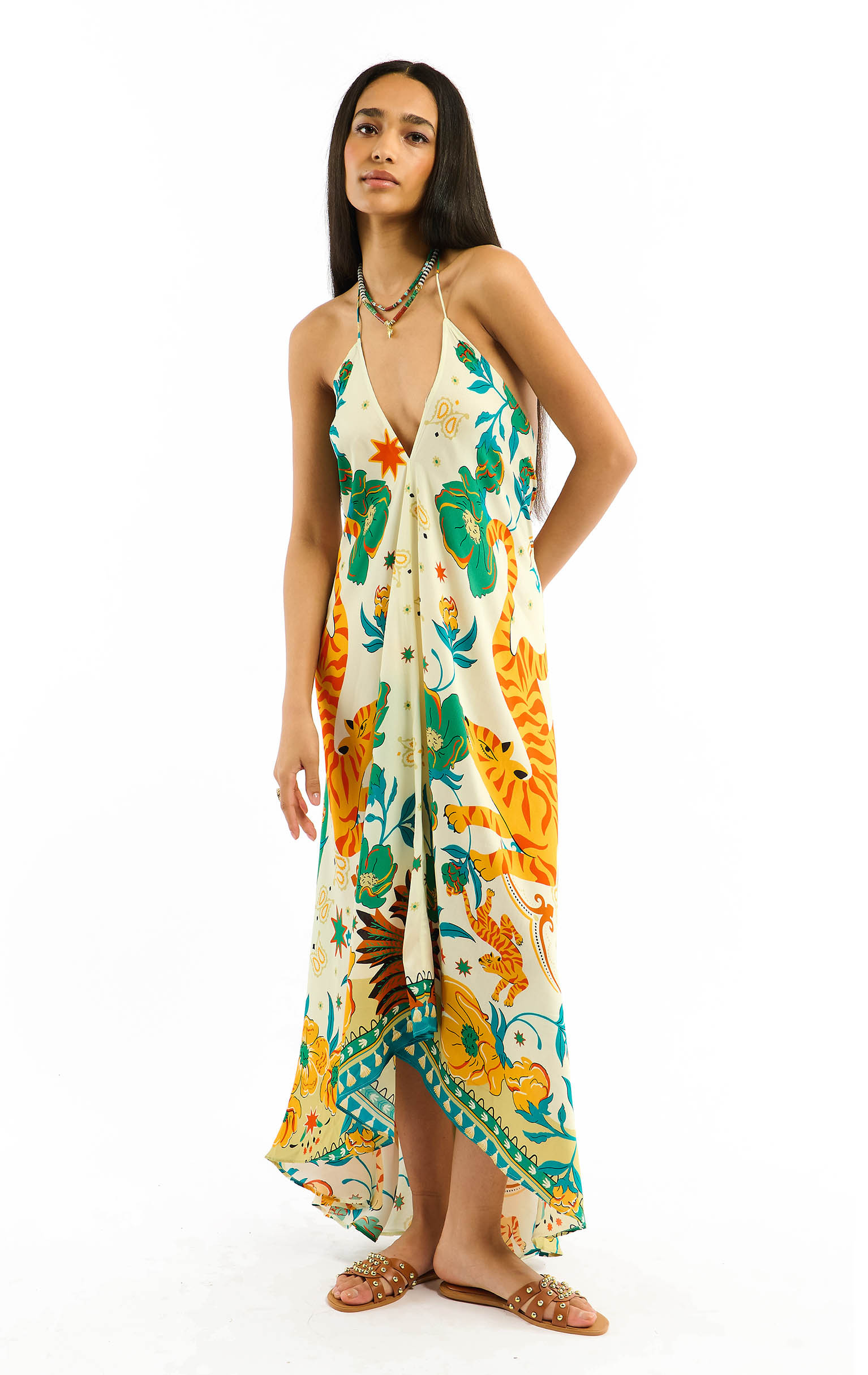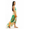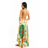 Adorned with our BANDIDAS print, built around a stylized star, the VOILA BANDIDAS dress reinvents emblematic bandana codes - such as paisley - mixing them with a docile, colorful tiger, summery flowers and nods to Mexican aesthetics.Tied behind the neck, it reveals a deep décolleté and slips on in a single gesture. Its slightly asymmetrical 7/8th cut creates a train effect at the back, enhanced by incomparably soft viscose. Available in three colors, the green version features shades of yellow, orange, coral, beige, khaki, turquoise, white and aqua green.