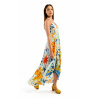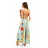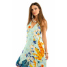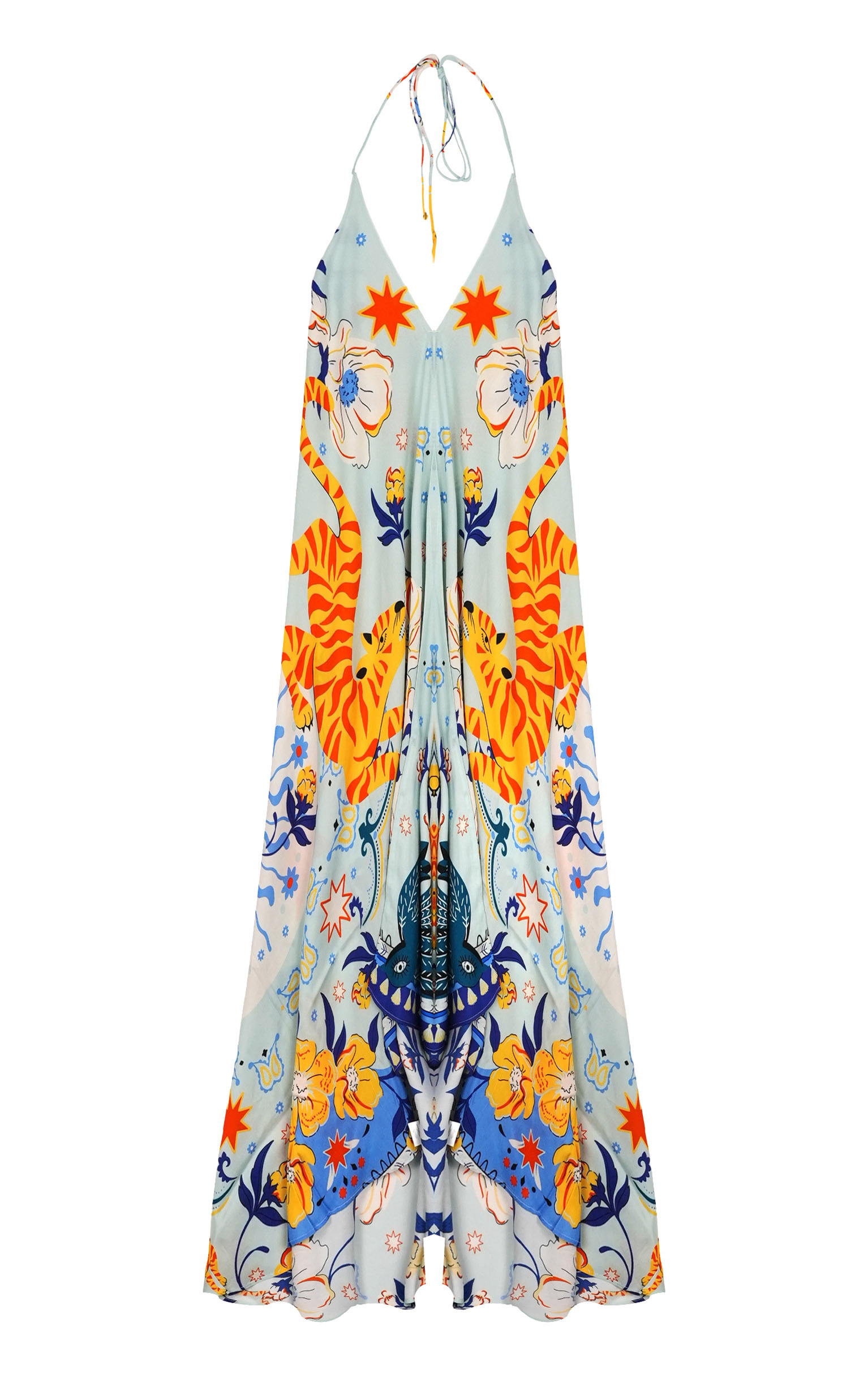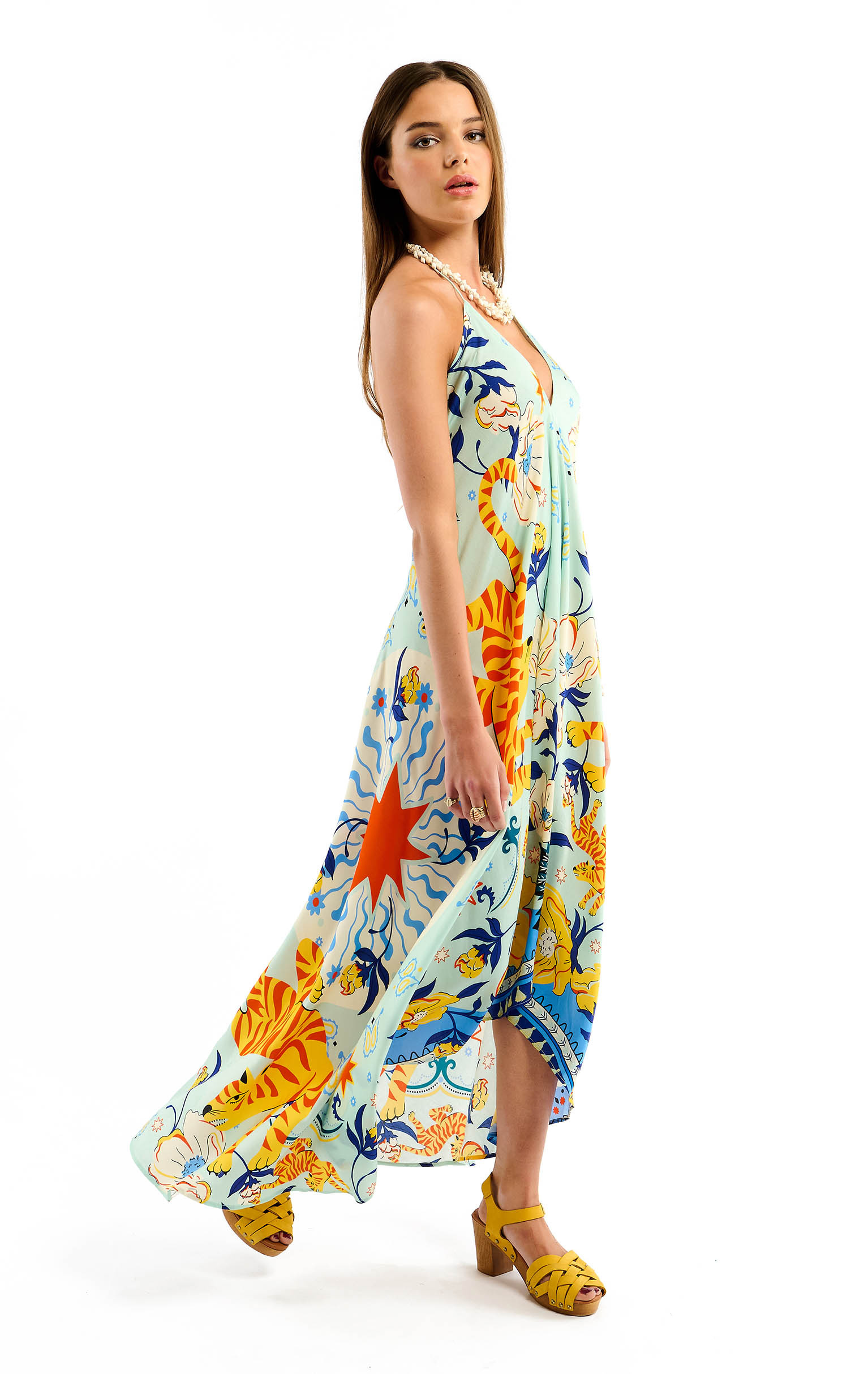 Adorned with our BANDIDAS print, built around a stylized star, the VOILA BANDIDAS dress reinvents emblematic bandana codes - such as paisley - mixing them with a docile, colorful tiger, summery flowers and nods to Mexican aesthetics.Tied behind the neck, it reveals a deep décolleté and slips on in a single gesture. Its slightly asymmetrical 7/8th cut creates a train effect at the back, enhanced by incomparably soft viscose. Available in three colors, here in a blue version with shades of yellow, orange, coral, cyan blue, midnight blue, white and red.