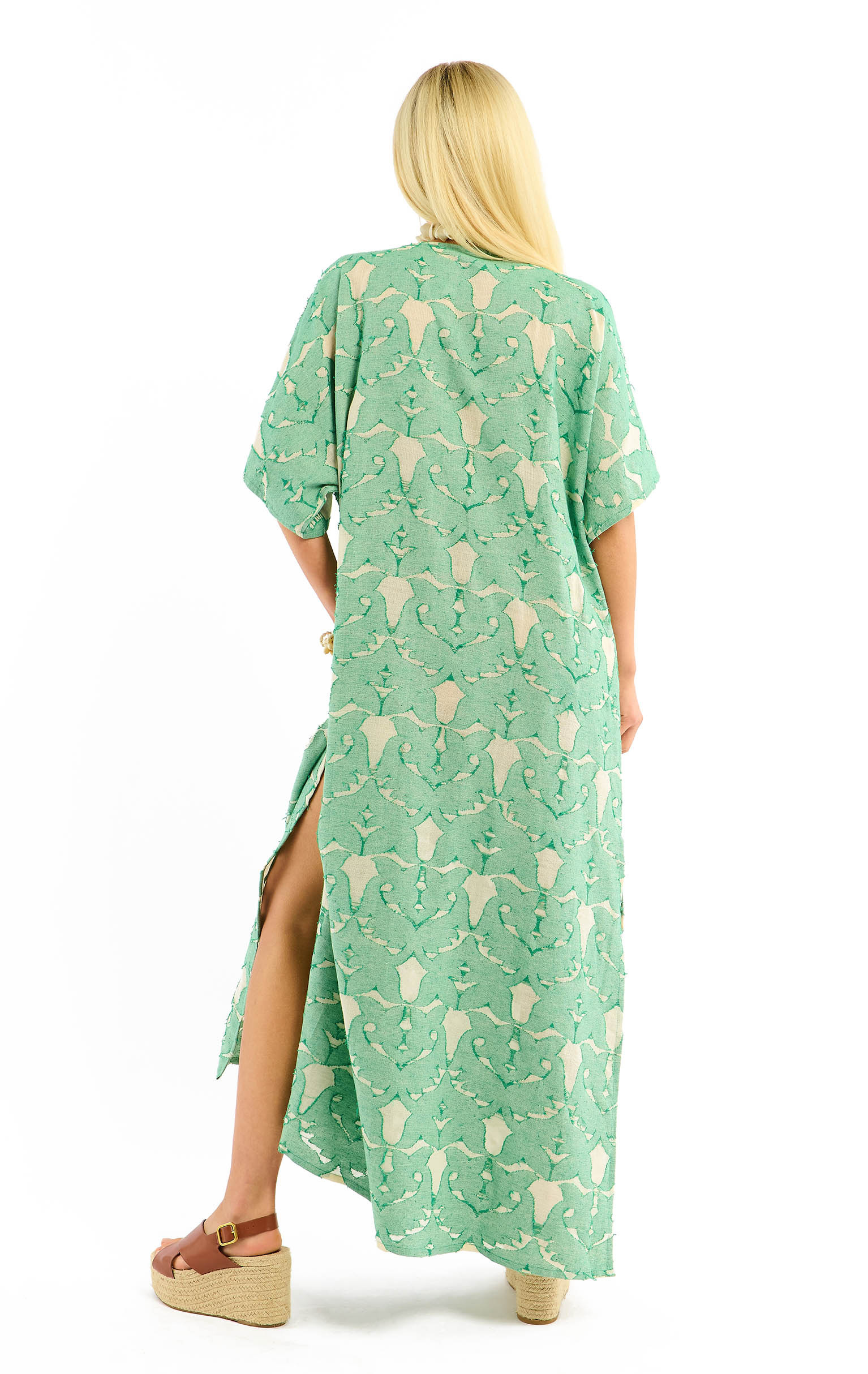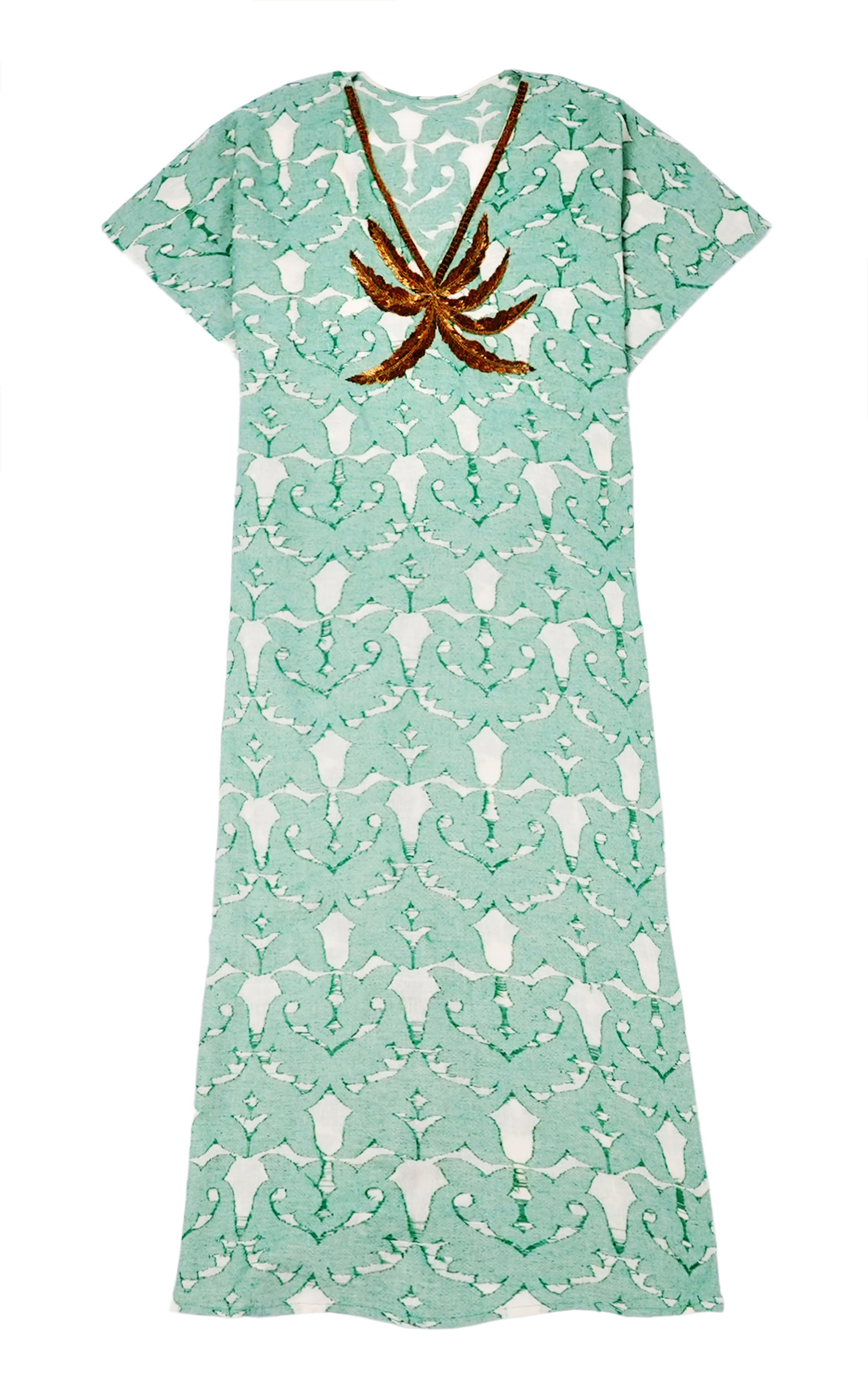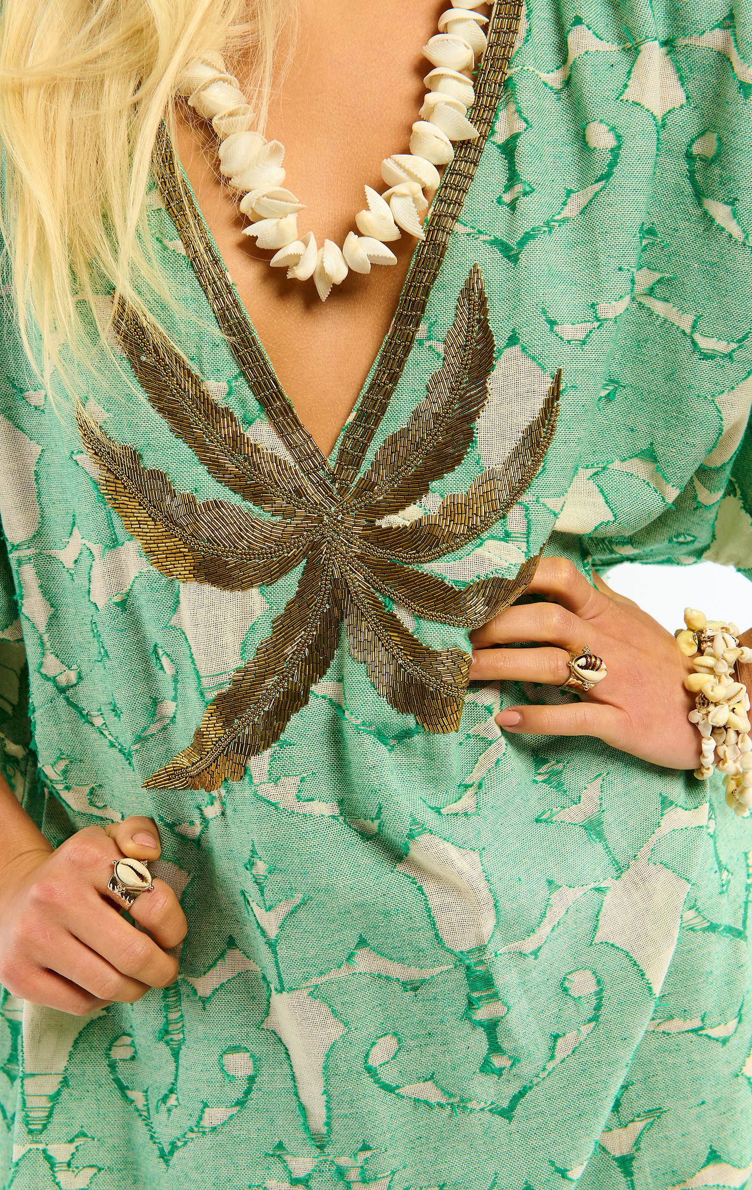 In shaved, two-tone jacquard, IVANE unfurls abstract shapes with exotic, plant-like resonance. A majestic V-neck descends down the front of the dress, sublimated by a line of hand-embroidered golden-tube beads, creating a sumptuous inverted palm tree. IVAN's airy comfort is enhanced by two slits on each side and short, wide sleeves for total freedom of movement.