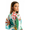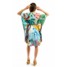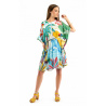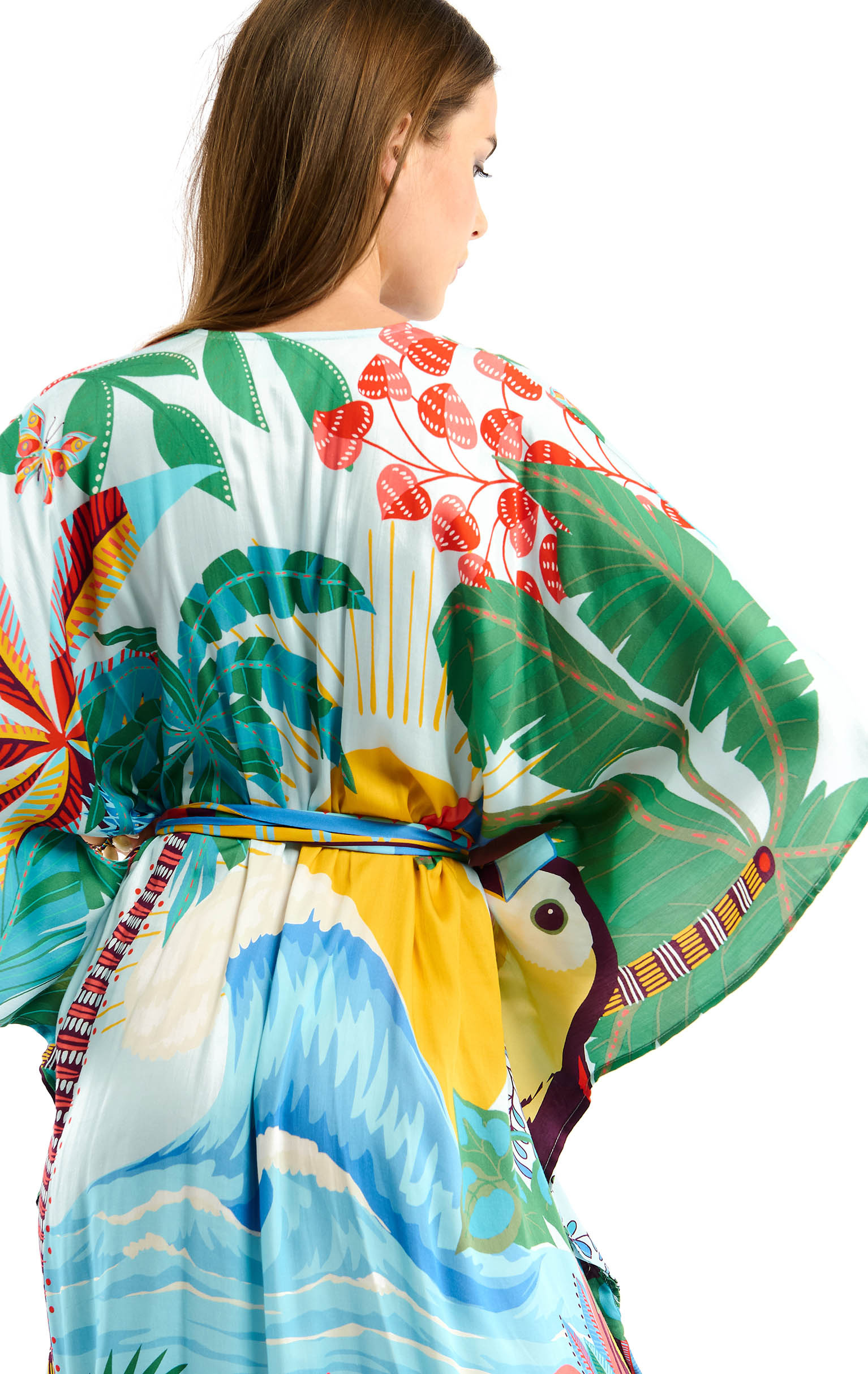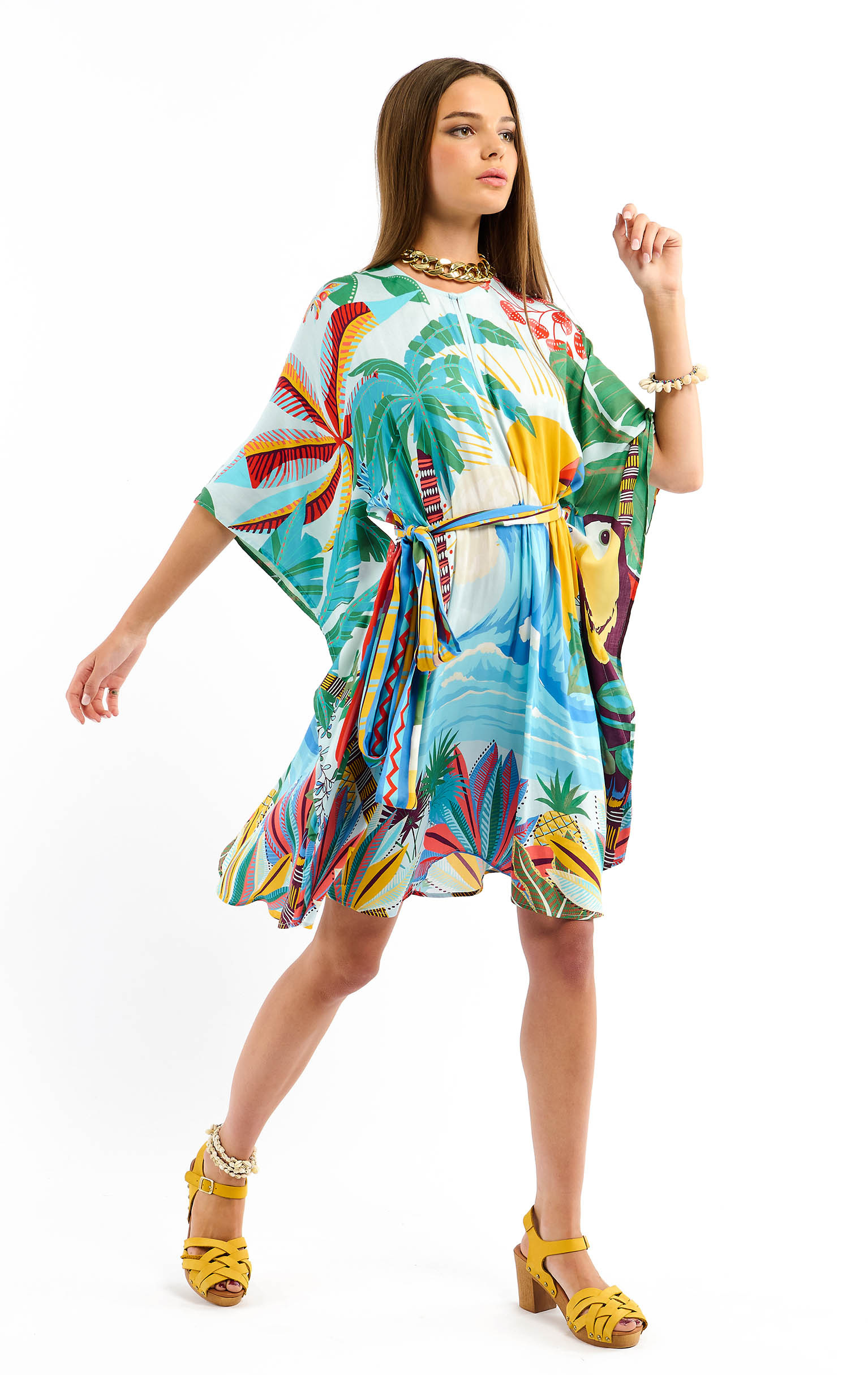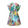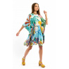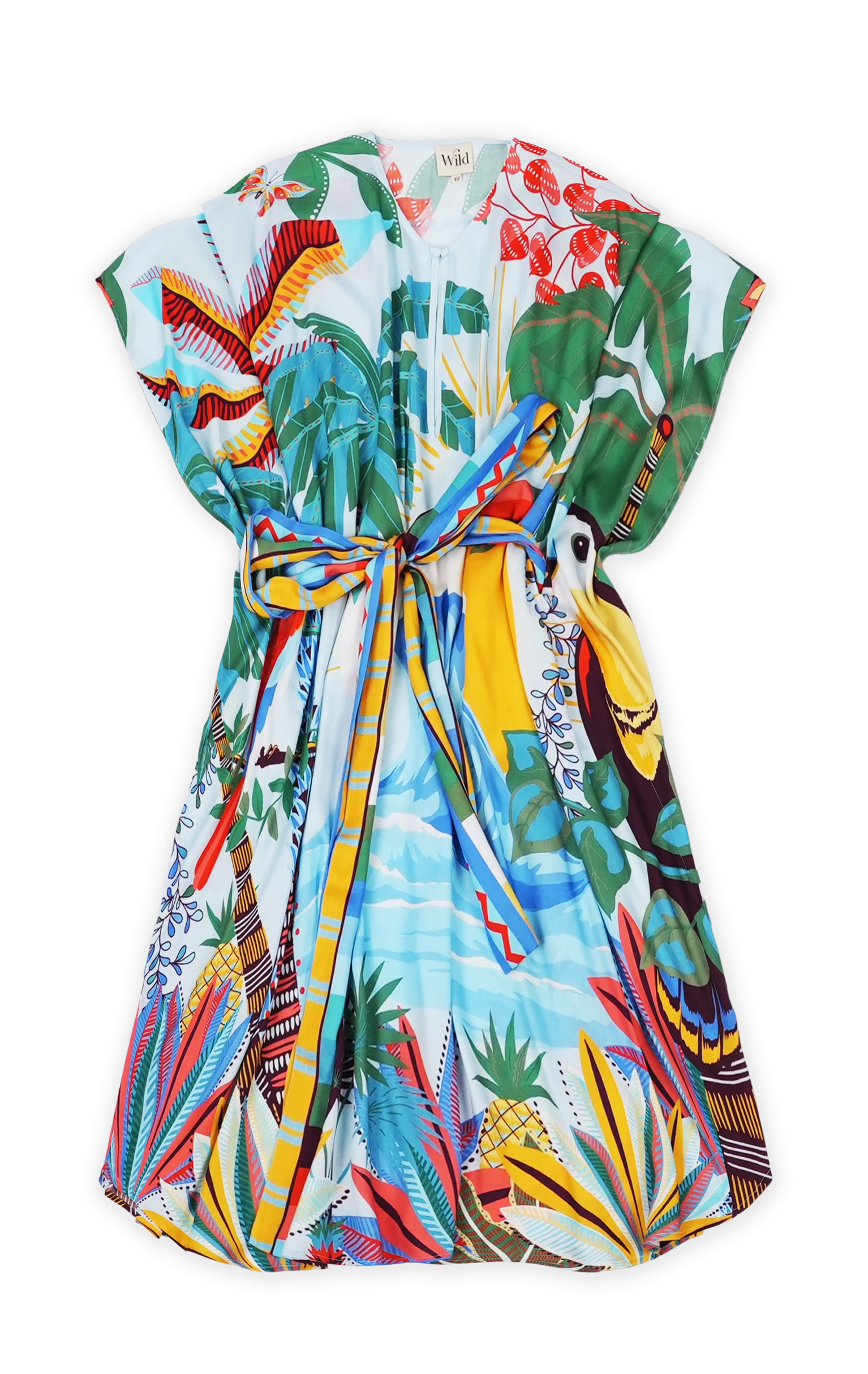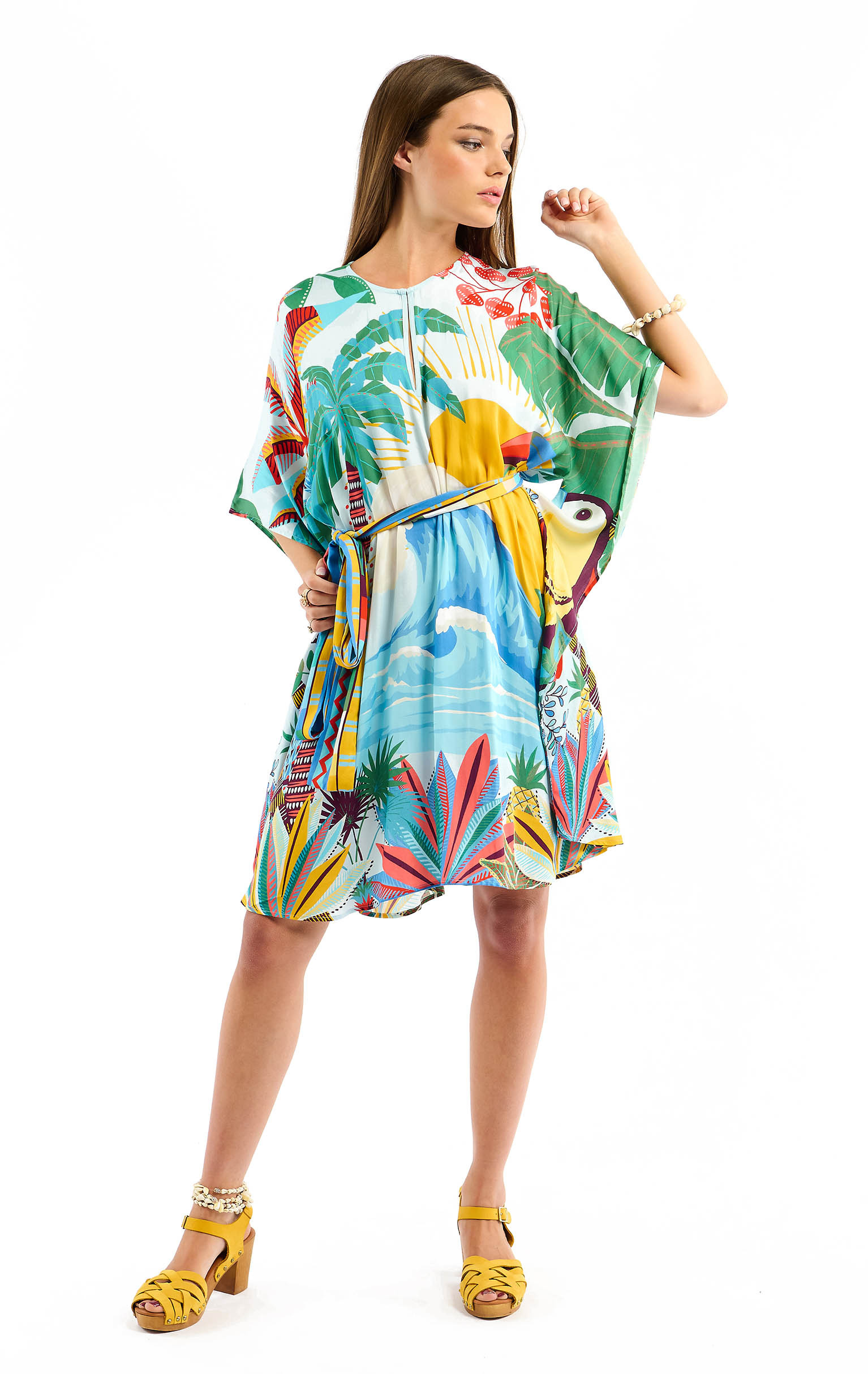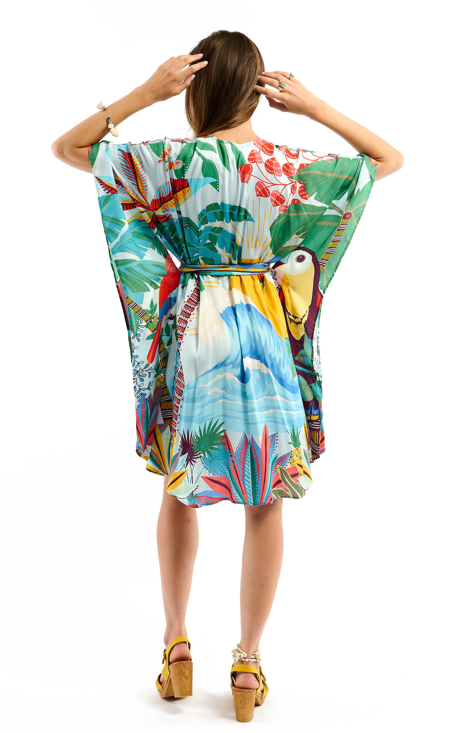 The RAGIA dress can be worn loose-fitting for a flowing silhouette, or belted to emphasize the waist - the choice is yours! It embodies the casual elegance we love, thanks in part to its wide, short sleeves. Its round collar opens into a drop, closed by a delicate little hook, and the whole is magnified by our HAWAÏ print where bright parrots, birds of paradise, date palms and abundant jungle explode on a vibrant background, bathed in sunlight and punctuated by the curve of a stylized wave. Available in three colors, the blue version is shown here.