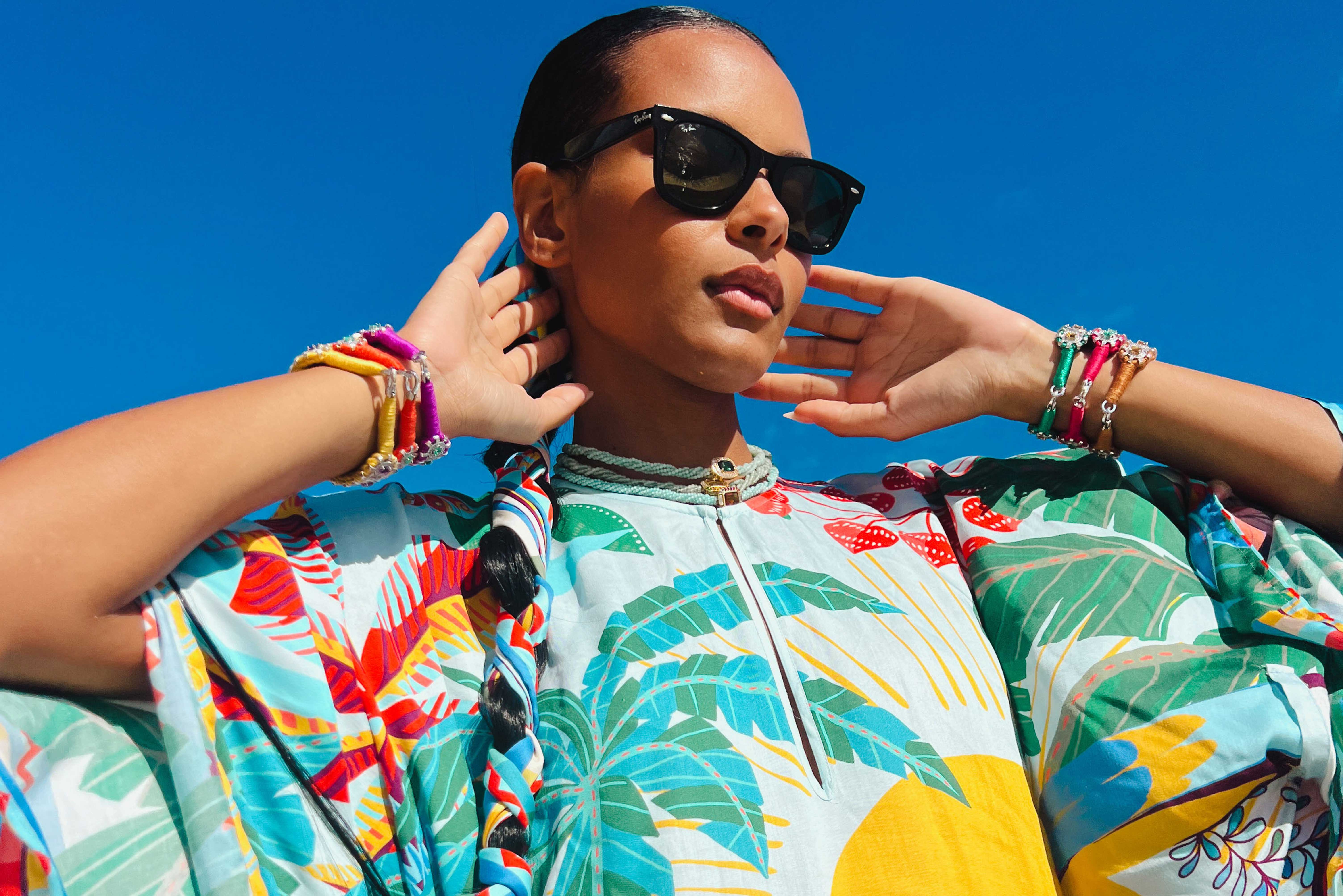 Solar yellows make this season's prints vibrate like a sunset over the bay of Rio. An explosion of tropical hues dresses our iconic shirts and wonderful scarves in a spirit both wild and Balearic, between lush jungle and infinite horizons. Long caftans are adorned with golden beaded embroidery evoking dancing palms. As for hats, bags and clutches, they enter the dance, as colorful as the streets of Salvador, as festive as a Rio carnival. Richly embroidered jackets are worn with panache from sunrise to sunset, flirting with both day and night. With Rio del Sur, Wild invites you to a summer without borders, where Brazilian joy becomes material, pattern and movement.