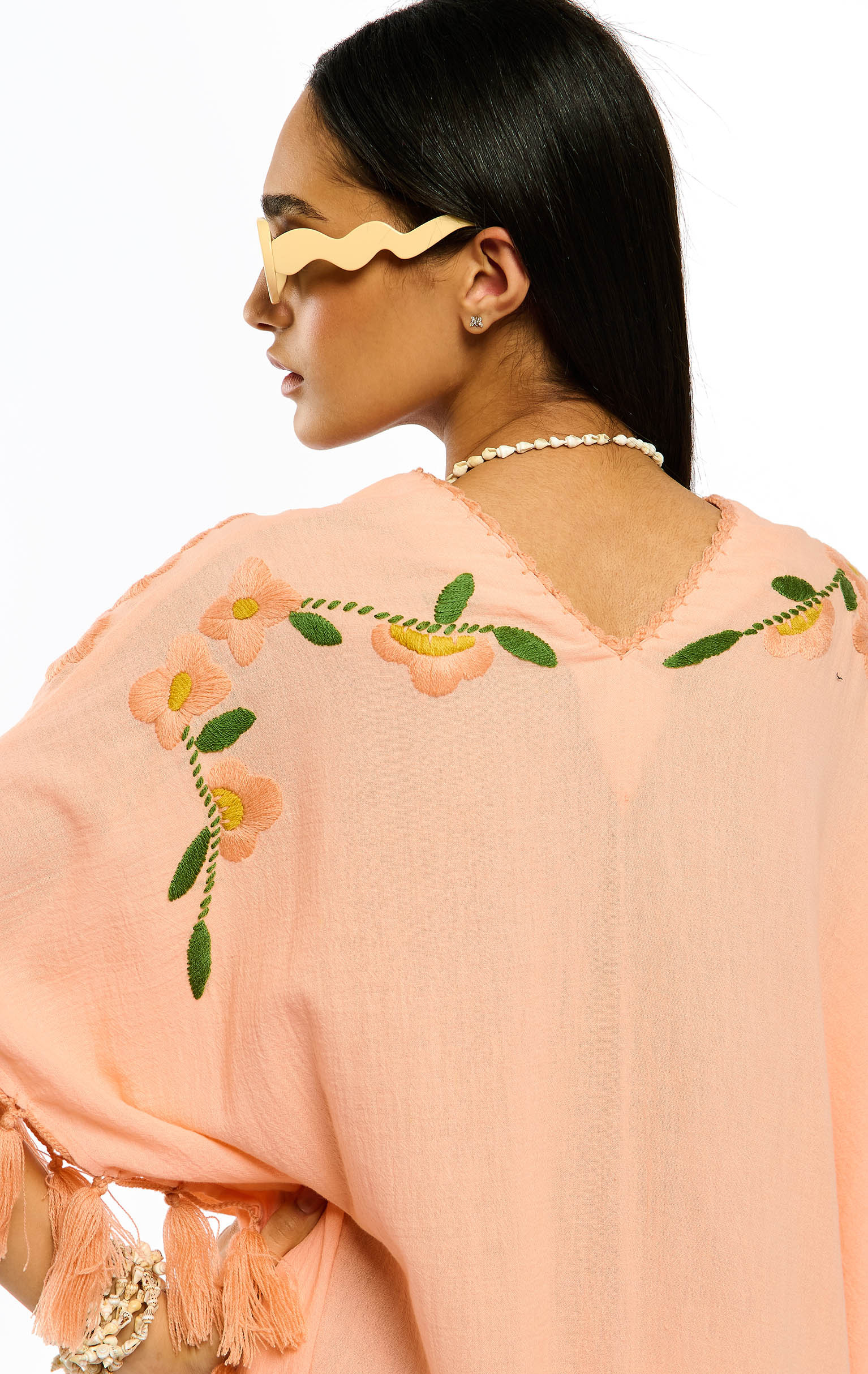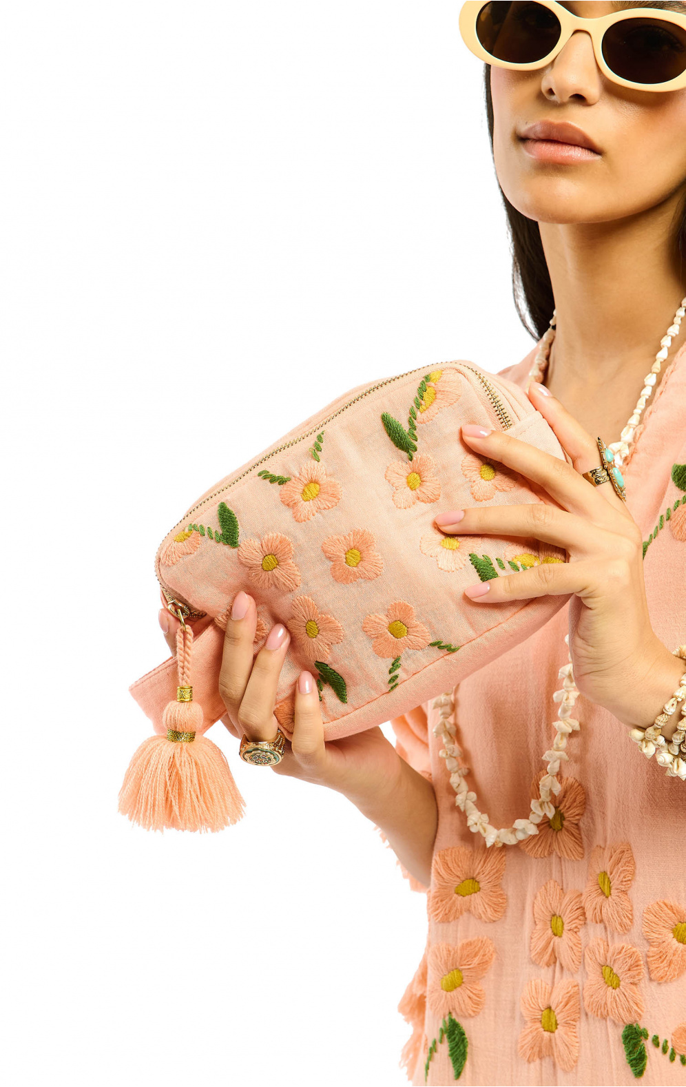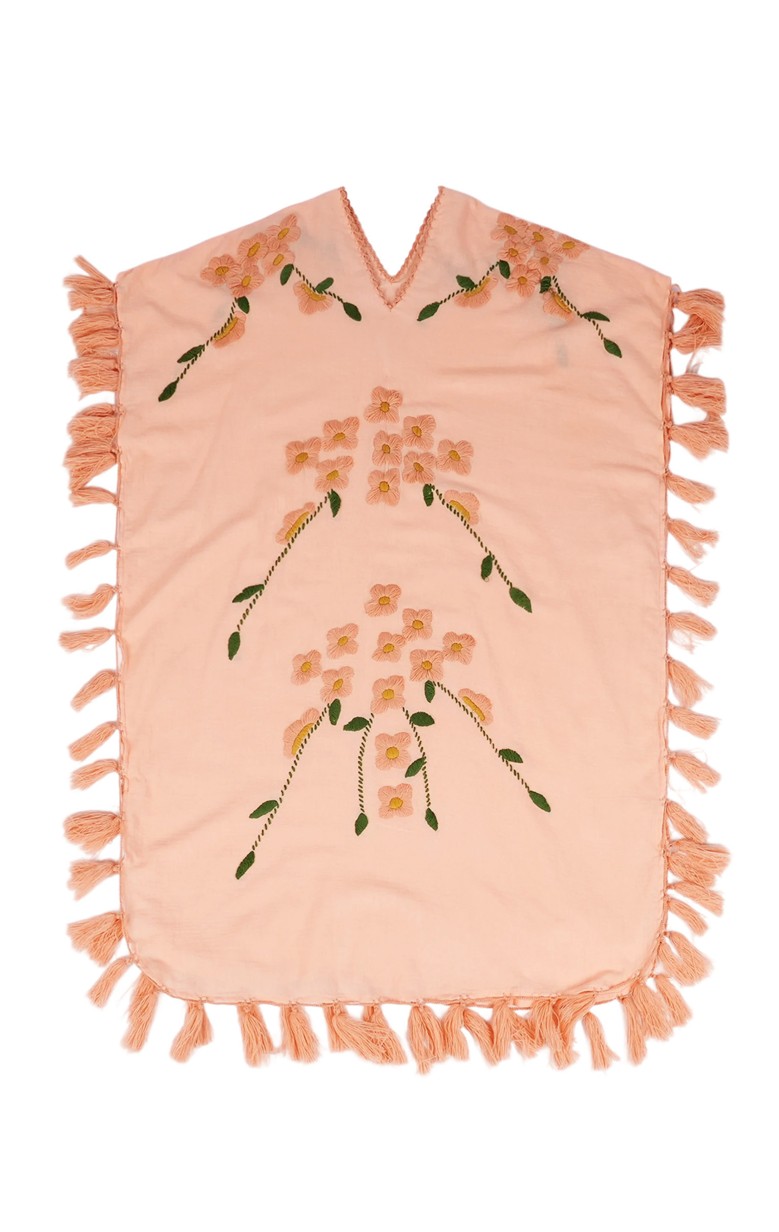 Crafted in a plain cotton fabric entirely hand-embroidered with flower power motifs on the front and shoulders, LUVIA opens delicately with a v-neck and is adorned with two lines of pompoms on each side and on the bottom. Available in four colors, the pink version is adorned with nude and bottle-green flowers.