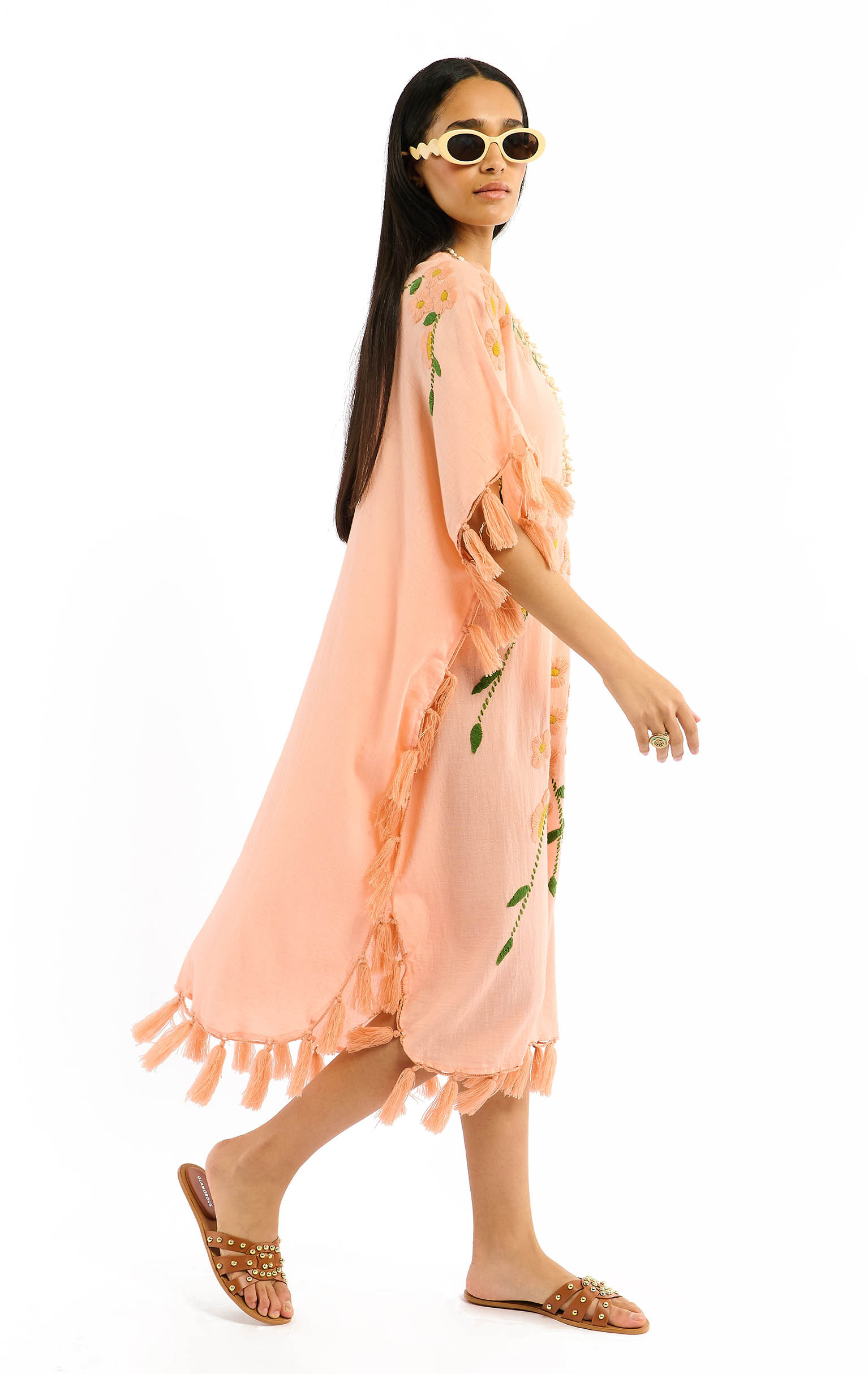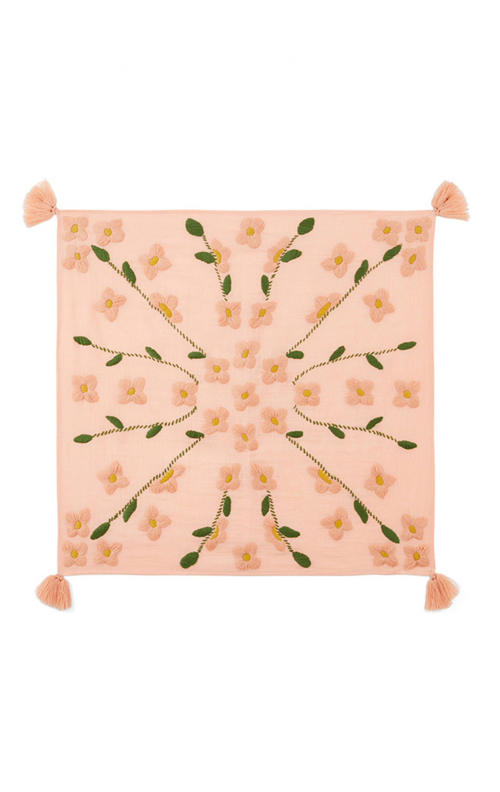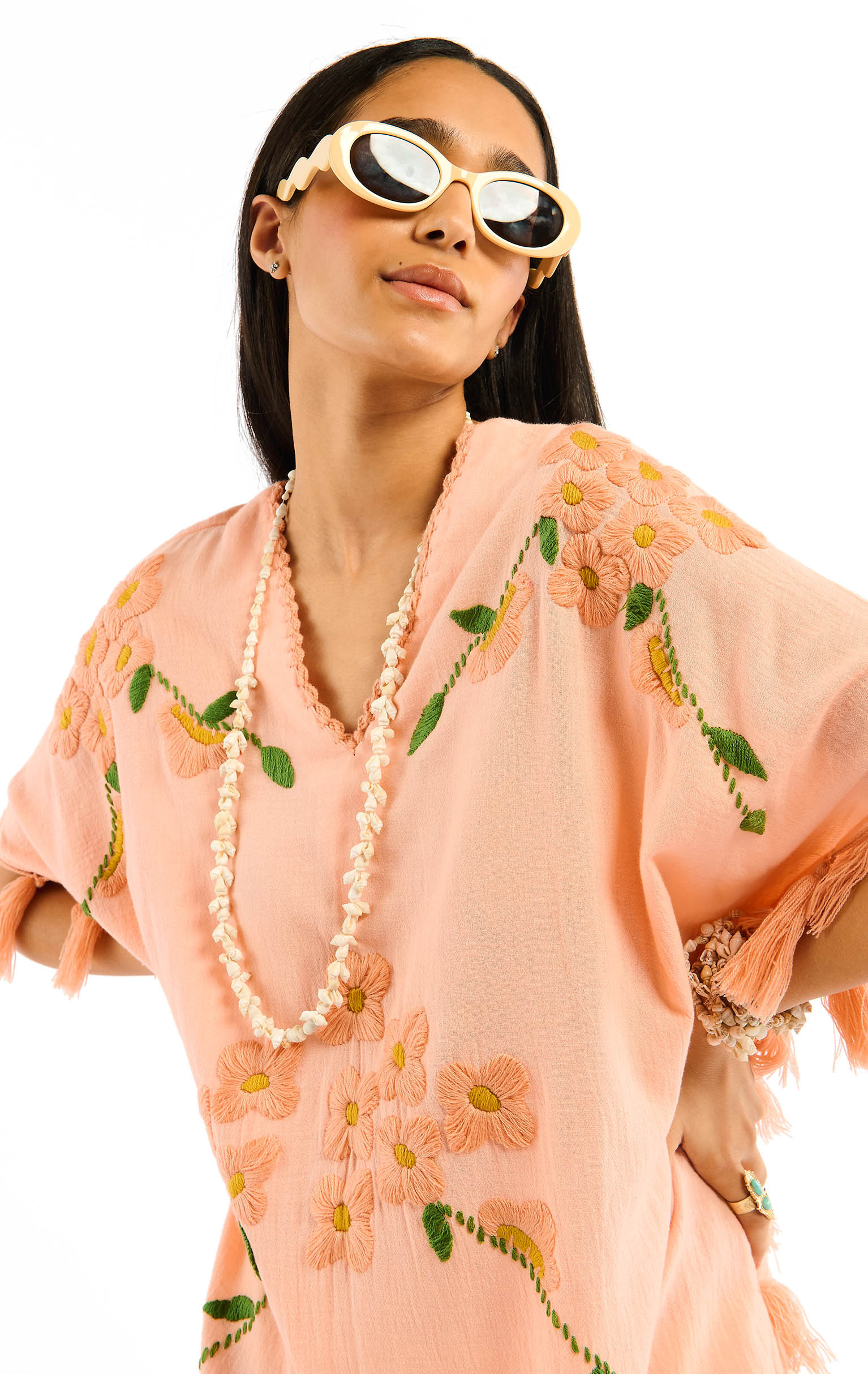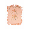 Crafted in a plain cotton fabric entirely hand-embroidered with flower power motifs on the front and shoulders, LUVIA opens delicately with a v-neck and is adorned with two lines of pompoms on each side and on the bottom. Available in four colors, the pink version is adorned with nude and bottle-green flowers.