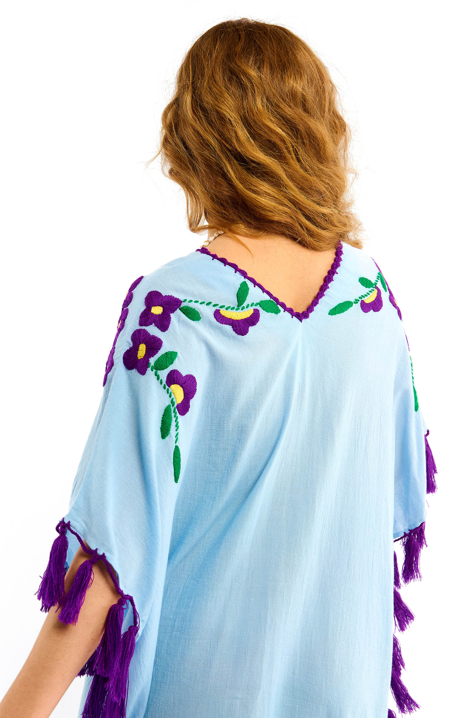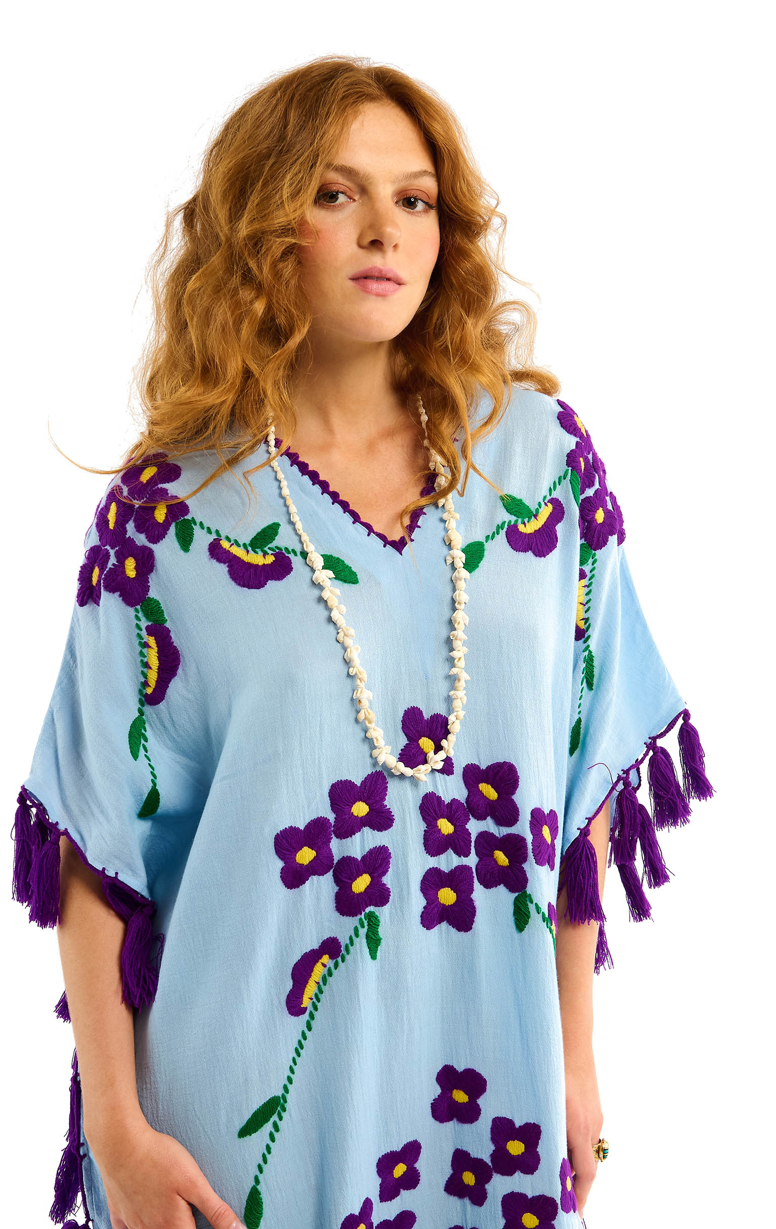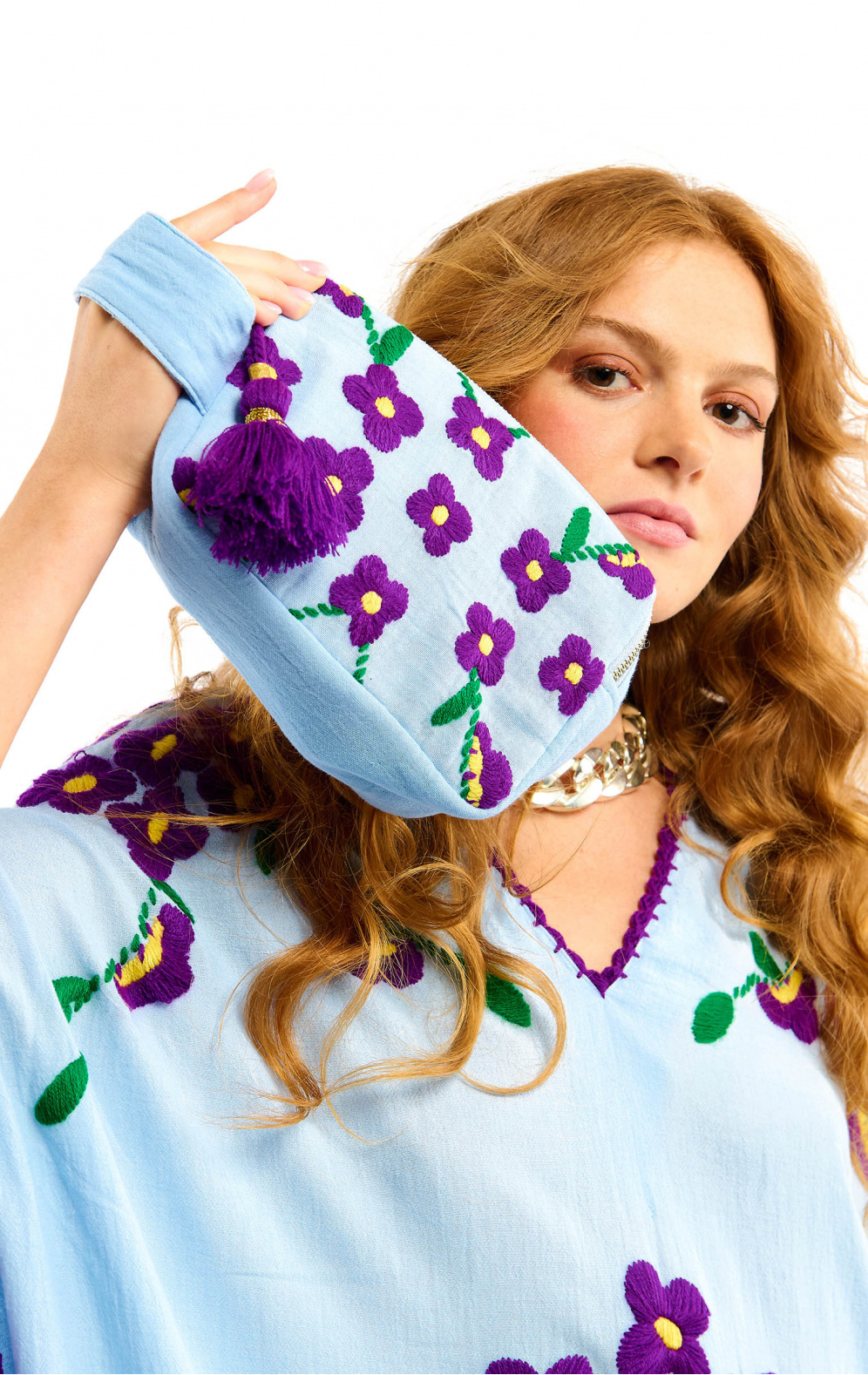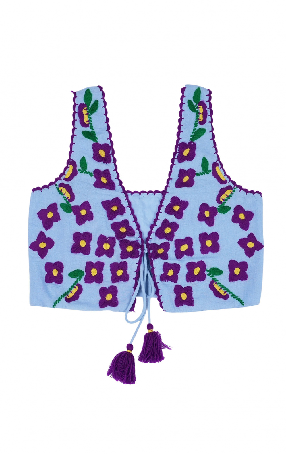 Crafted in a plain cotton fabric entirely hand-embroidered with flower power motifs on the front and shoulders, LUVIA opens delicately with a v-neck and is adorned with two lines of pompoms on each side and on the bottom. Available in four colors, the blue version is adorned with purple and yellow flowers.