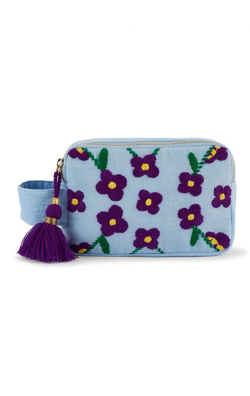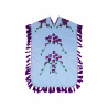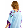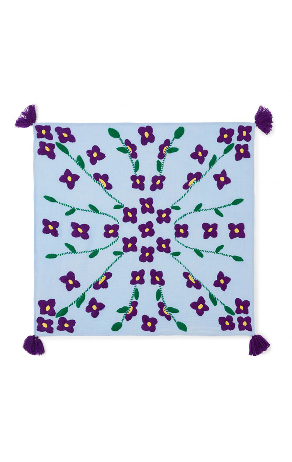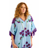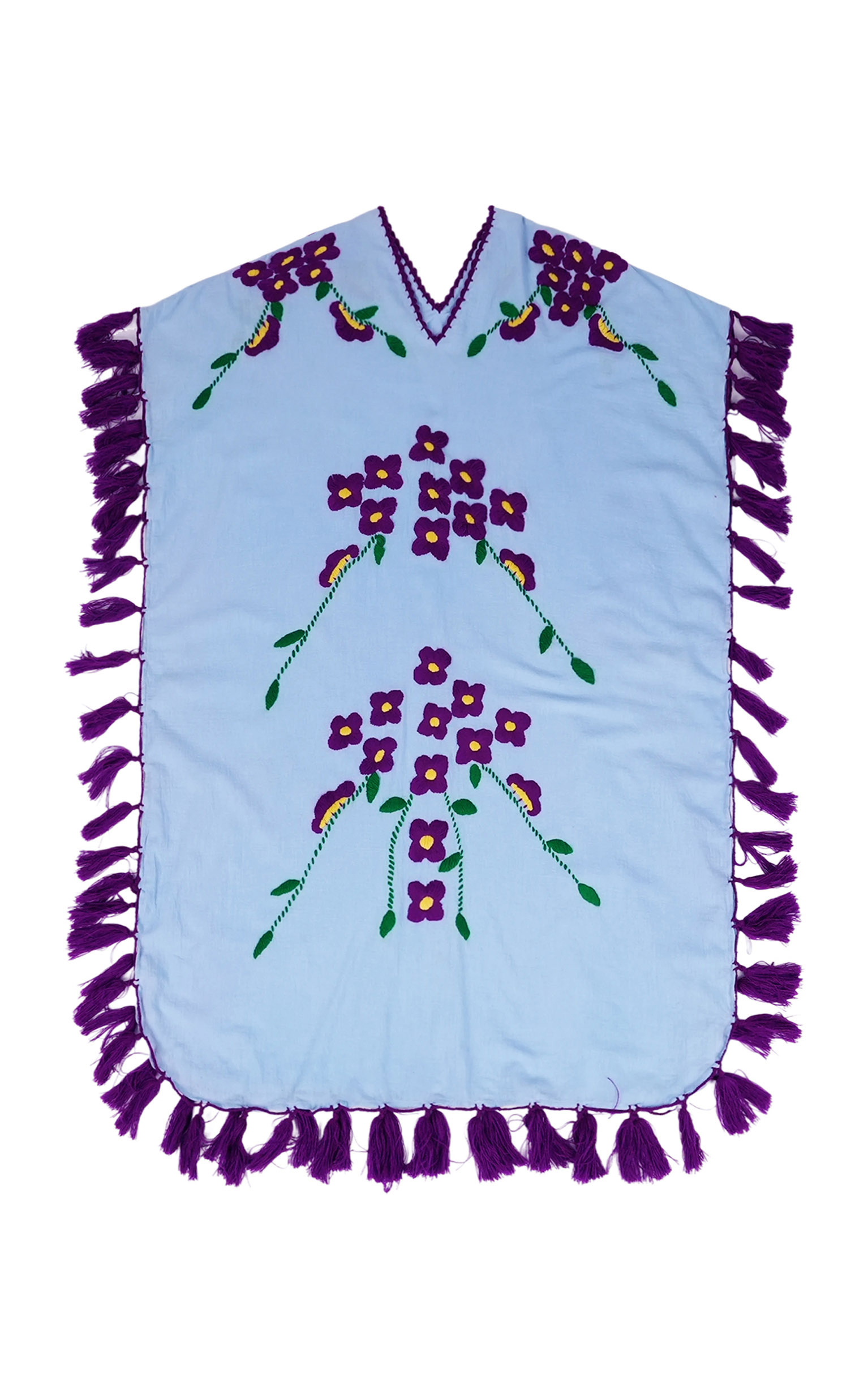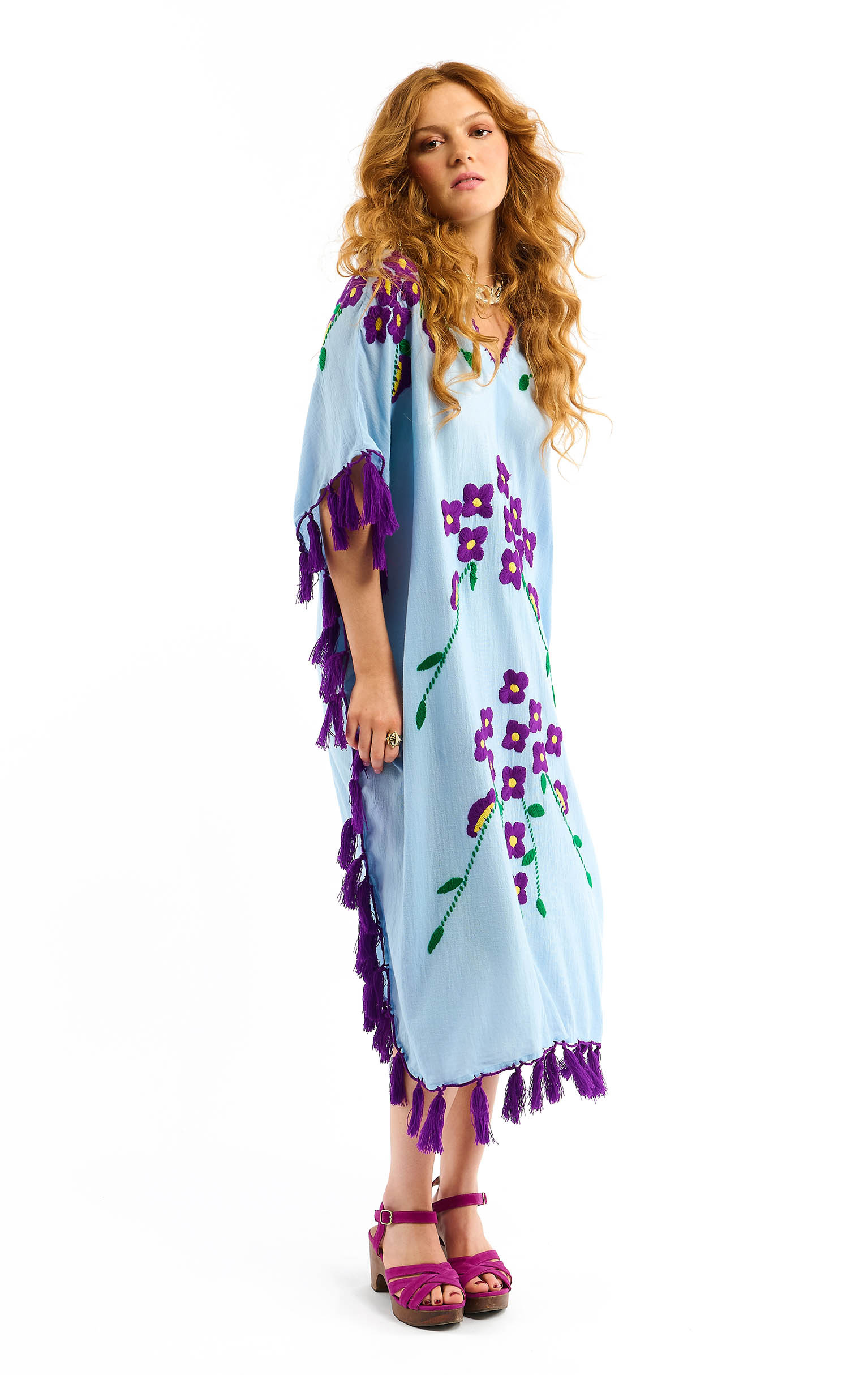 Crafted in a plain cotton fabric entirely hand-embroidered with flower power motifs on the front and shoulders, LUVIA opens delicately with a v-neck and is adorned with two lines of pompoms on each side and on the bottom. Available in four colors, the blue version is adorned with purple and yellow flowers.