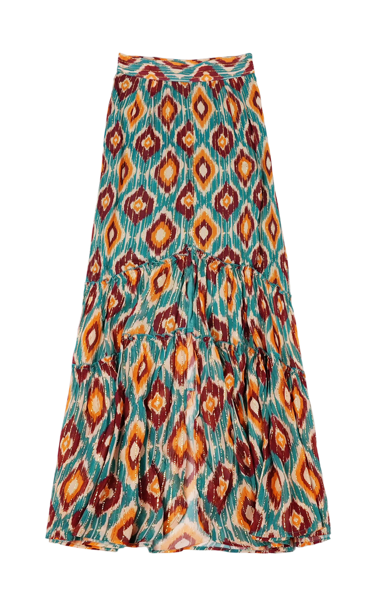 Entirely adorned in our chocolate, beige, turquoise and ochre ikat print and interpreted in a bohemian aesthetic with gypsy accents, the TERRY skirt embodies a sunny, colorful summer, just the way we like it at Wild.