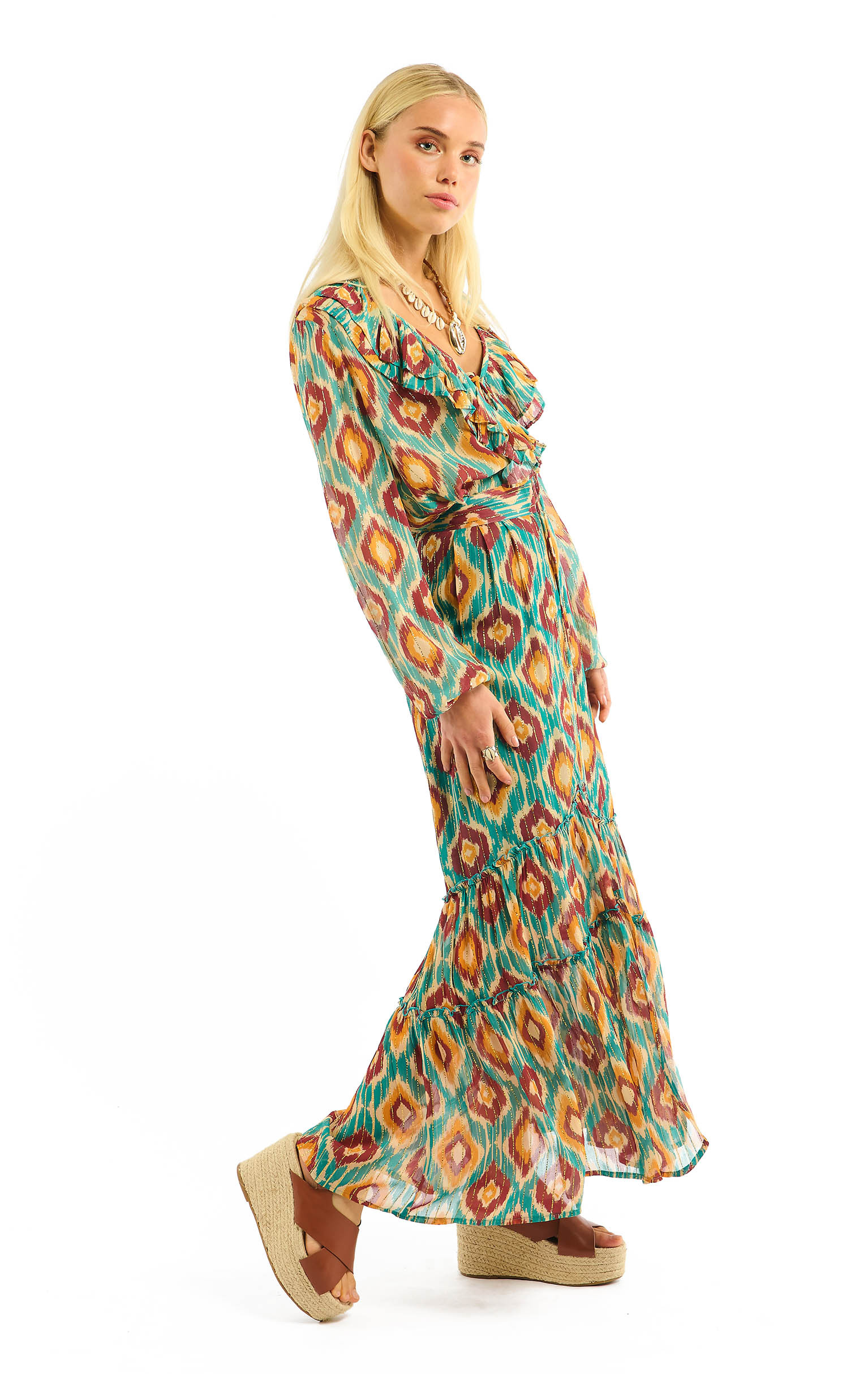 Airy thanks to its light viscose, lined on the upper part of the skirt, TERRY is adorned with ruffles that twirl with your movements and desires. It closes with a side zipper and allows for more pronounced bending thanks to a drawstring that can be tightened. A slit opens at the front, revealing the top of the leg. Lines of gold lurex run the length of the skirt, adding to its luminous character.