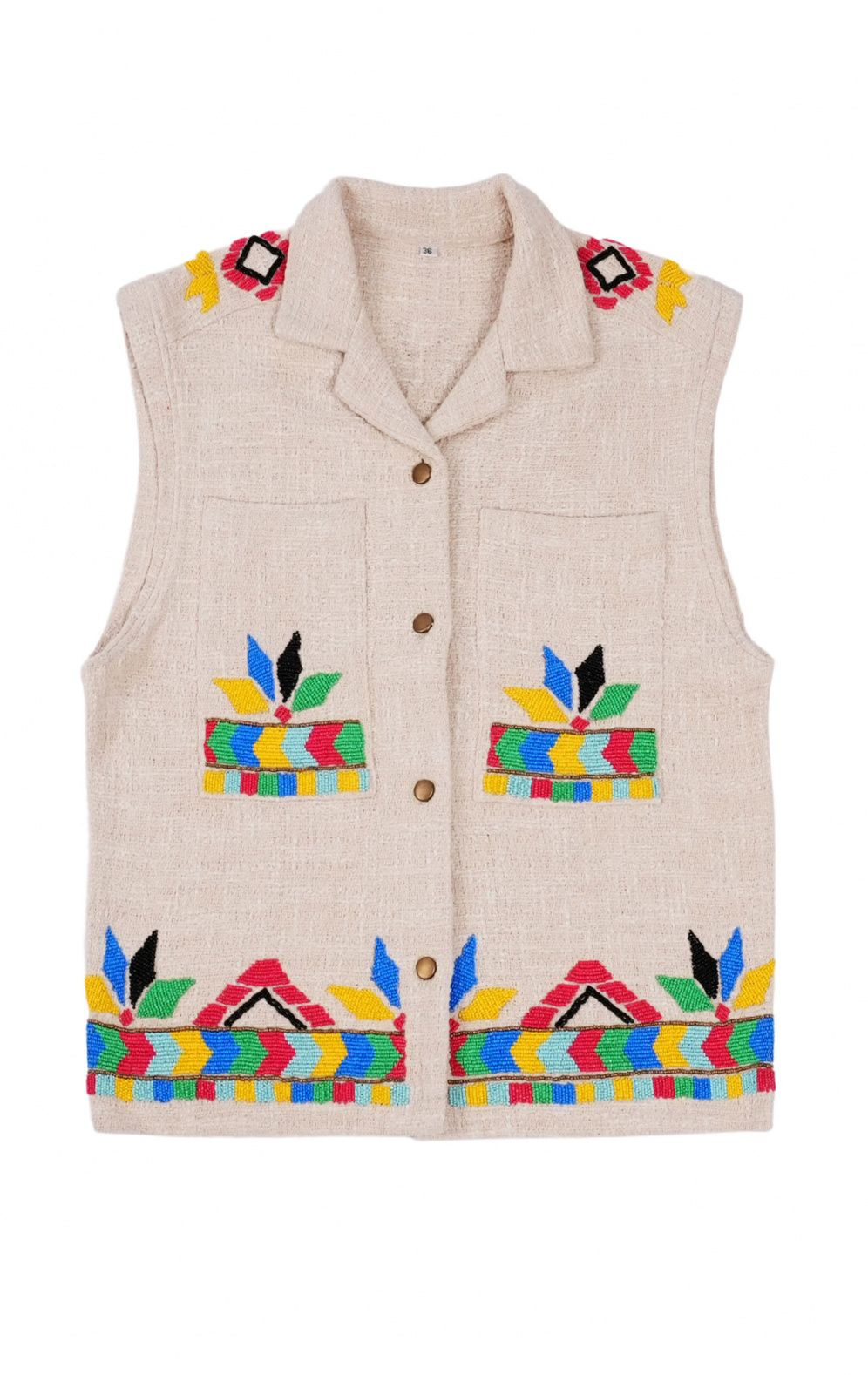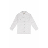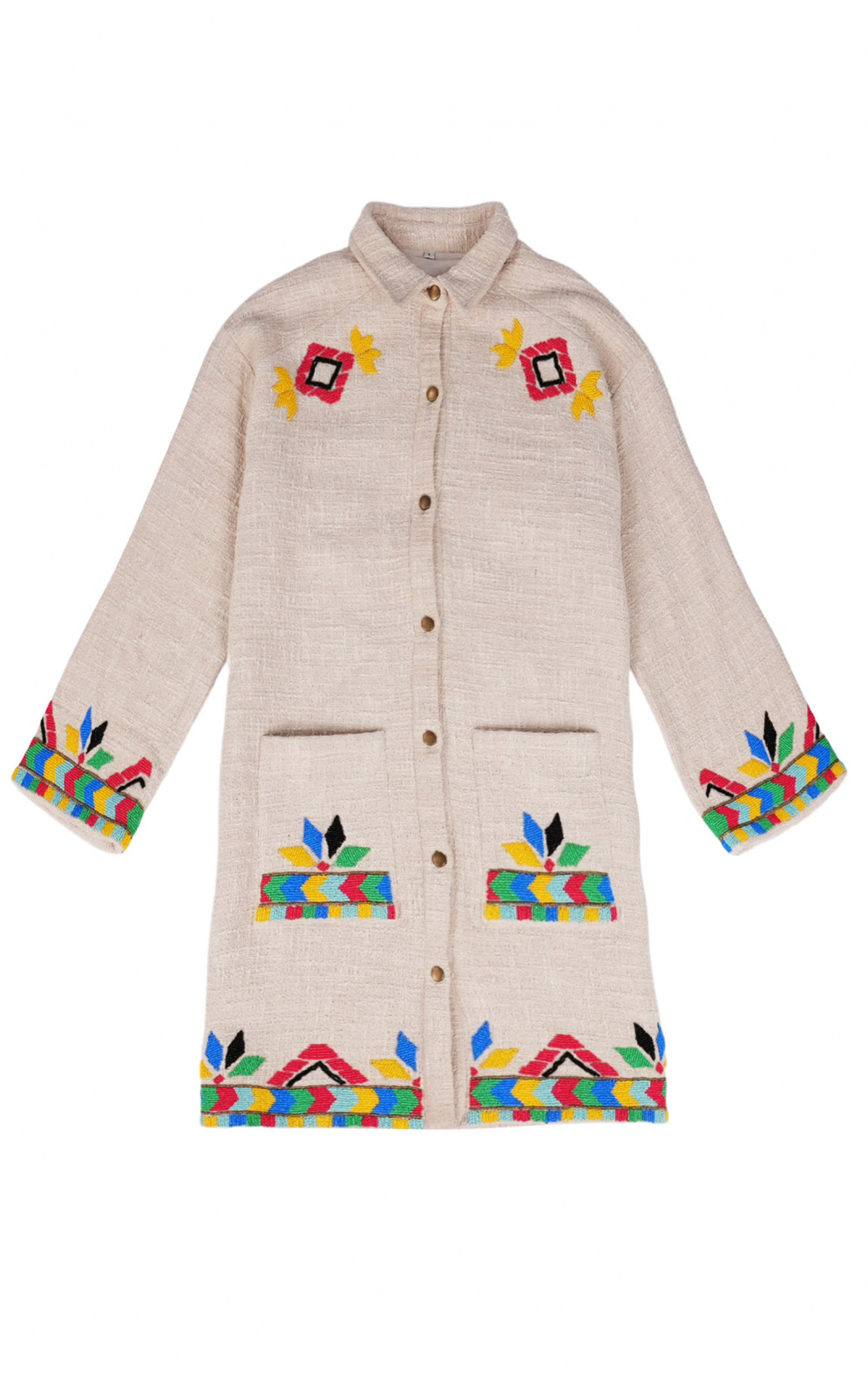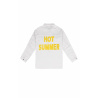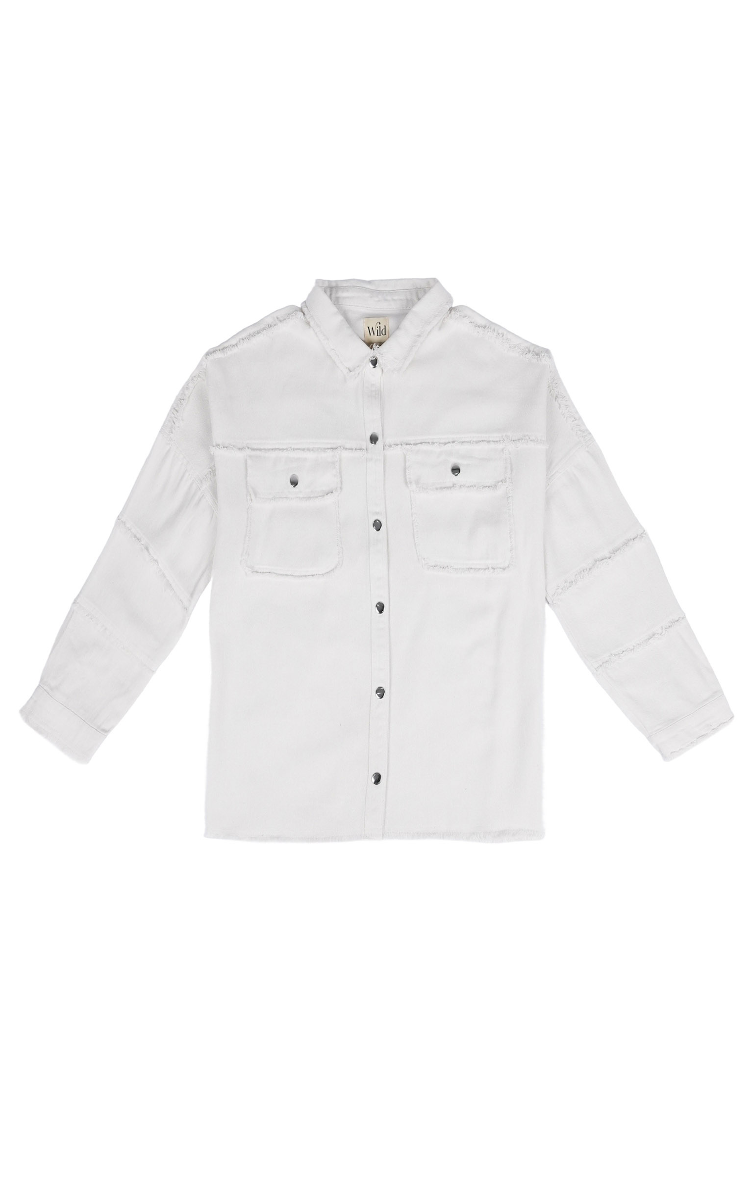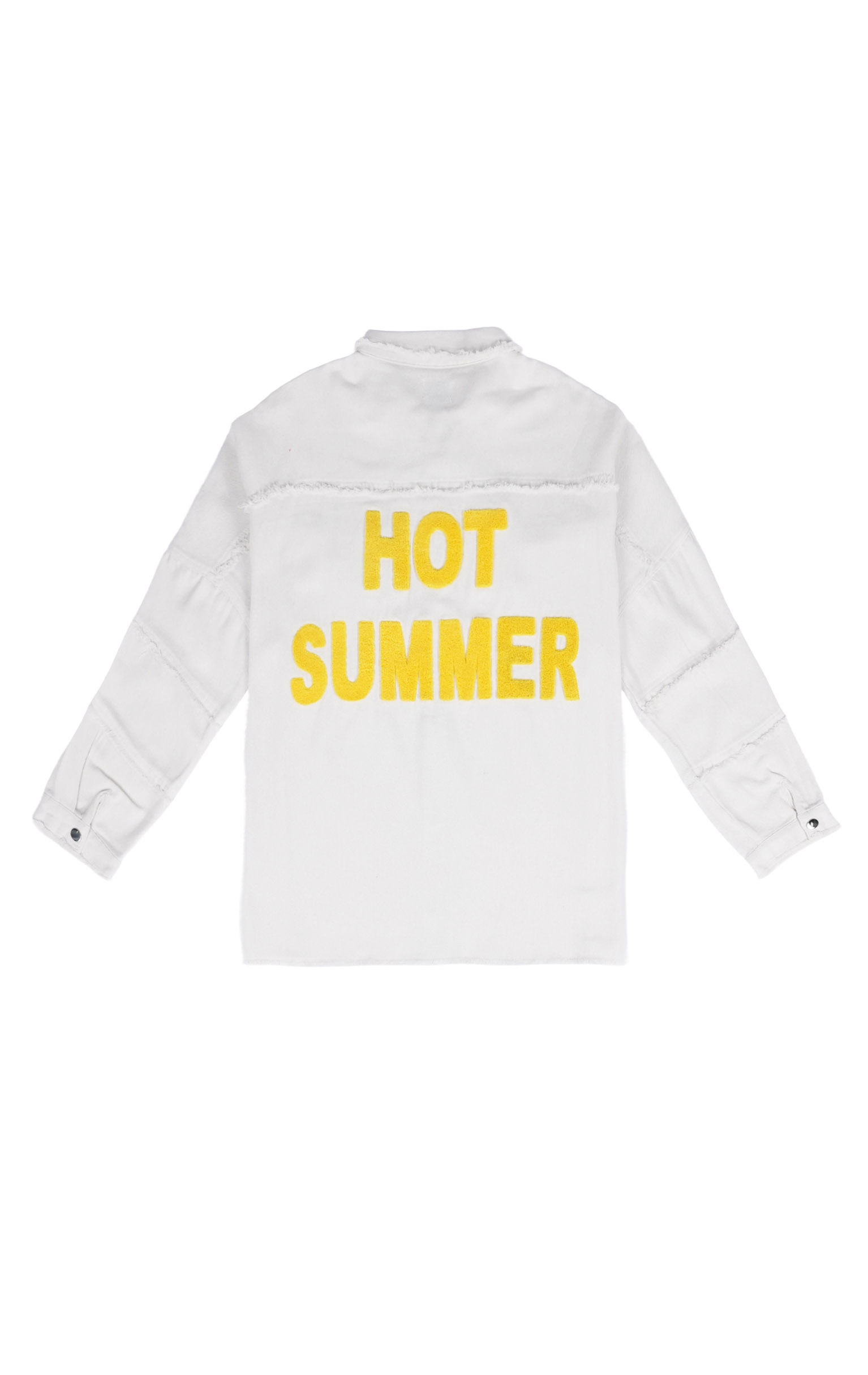 Available in seven color blocks, the JYSKO jacket is shaped like a shirt jacket, with frayed details on the collar and pockets. It fastens with silver snap fasteners, also found on the patch pockets. Shown here in white with yellow embroidery on the back.