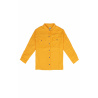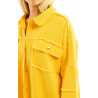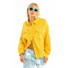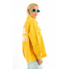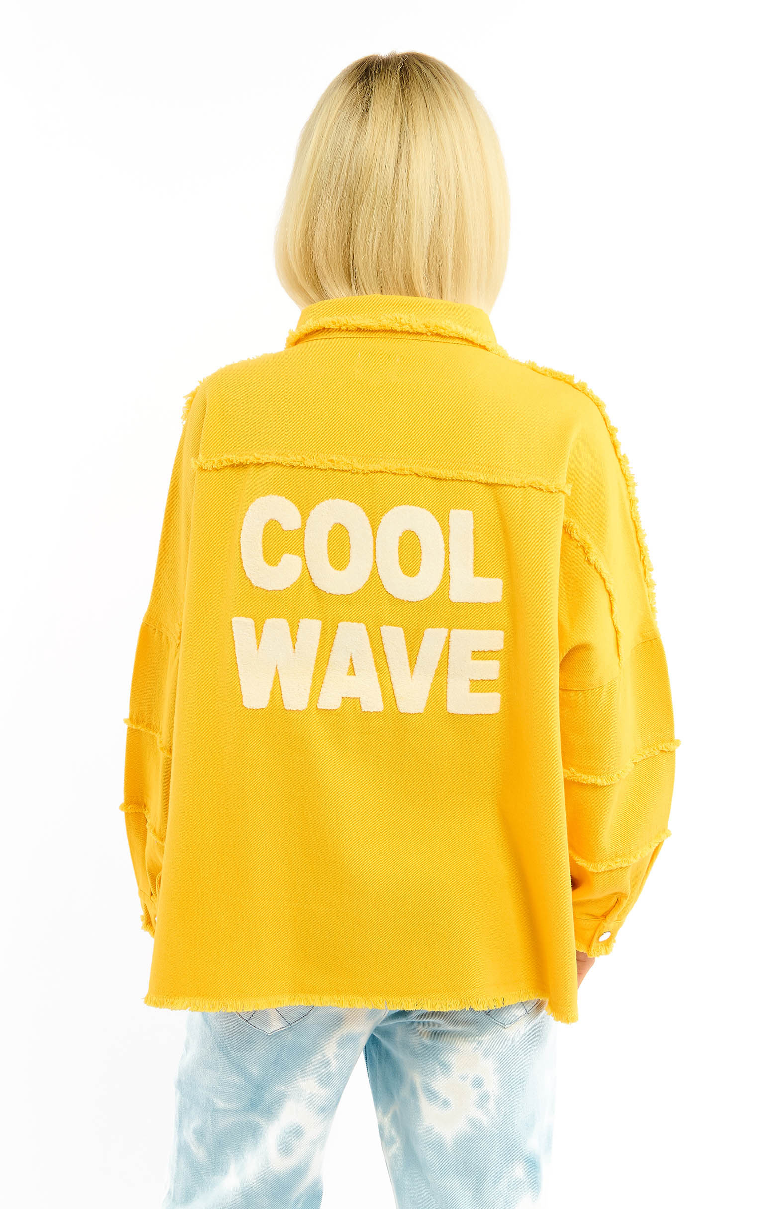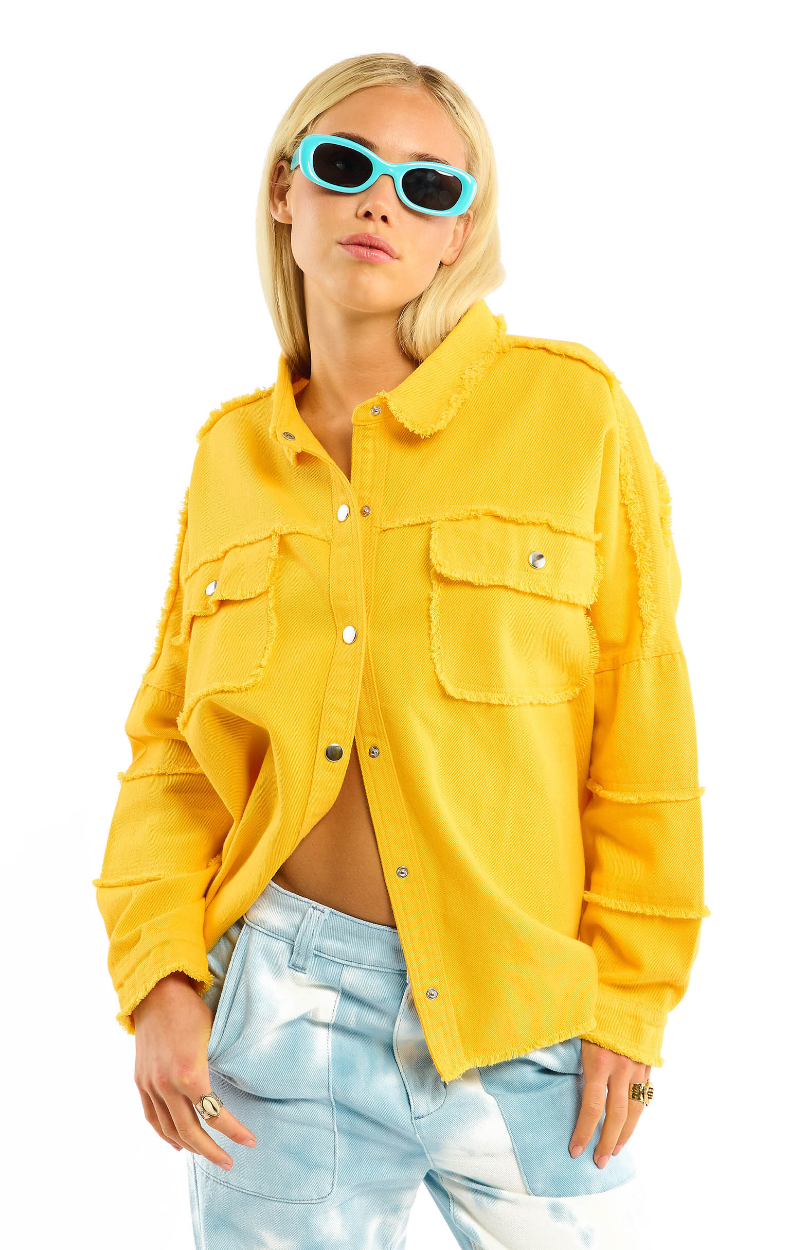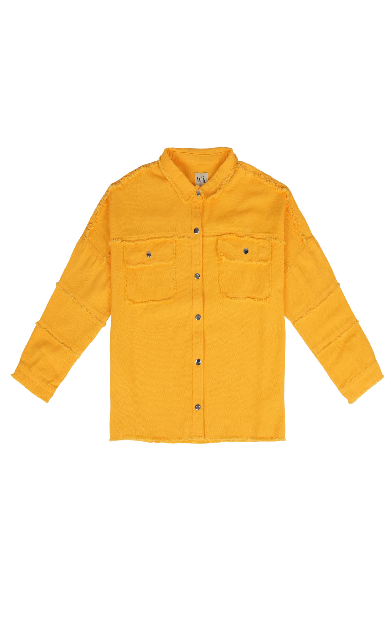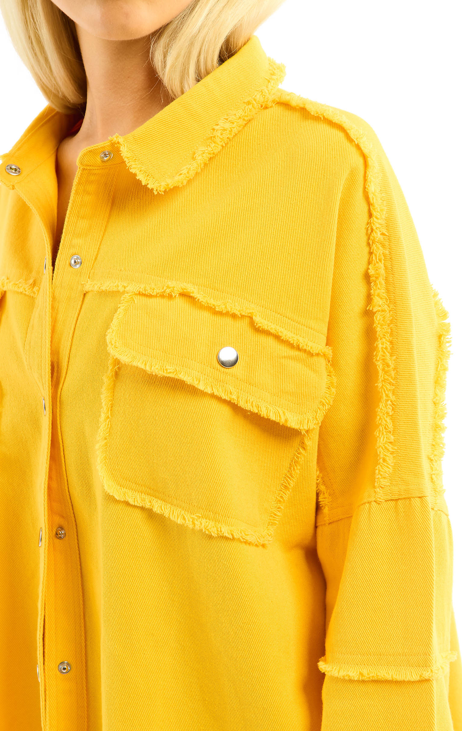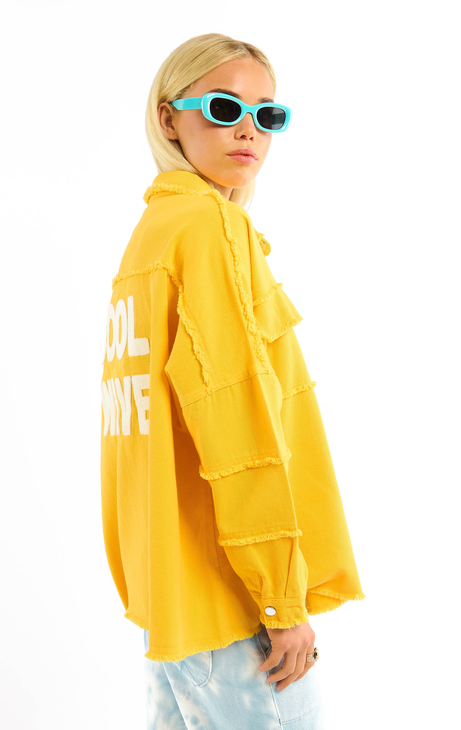 Available in seven color blocks, the JYSKO jacket is shaped like a shirt jacket, with frayed details on the collar and pockets. It fastens with silver snap fasteners, also found on the patch pockets. Shown here in yellow with white embroidery on the back.