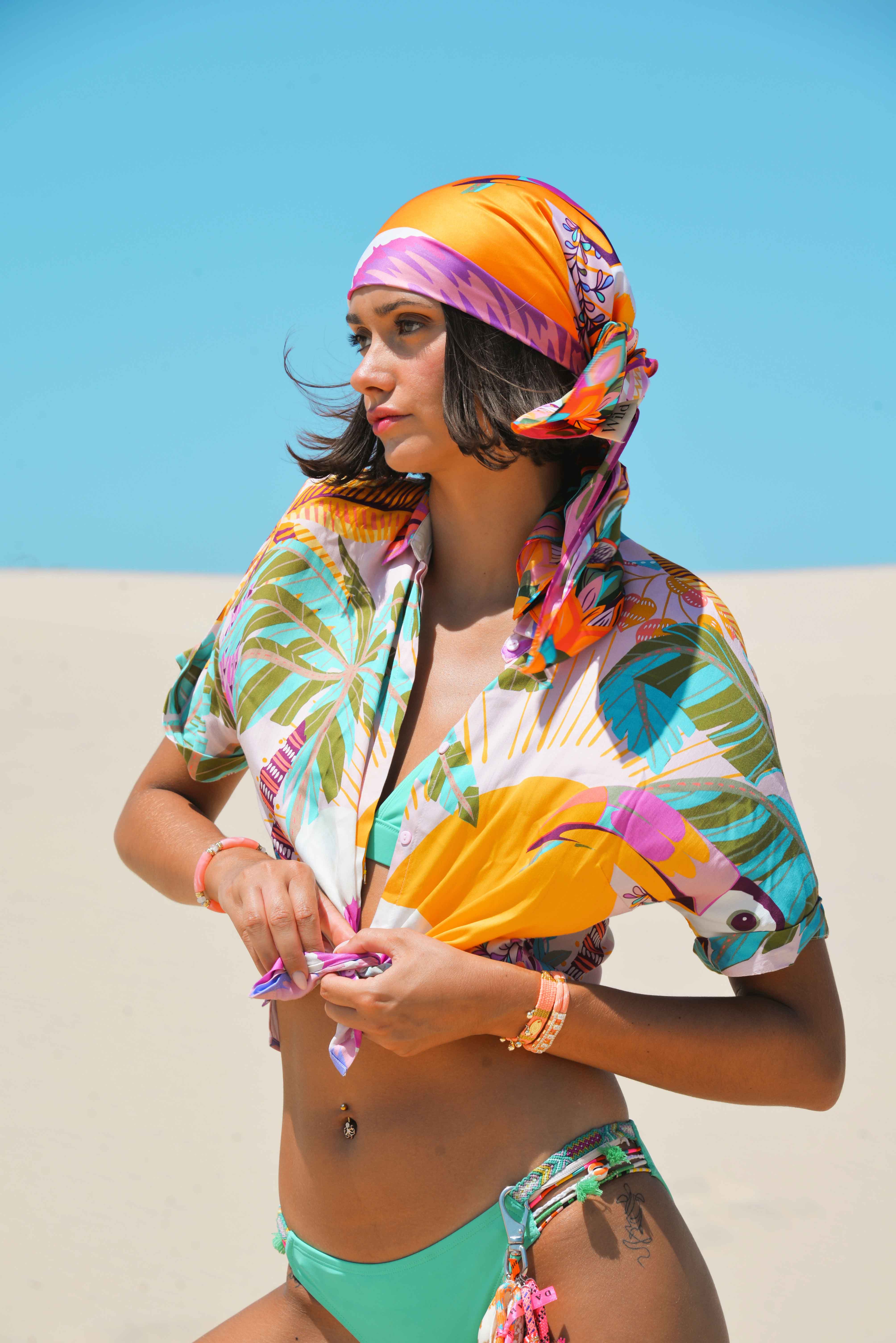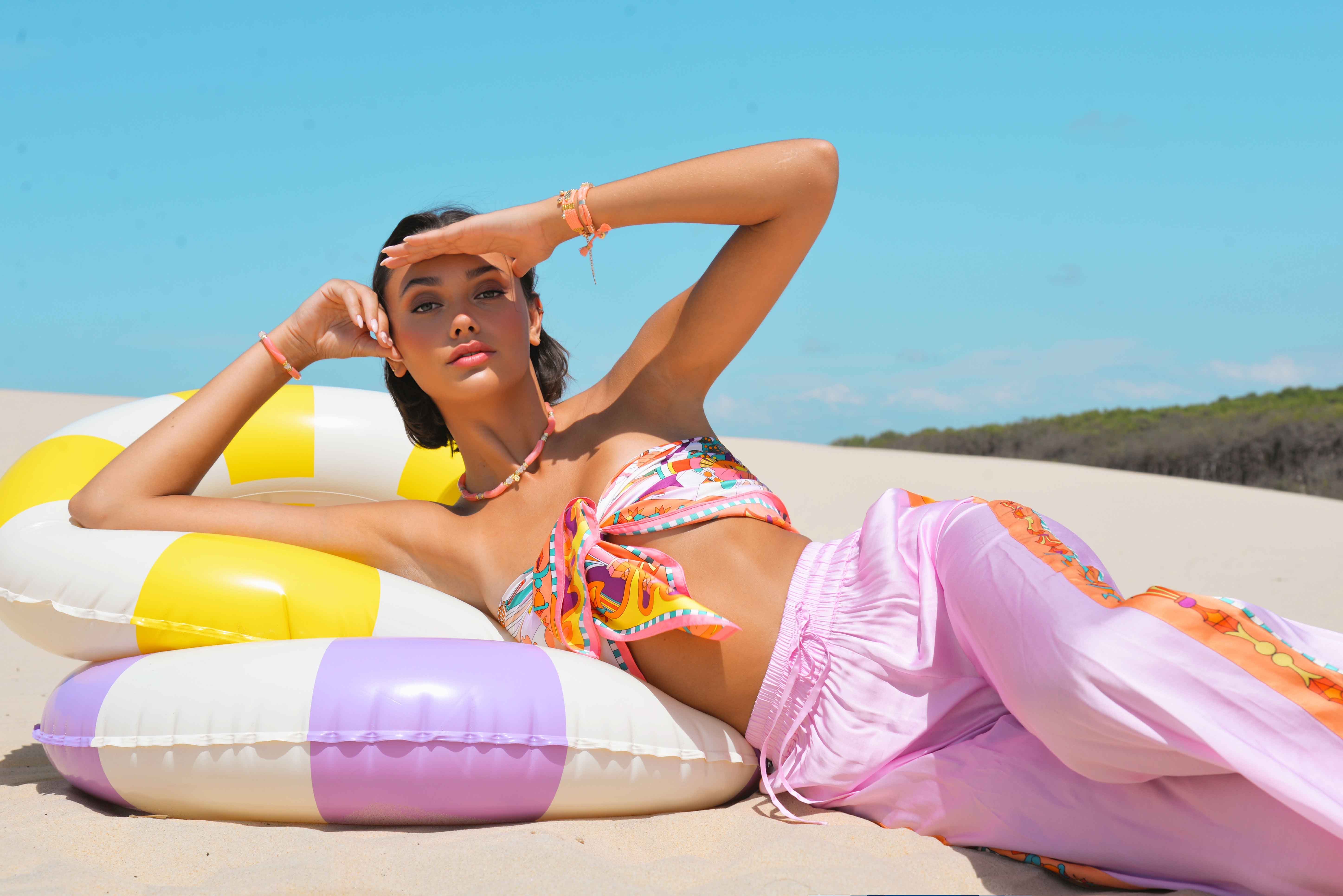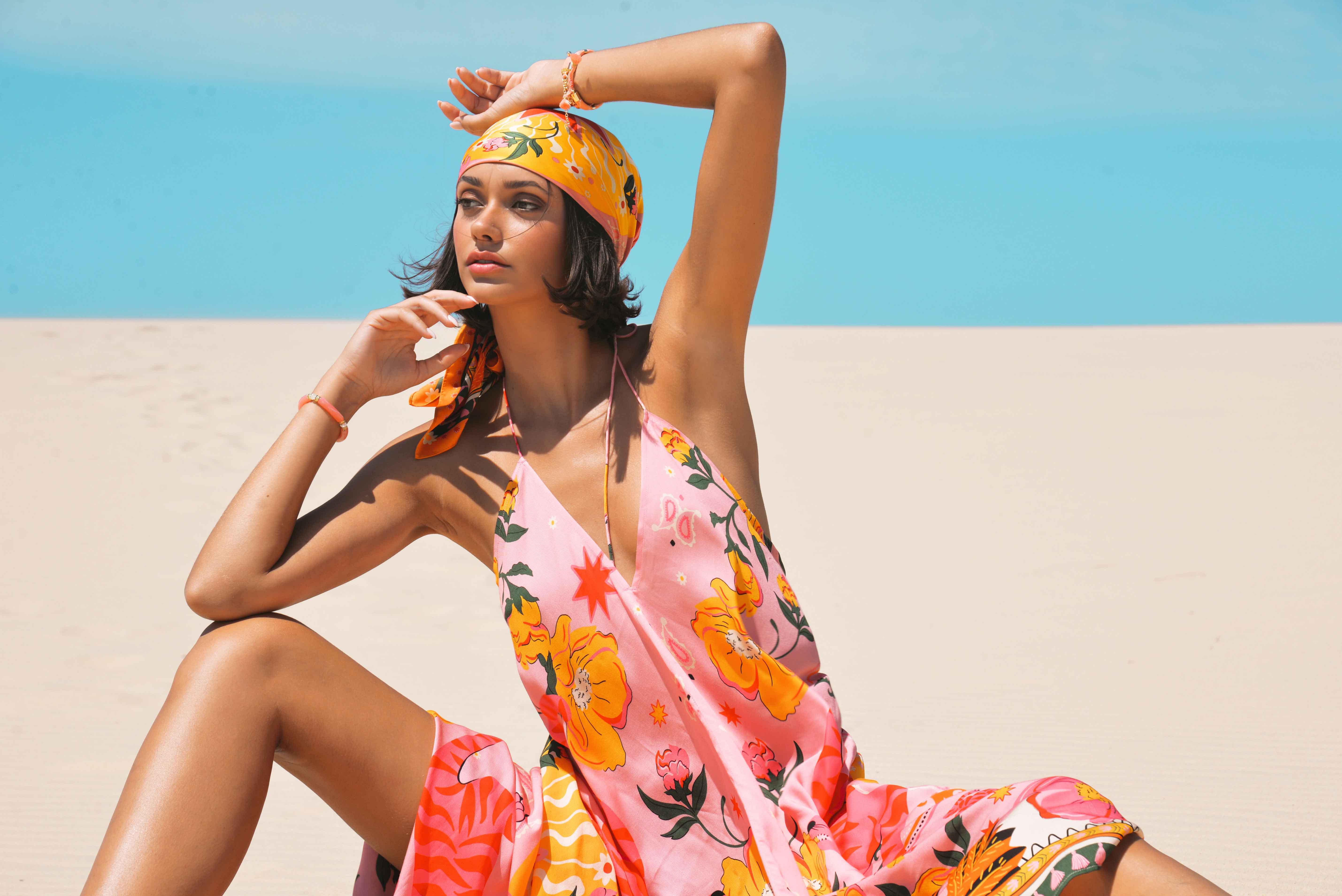 The signature print is a nod to the turquoise sea of Holbox, mixed with tropical vegetation and undulating patterns evoking Mexican waves. Bright pinks and spicy reds blend together like a beachside market, combining warmth and vibrancy.
