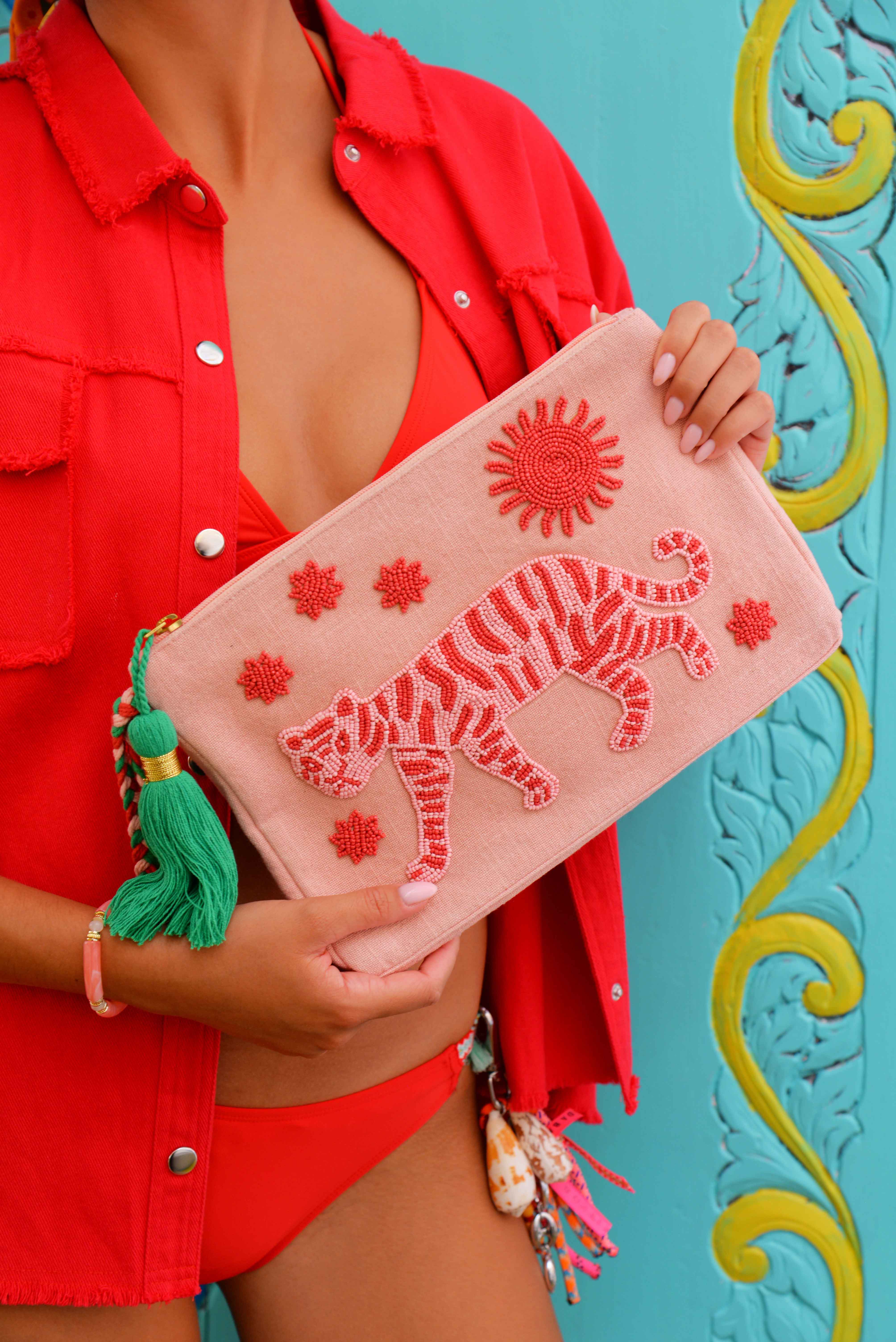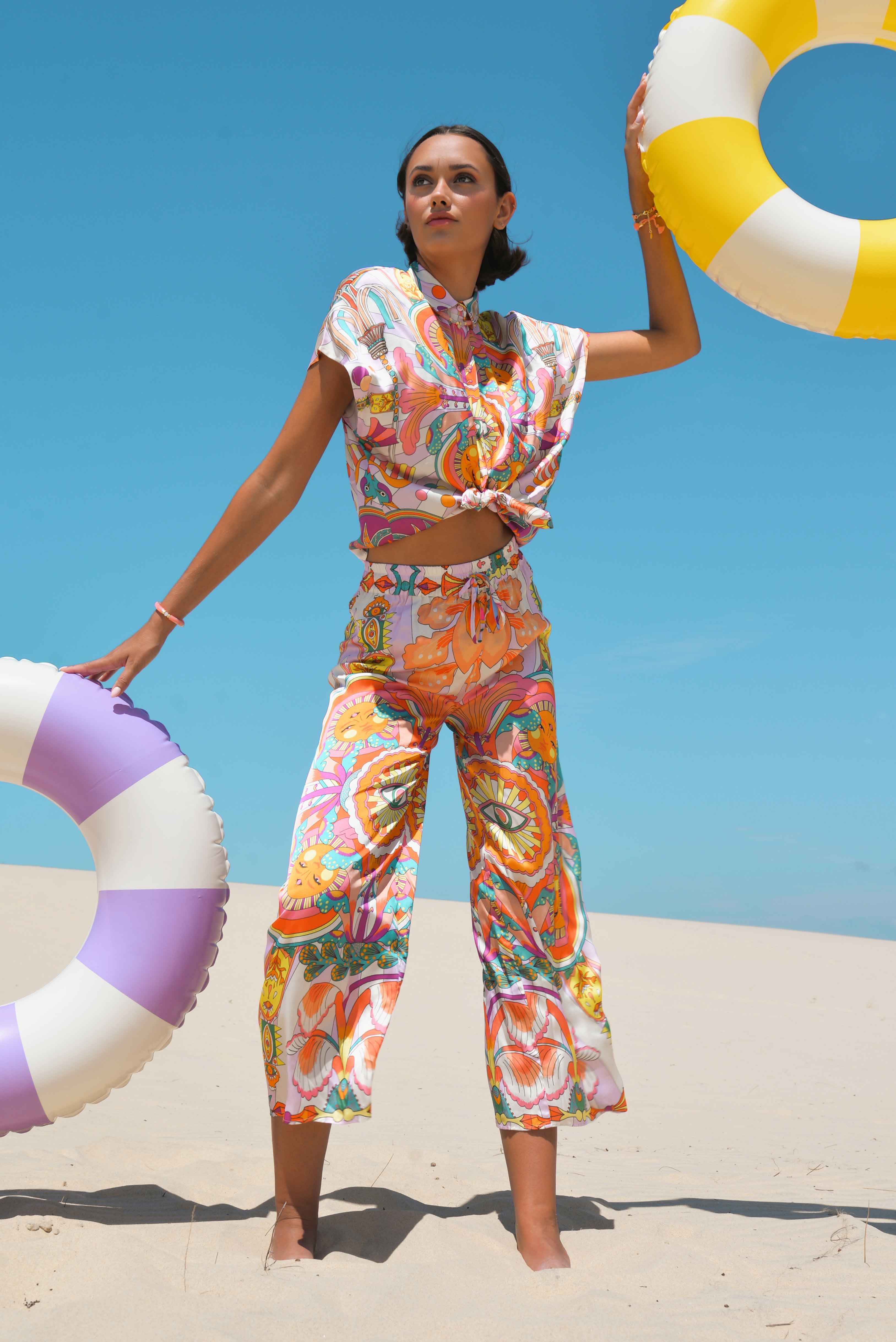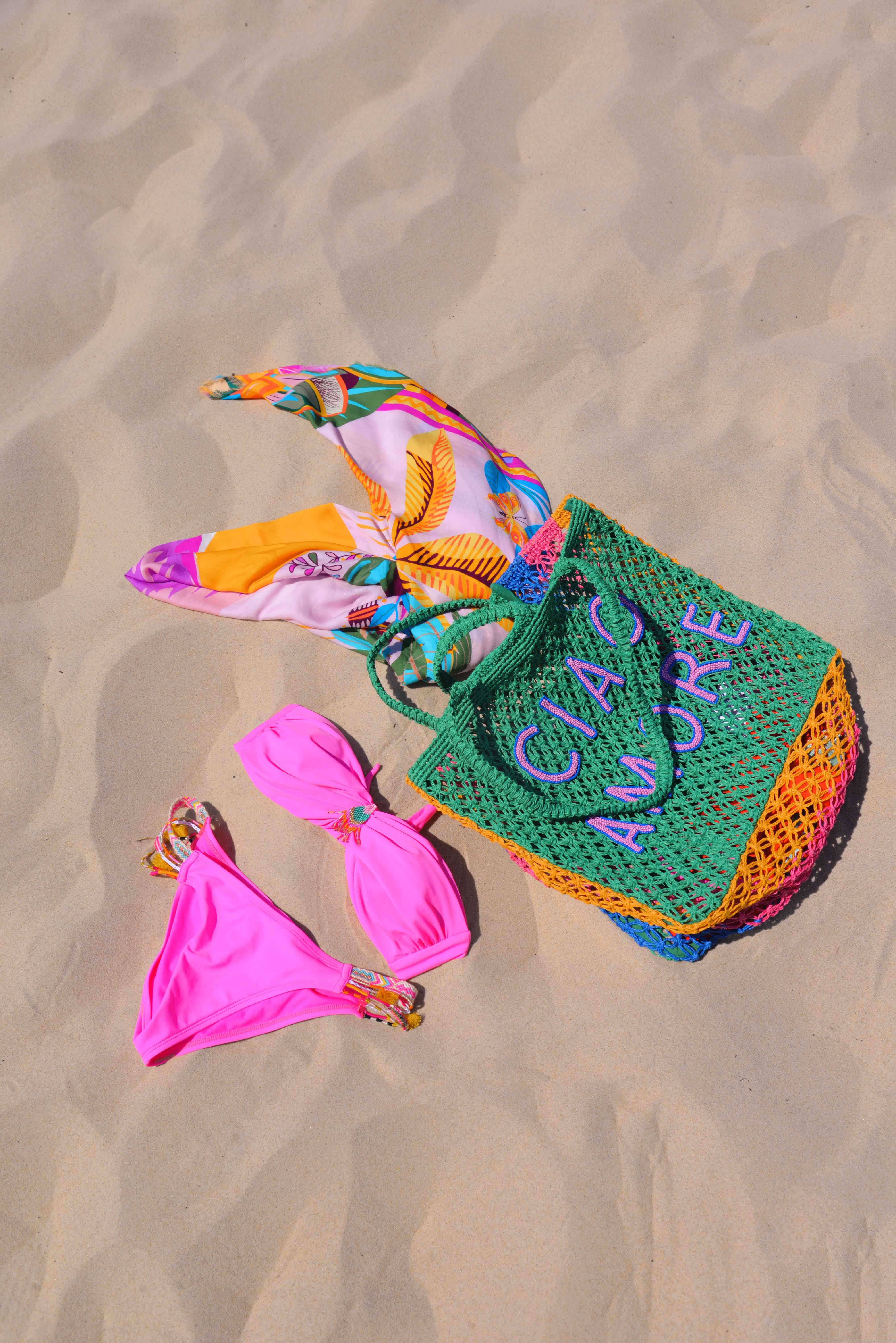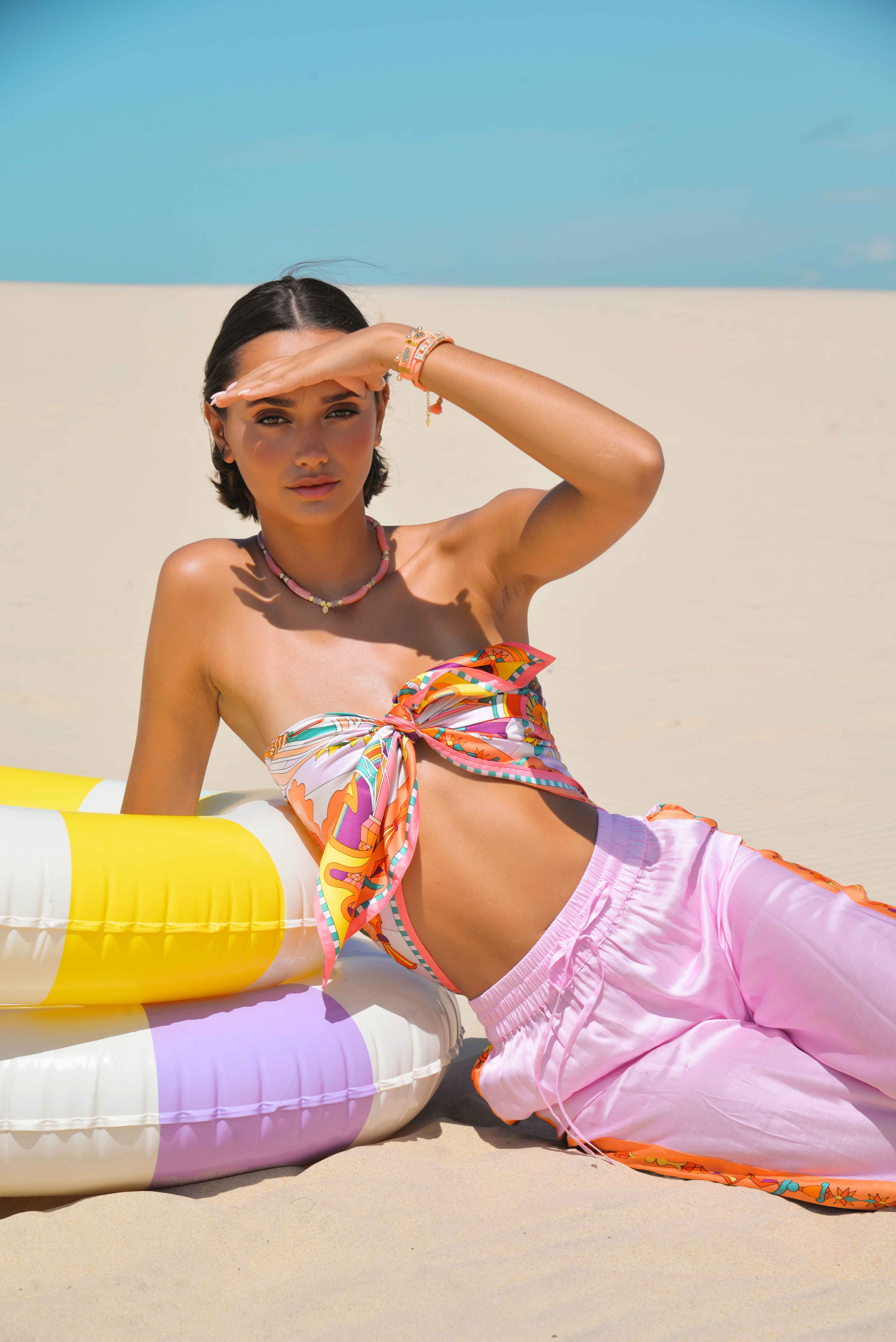 The signature print is a nod to the turquoise sea of Holbox, mixed with tropical vegetation and undulating patterns evoking Mexican waves. Bright pinks and spicy reds blend together like a beachside market, combining warmth and vibrancy.