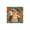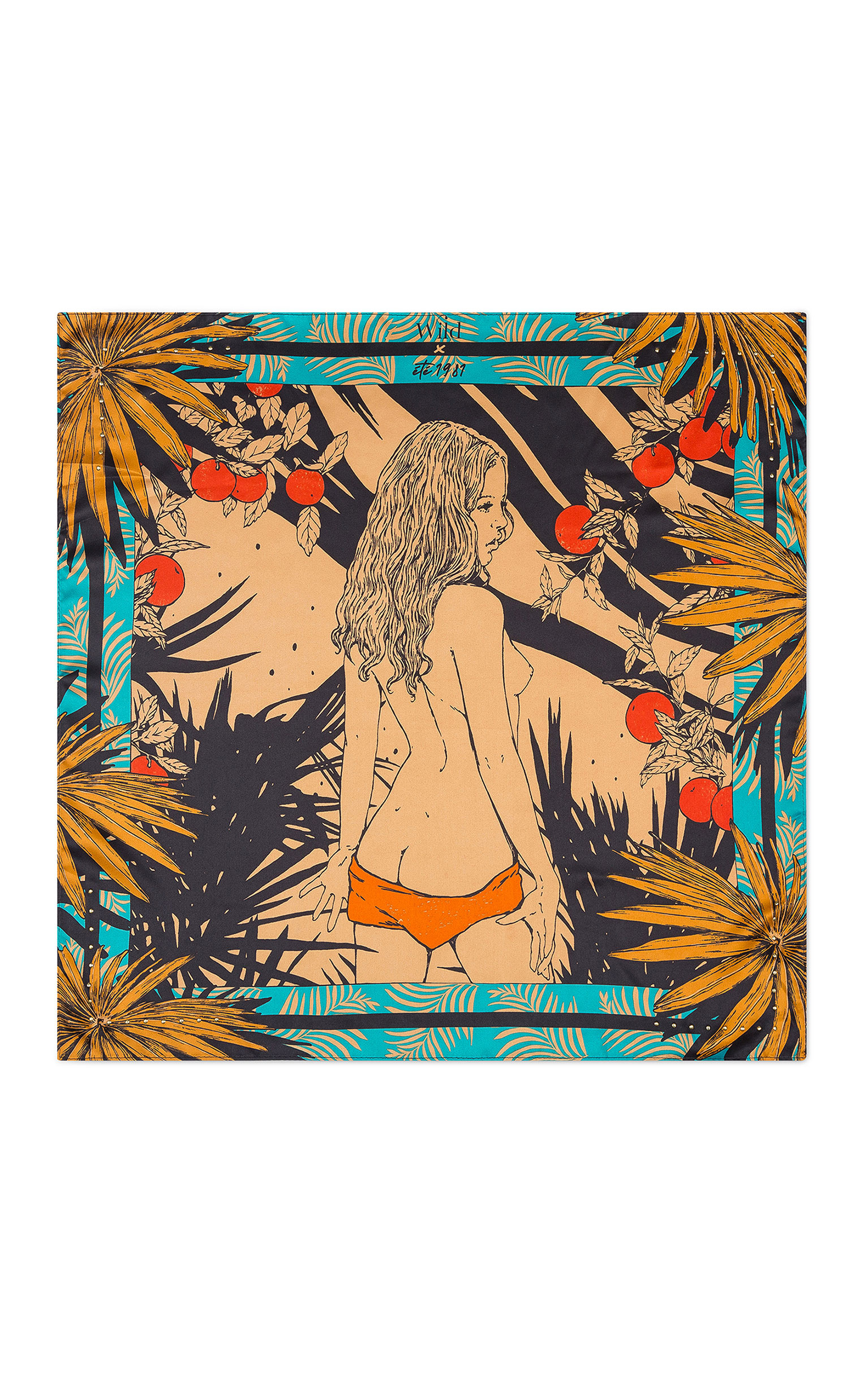 Mini scarf decorated with an original "Summer 1981" drawing by the artist. It depicts a young woman undressing in a lush garden immaculately decorated with oranges, in shades of coffee, black, turquoise, orange and coral red.