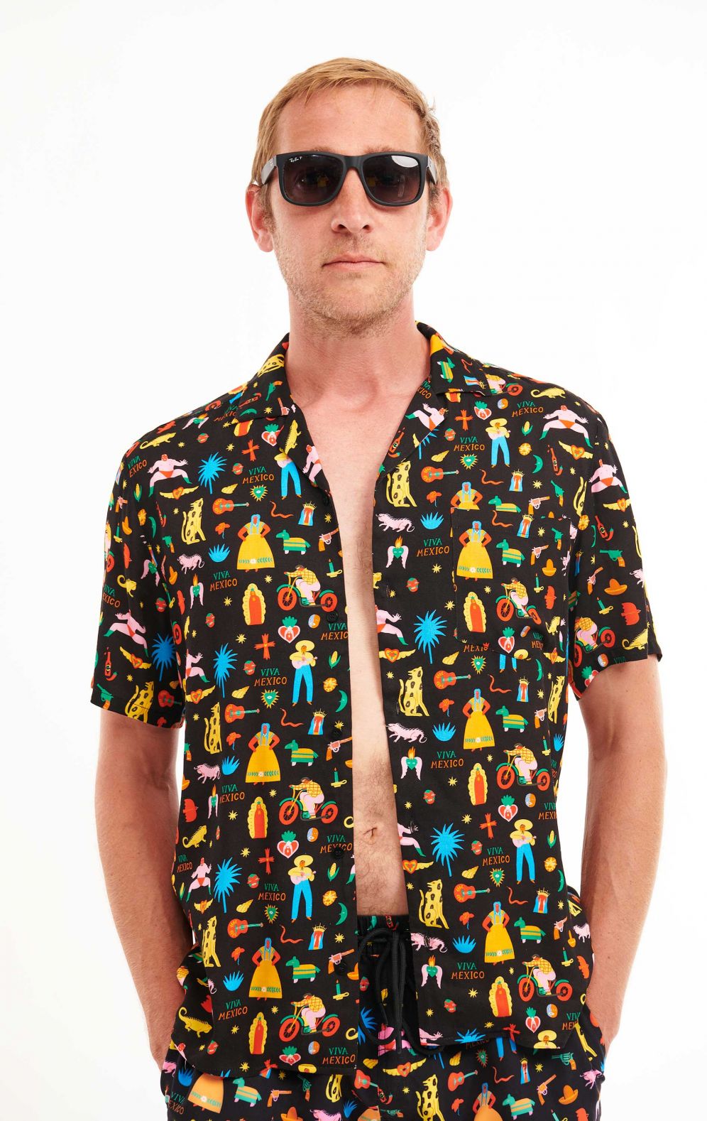 Sixties-inspired 7/8th skirt, gathered at the hips, fully buttoned with a front opening, it features our Mexican print on a black background, with sunflower yellow, explosive blue, pink and crimson red hues.