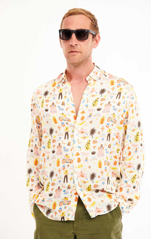 How could we not fall for this Sixties-inspired 7/8th skirt? Gathered at the hips, fully buttoned with a front opening, we love the retro look of its structure, with side pockets. With a twist, this midi skirt is completely revisited with its zany, colorful prints. A veritable ode to travel, it features our Mexican print with its emblematic Mexican pictograms: ex-voto heart, guitar, wrestler... all imagined as vitamin-packed Mexican good-luck charms. Here, the version on a cream background, with shades of sunflower yellow, black, pink and crimson red. It's the perfect skirt for walking on warm sand, with your feet almost in the water.