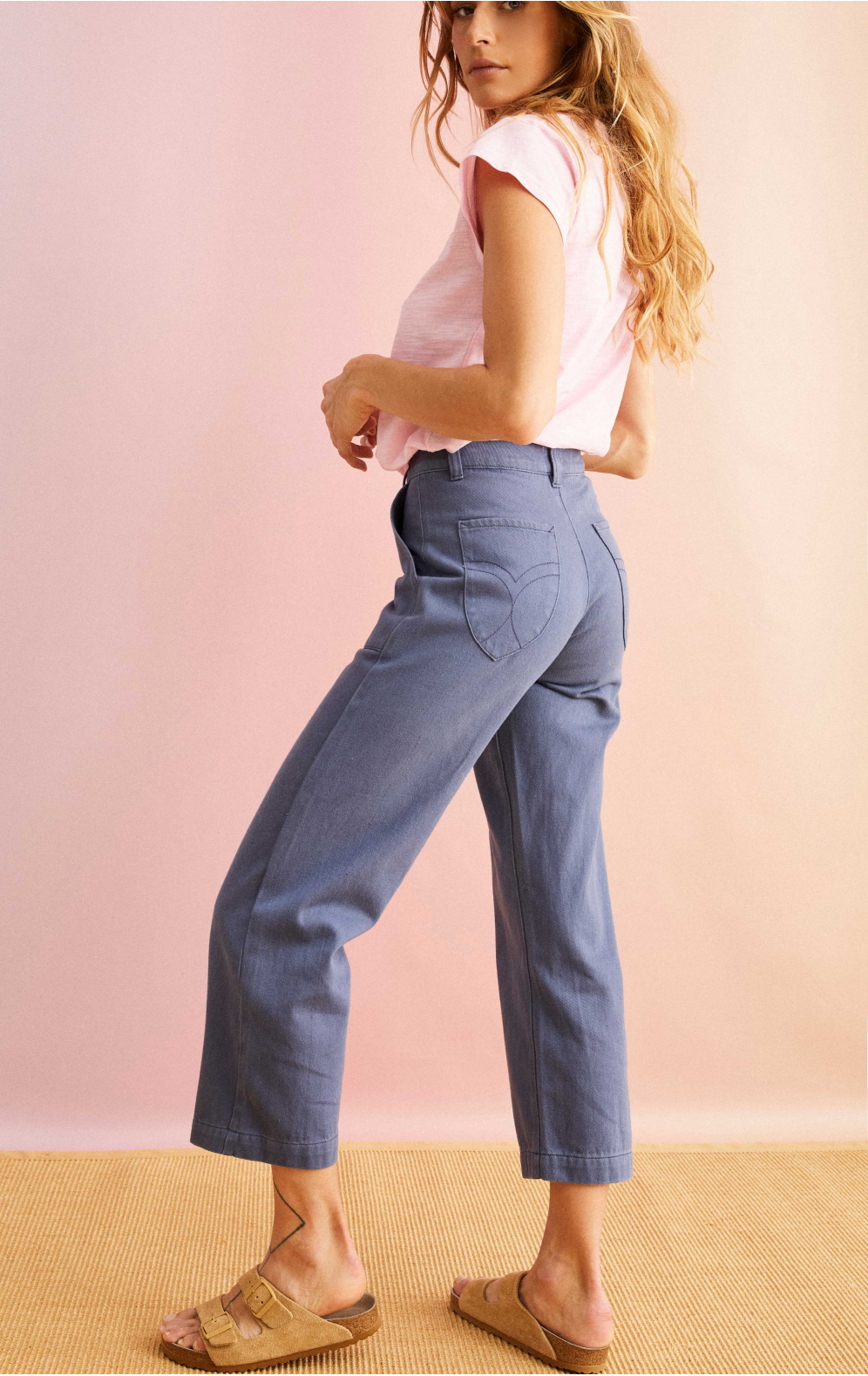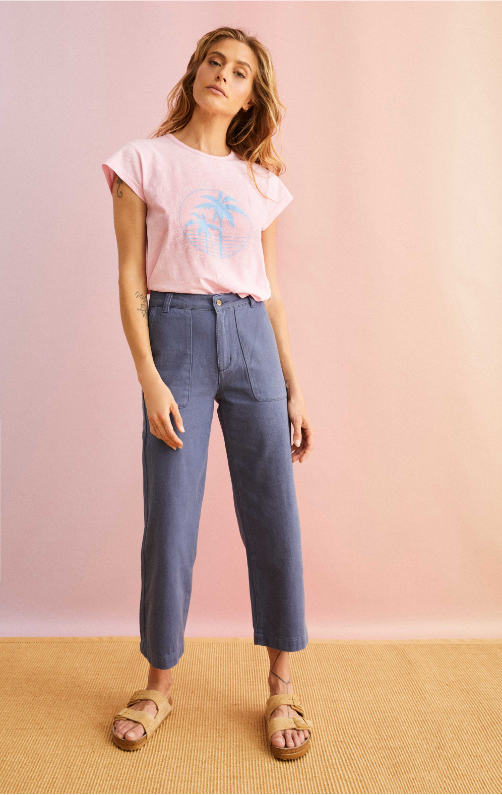 Pink crop-top T-shirt with American sleeves, featuring a sky-blue and white palm tree print.