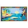 Our handmade scarves feature original designs designed to enhance your wardrobe. Here we present an illustration of a paradisiacal island landscape, featuring the sea, a sunset and a sky dotted with birds. Lush vegetation, palm trees and parrots. We love the cut-outs and the fantastic flat colors. A scarf like an invitation to travel, with idyllic destinations on the border: Tulum, Miami, Bora-Bora, Bali, Saint-Tropez....Sarong format.