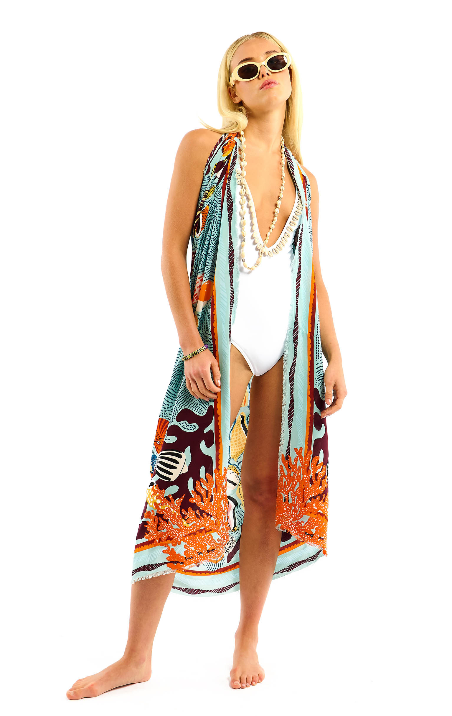 As the pieces unfold, an aquatic palette declines all shades of blue, from sunny turquoise to deep cobalt, like so many echoes of the waves, the changing reflections of water. Our star print features exotic shells, stylized coral and delicate marine details, a graphic treasure trove straight from the ocean floor. Light materials, flowing shapes and iodized accents transform each piece for a taste of the great outdoors. Under the Sea celebrates freedom and light, like a plunge into a summer dream.