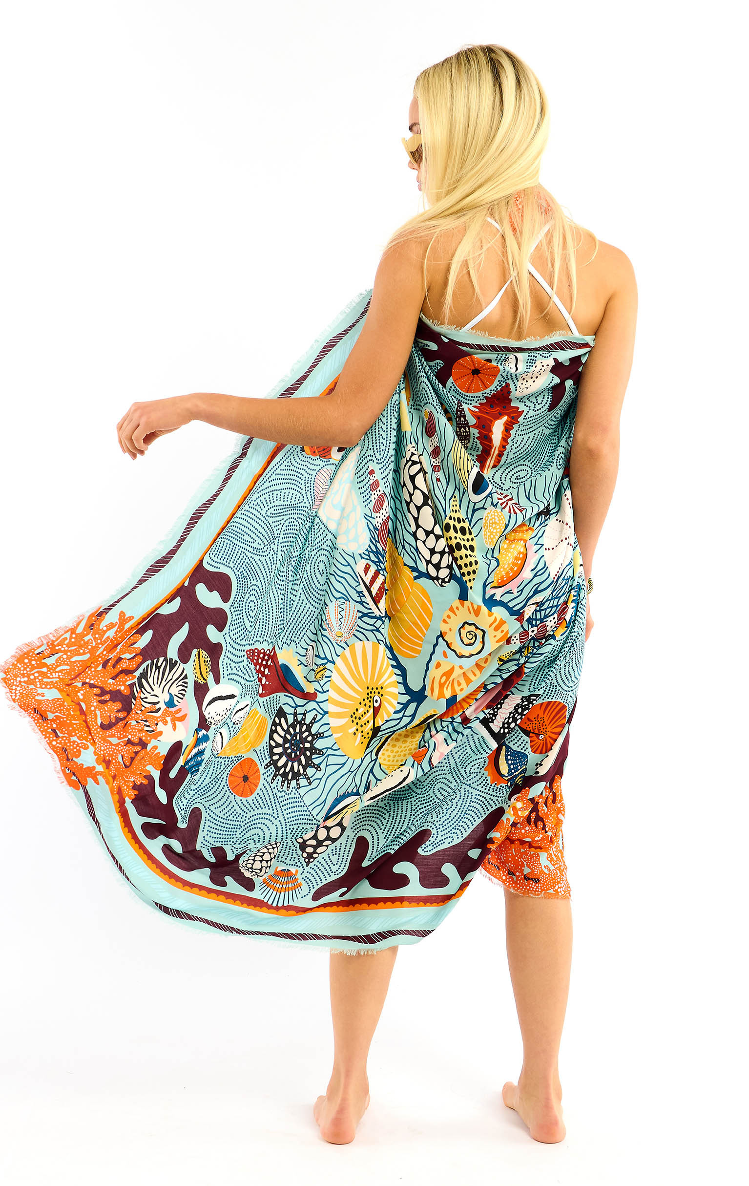 Our CORAL print is based on an essential Wild theme: the voyage and exploration of the seabed. In a nod to Hipanema's iconic cowrie shells, marine animals, corals and crustaceans mingle in a visual choreography of chocolate, ochre, orange, yellow and dark blue, set against a navy blue background for the blue version.