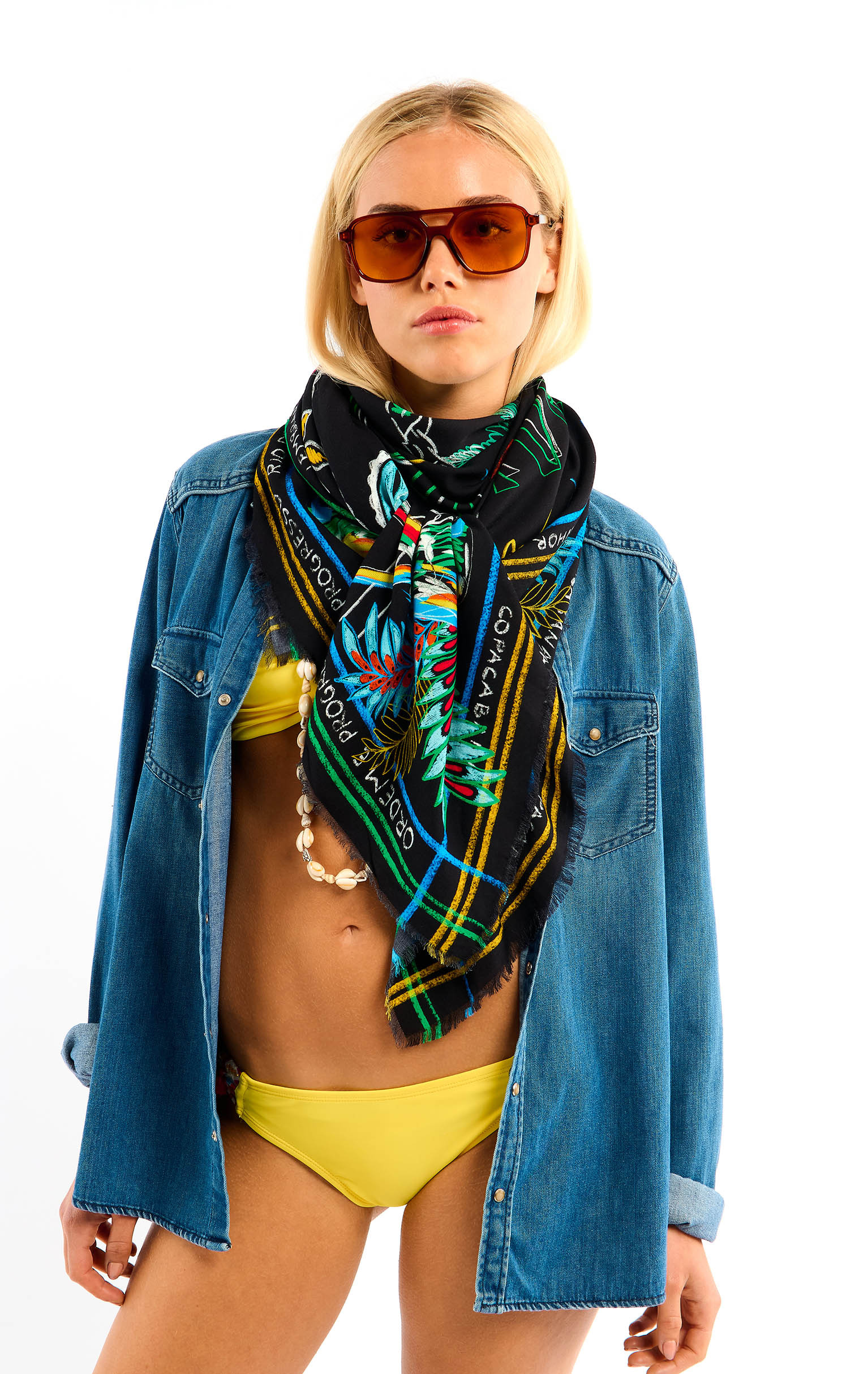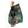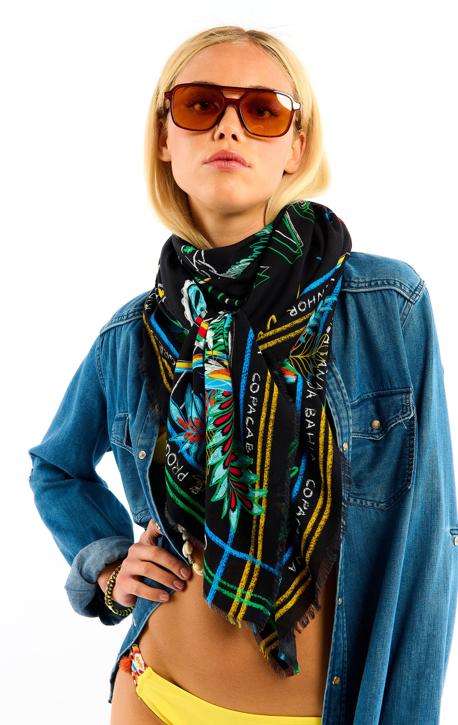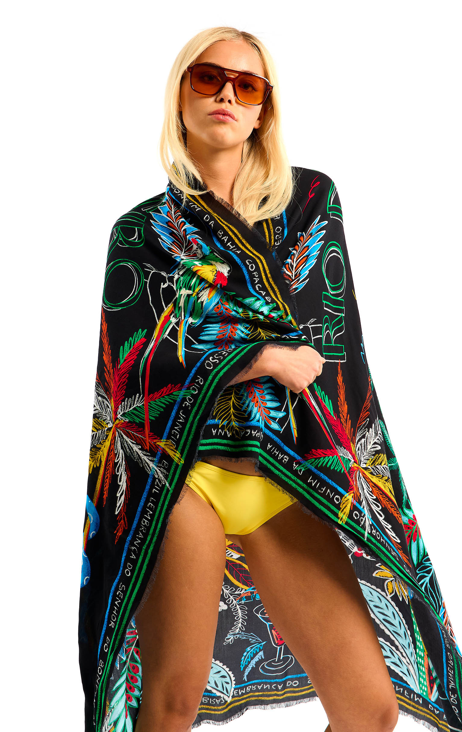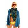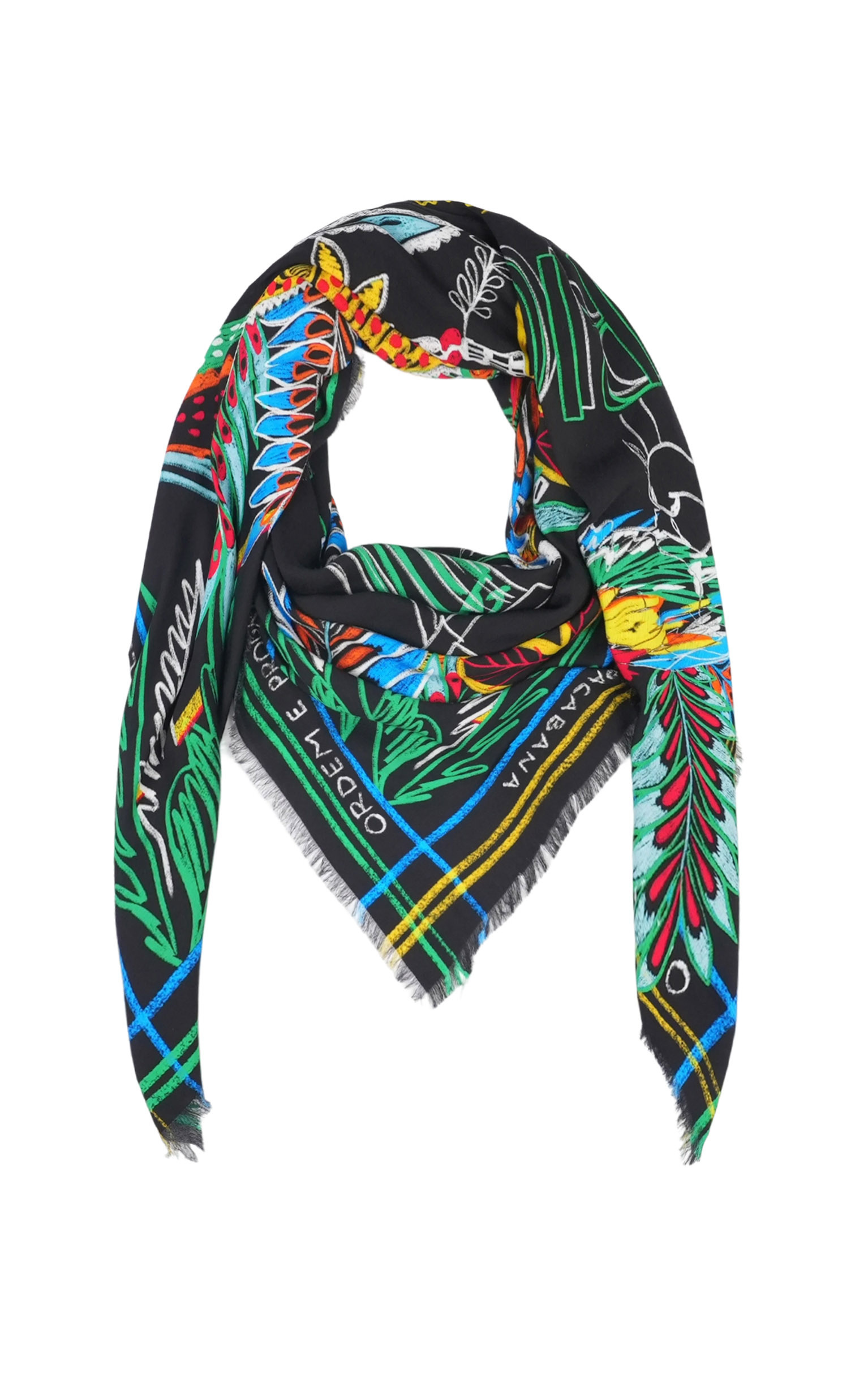 The emblematic symbol of Brazil, Christ the Redeemer from Mount Corcovado in Rio de Janeiro, adorns the center of the scarf with his protective aura, around which all Brazilian symbols are mirrored in a multicolored palette: palm trees, parrots, lush vegetation, the Brazilian flag and exotic animals. Words in Portuguese, scrawled by hand like whispers, border the scarf, proclaiming our passion for Brazil. Available in two colors, the BAHIA print is shown here in its black version.