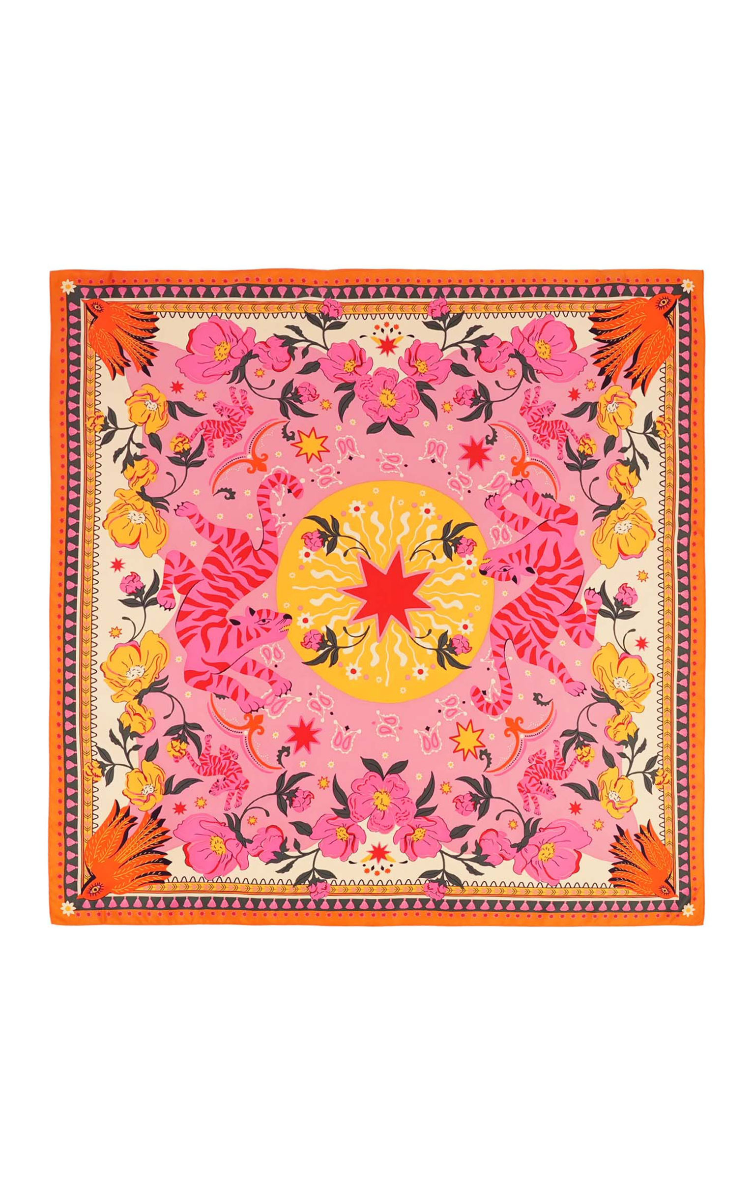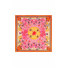 Articulated around a stylized star, the BANDIDAS print takes classic bandana codes - such as the paisley motif - and reinvents them by blending a docile, colorful tiger, summery flowers and elements of Mexican aesthetics. The result: a girly version with multiple, far-flung influences. Available in three colors, it's here in its pink version with shades of yellow, orange, pink, fuchsia, white and red.