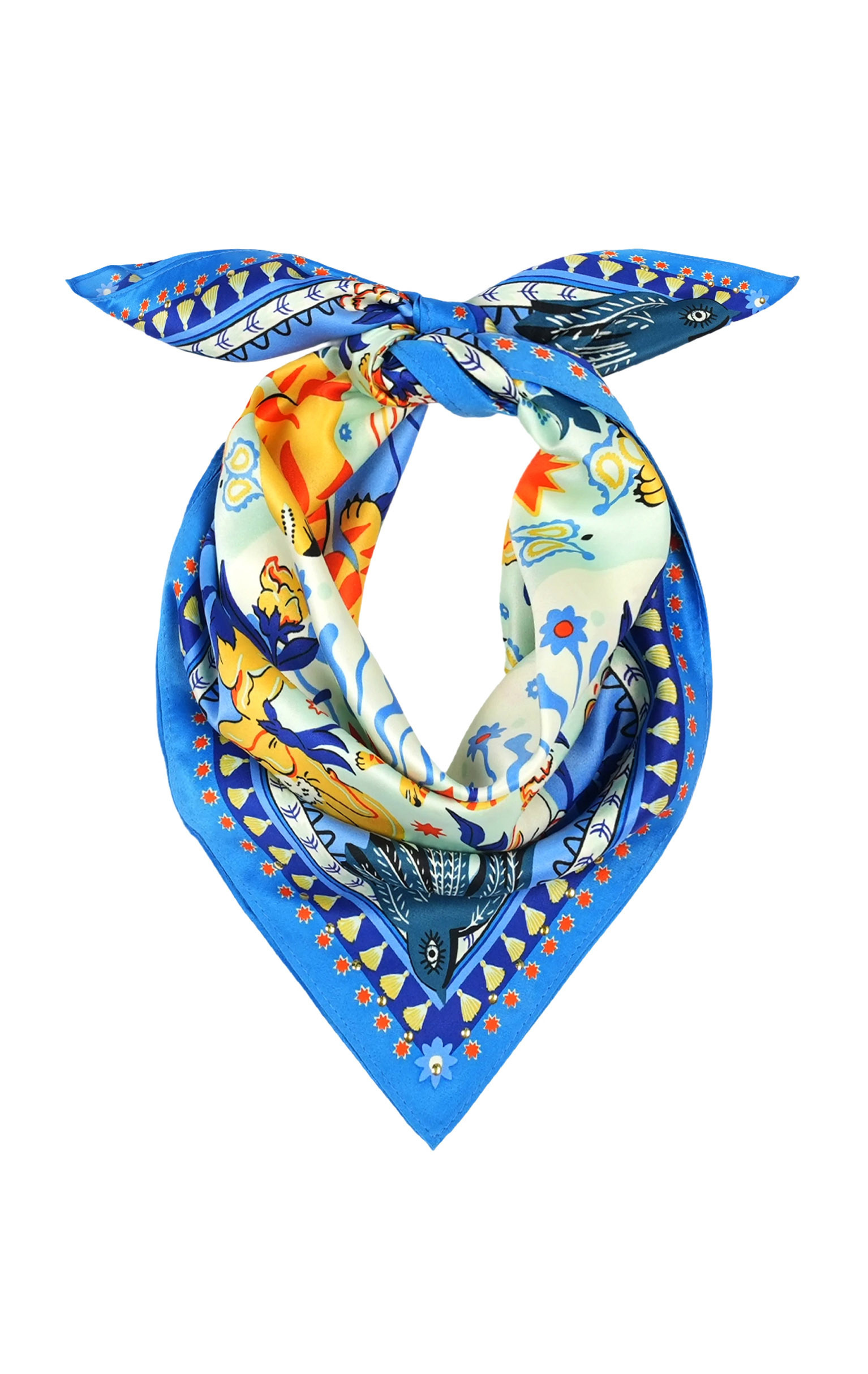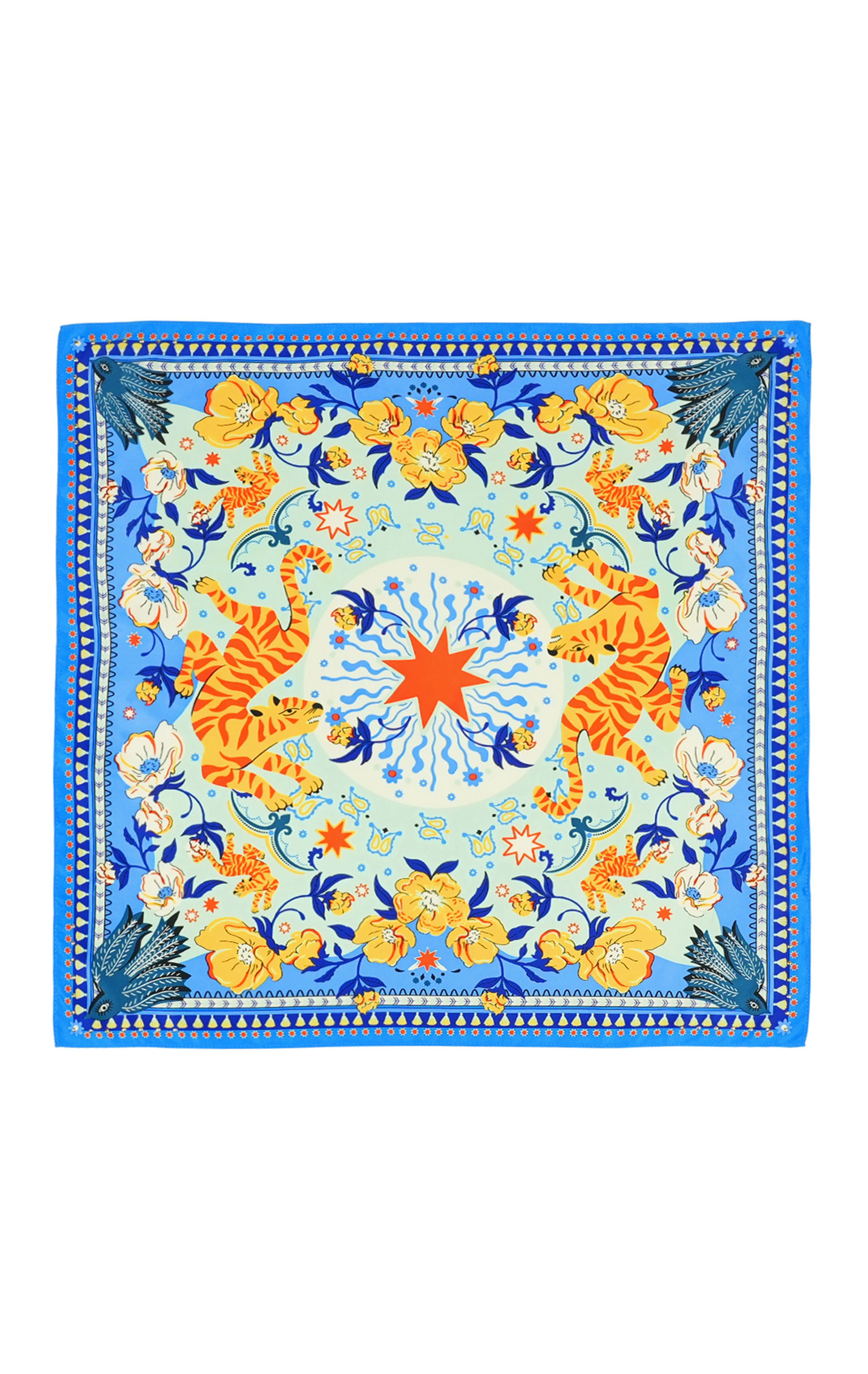 Articulated around a stylized star, the BANDIDAS print takes classic bandana codes - such as the paisley motif - and reinvents them by blending a docile, colorful tiger, summery flowers and elements of Mexican aesthetics. The result: a girly version with multiple, far-flung influences. Available in three colors, it's here in its blue version with shades of yellow, orange, coral, cyan blue, midnight blue, white and red.