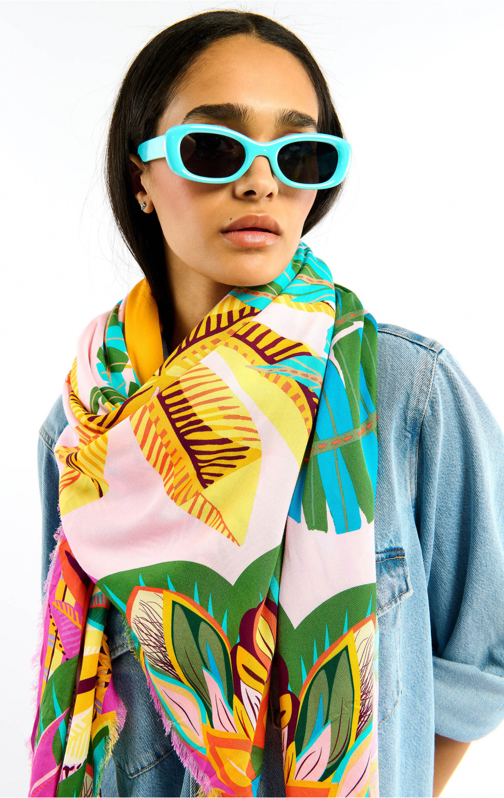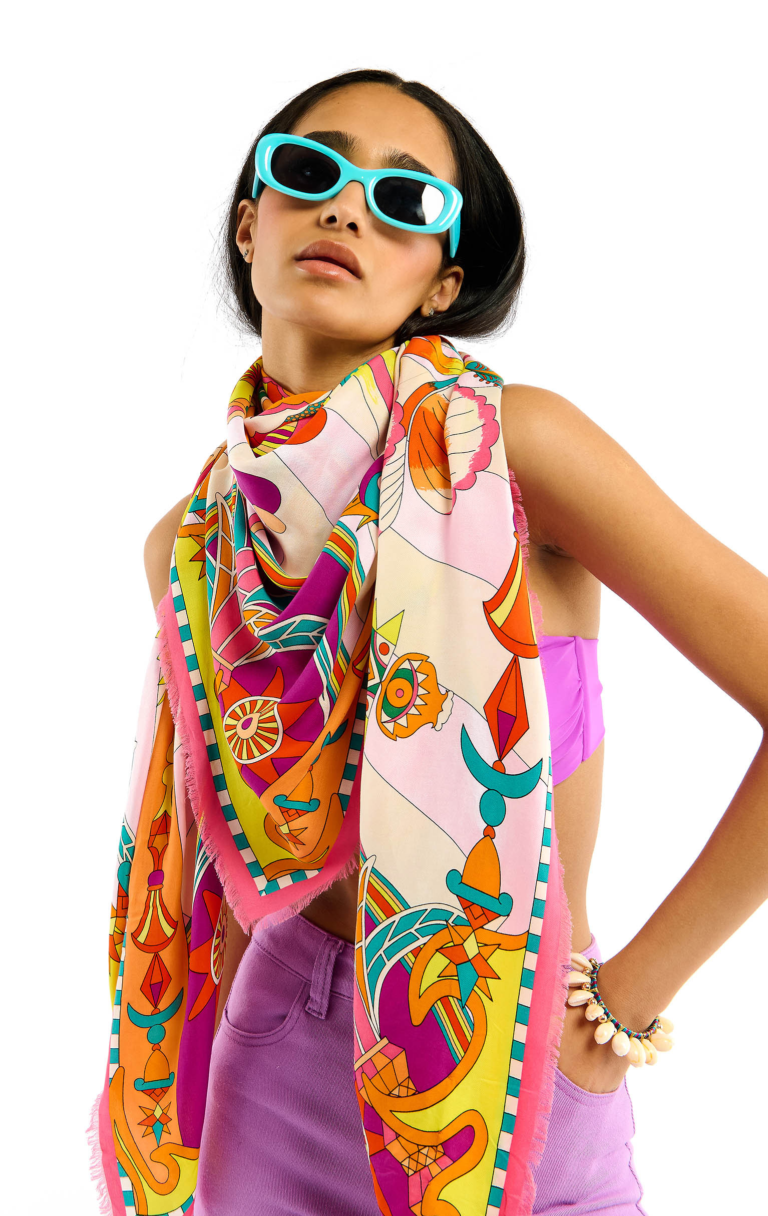Bathed in a phantasmagorical, hallucinogenic universe, ENCHANTERED is adorned at its center with a pentacle-like eye, around which four suns with doll-like faces take shape. In the same vein, the rest of the scarf tells the story of a world apart, on the border between the unconscious and an unbridled, colorful imagination, against a backdrop of broad stripes borrowed from 70s aesthetics. Available in two colors, ENCHANTERED is here in its pink version and is revealed in shades of turquoise, yellow, orange, mauve, pink, violet, carmine red and sky blue.