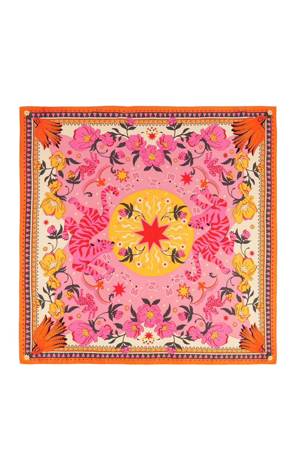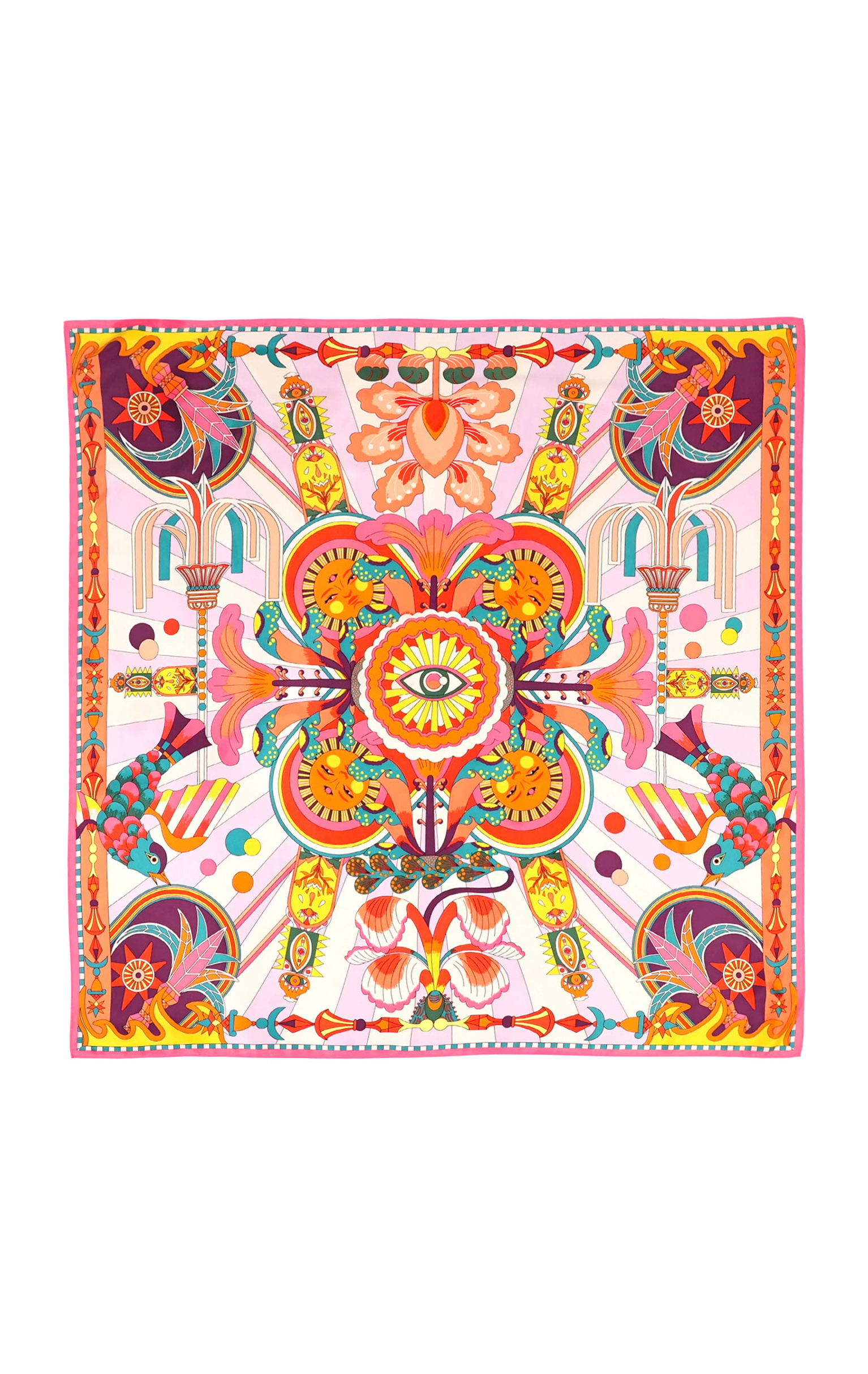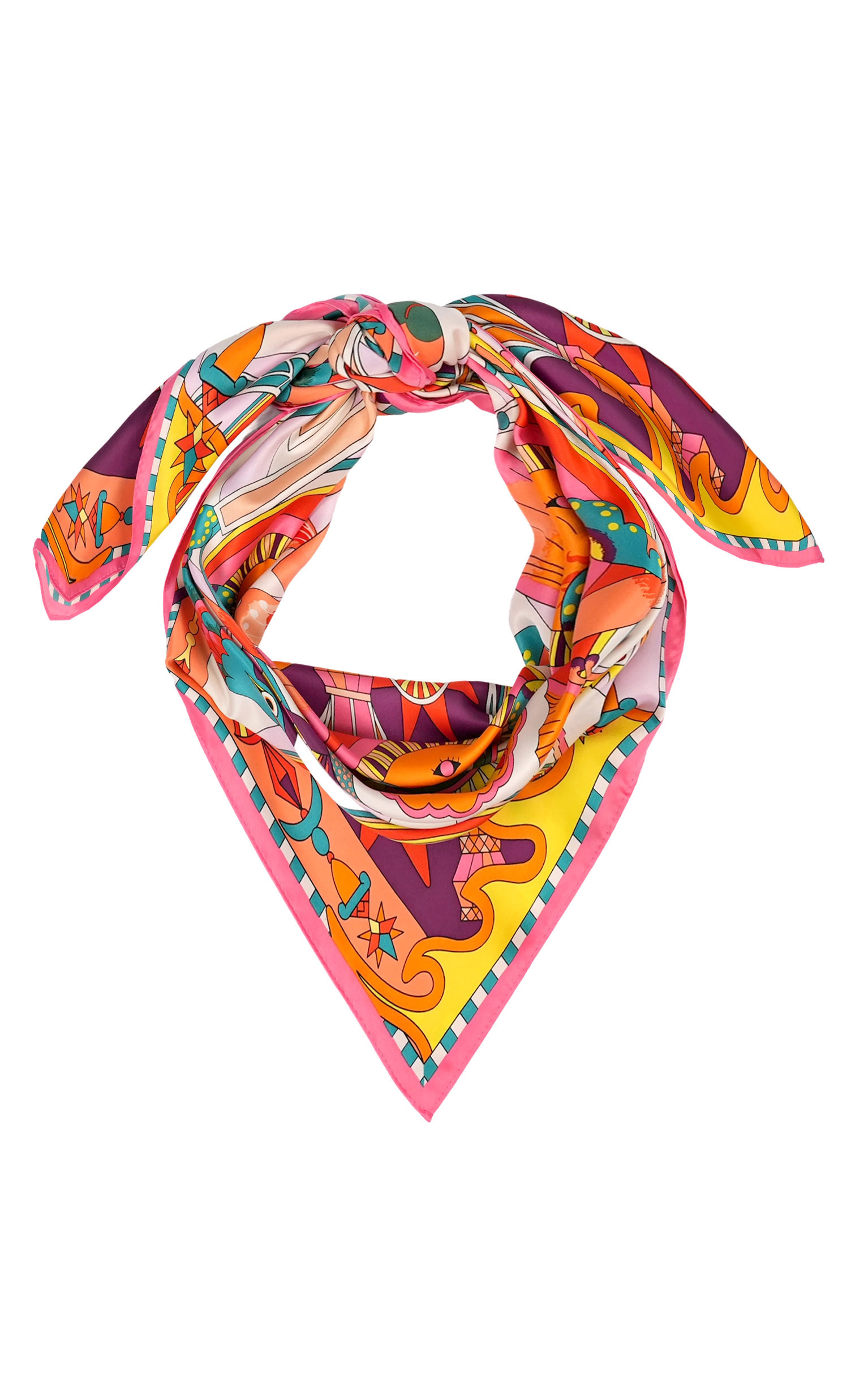 Bathed in a phantasmagorical, hallucinogenic universe, ENCHANTERED is adorned at its center with a pentacle-like eye, around which four suns with doll-like faces take shape. In the same vein, the rest of the scarf tells the story of a world apart, on the border between the unconscious and an unbridled, colorful imagination, against a backdrop of broad stripes borrowed from 70s aesthetics. Available in two colors, ENCHANTERED is here in its pink version and is revealed in shades of turquoise, yellow, orange, mauve, pink, violet, carmine red and sky blue.
