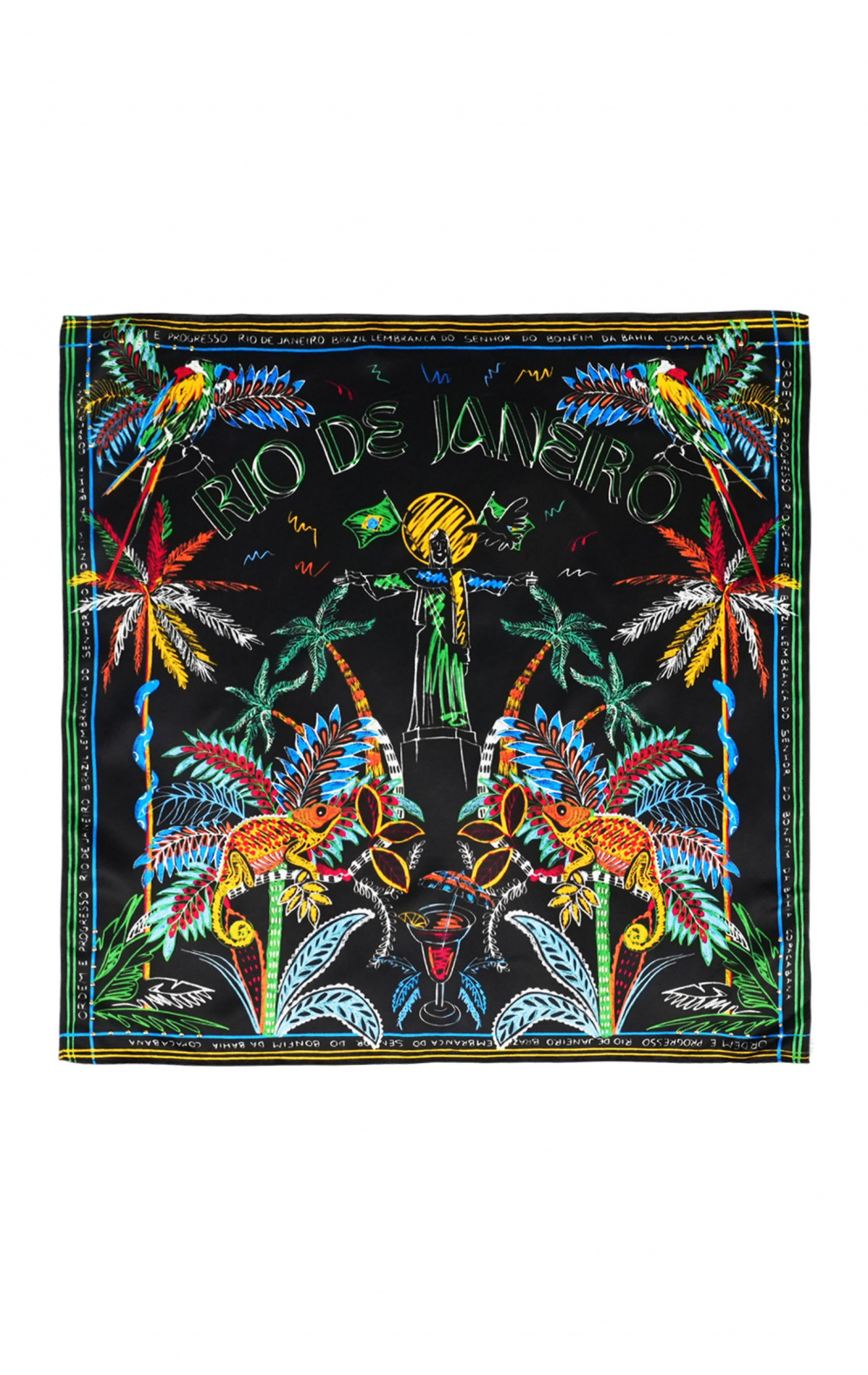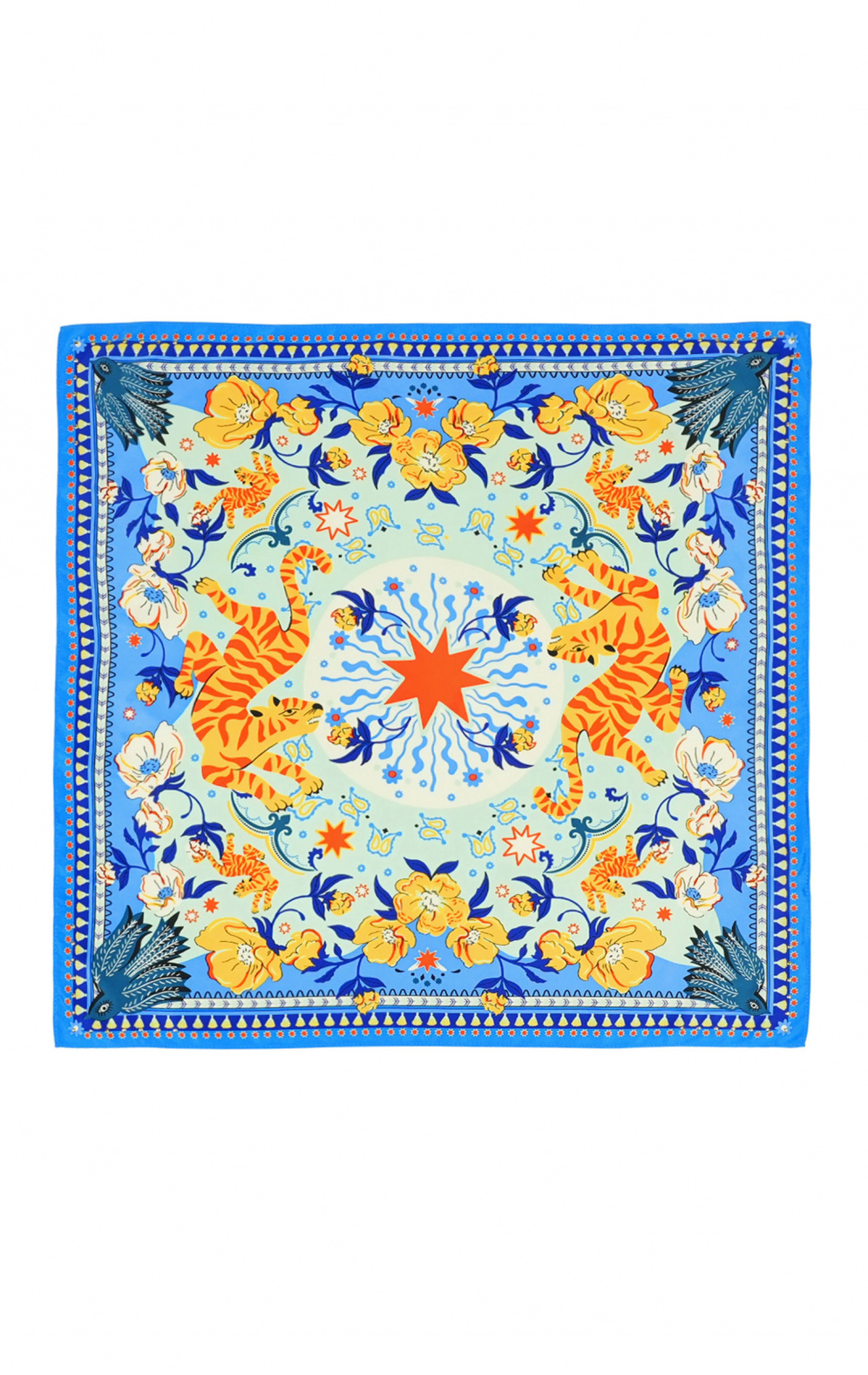 Bathed in a phantasmagorical, hallucinogenic universe, ENCHANTERED is adorned at its center with a pentacle-like eye, around which four suns with doll-like faces take shape. In the same vein, the rest of the scarf tells the story of a world apart, on the border between the unconscious and an unbridled, colorful imagination, against a backdrop of broad stripes borrowed from 70s aesthetics. Available in two colors, ENCHANTERED is shown here in its blue version, in coral orange, fuchsia pink, turquoise, yellow, parma, indigo and prairie green.