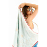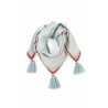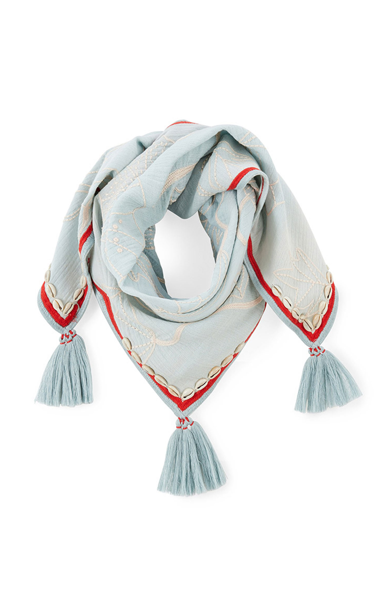 Square in shape and made from blue cotton gauze embroidered with white poppies and stylized poppies, the EUNICE scarf is enhanced by a red edging all around, our iconic cowries embroidered on each corner and large, generous tassels. A perfect accessory to complete a denim outfit.